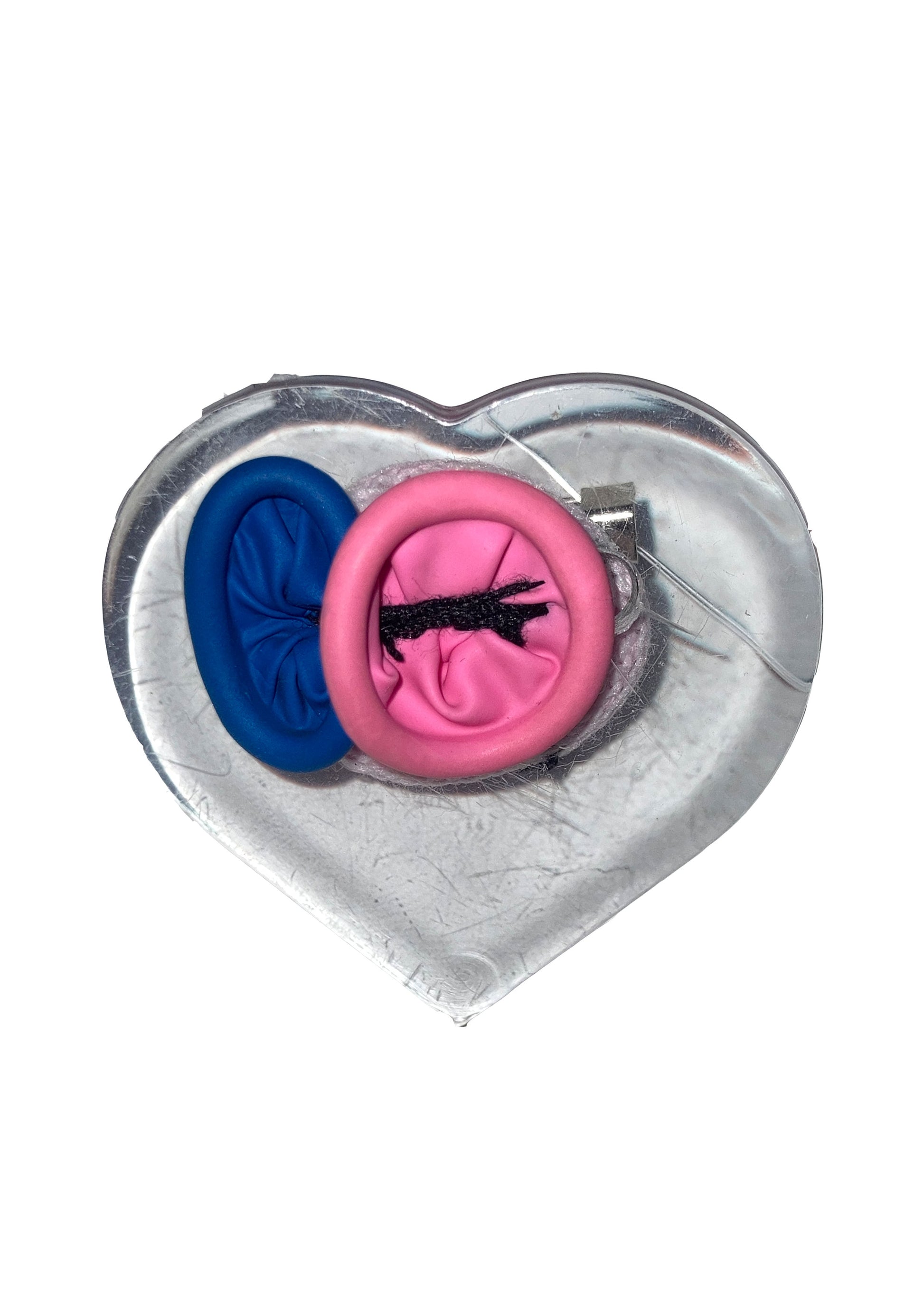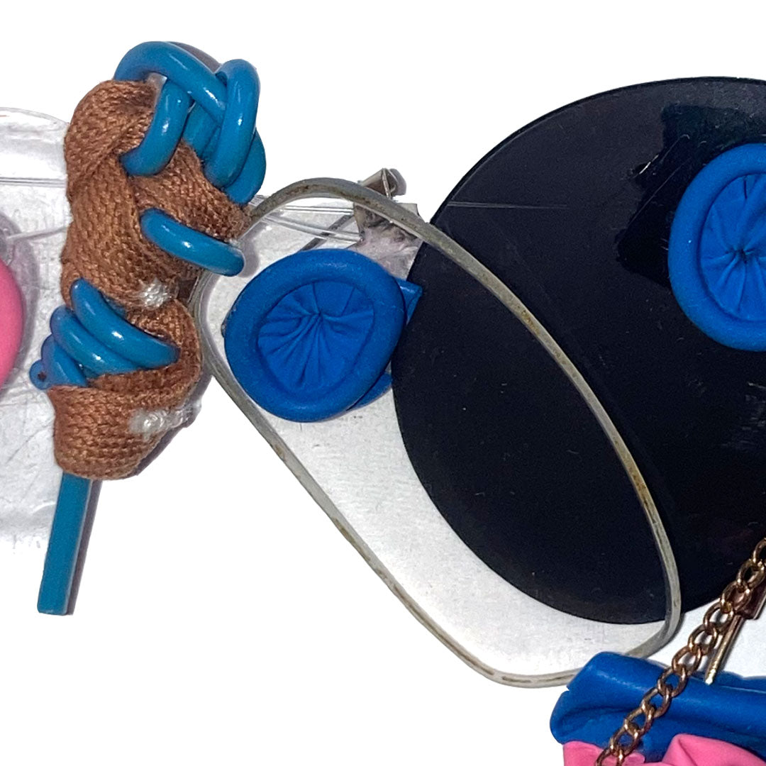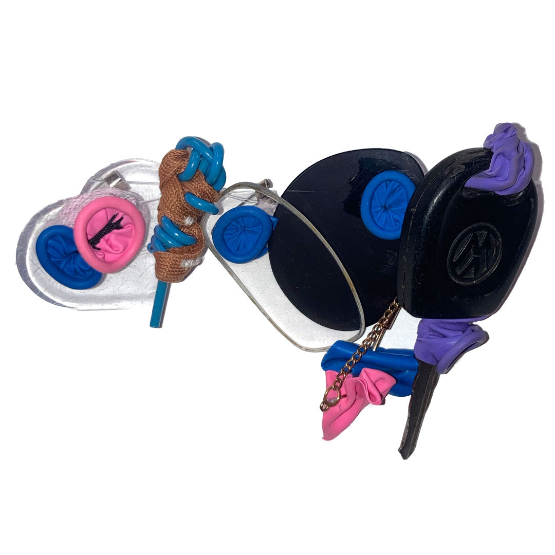 Materials include car keys, balloons, electronic waste and glasses lenses. All brooches have a metal brooch pin attached to the back.