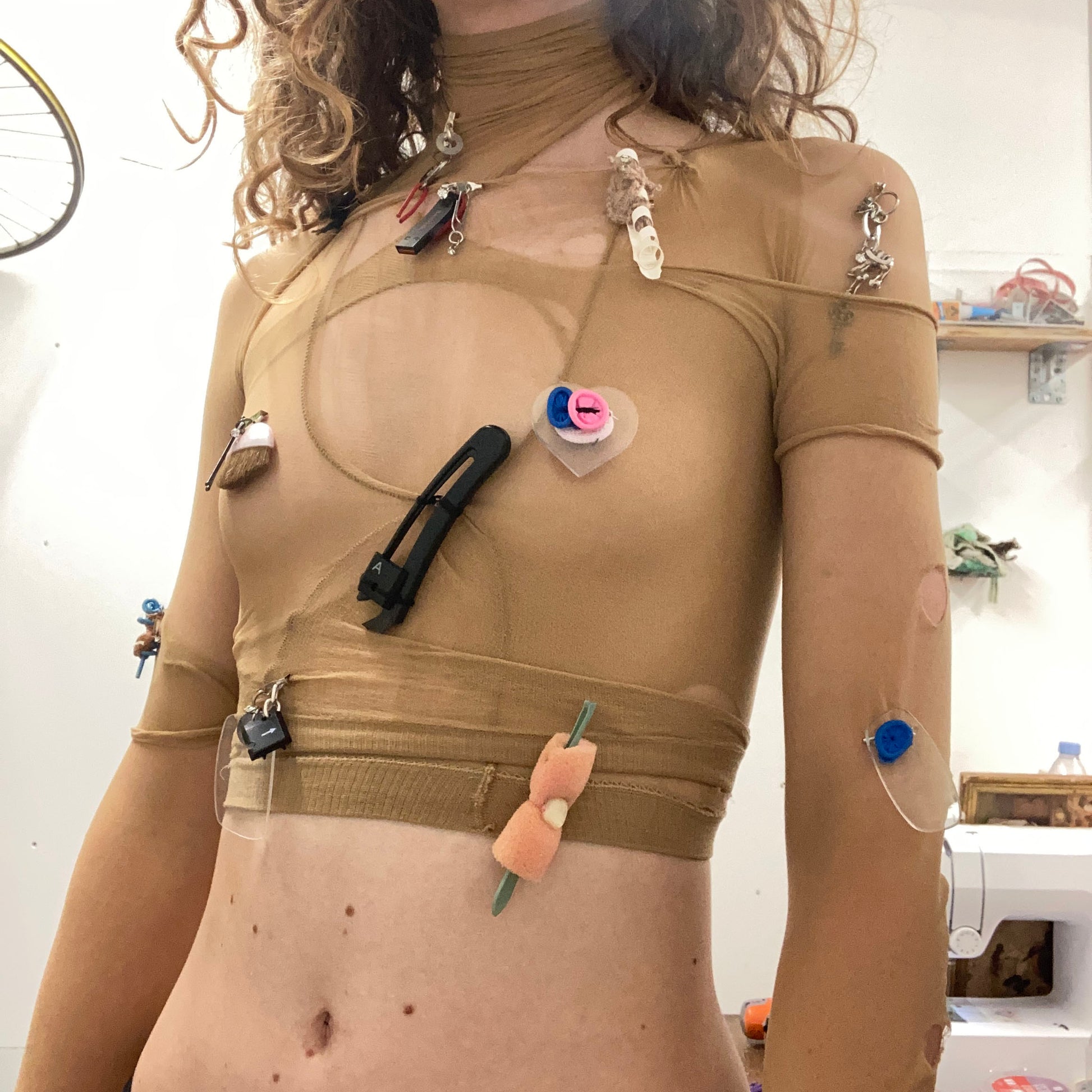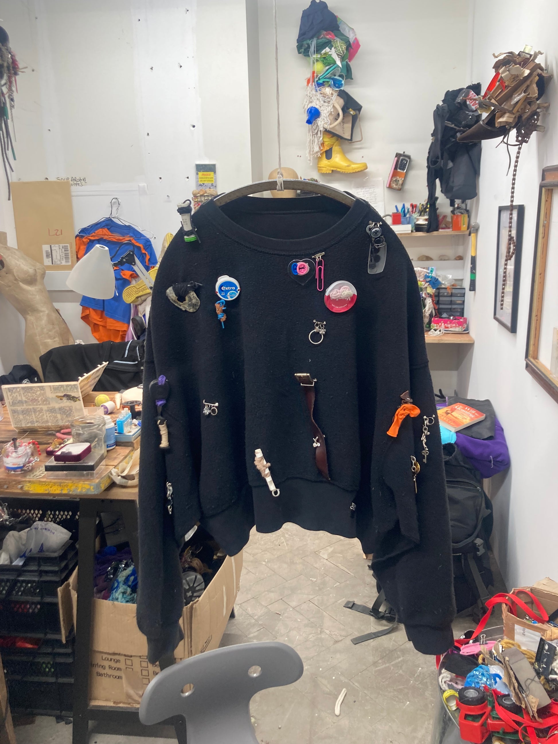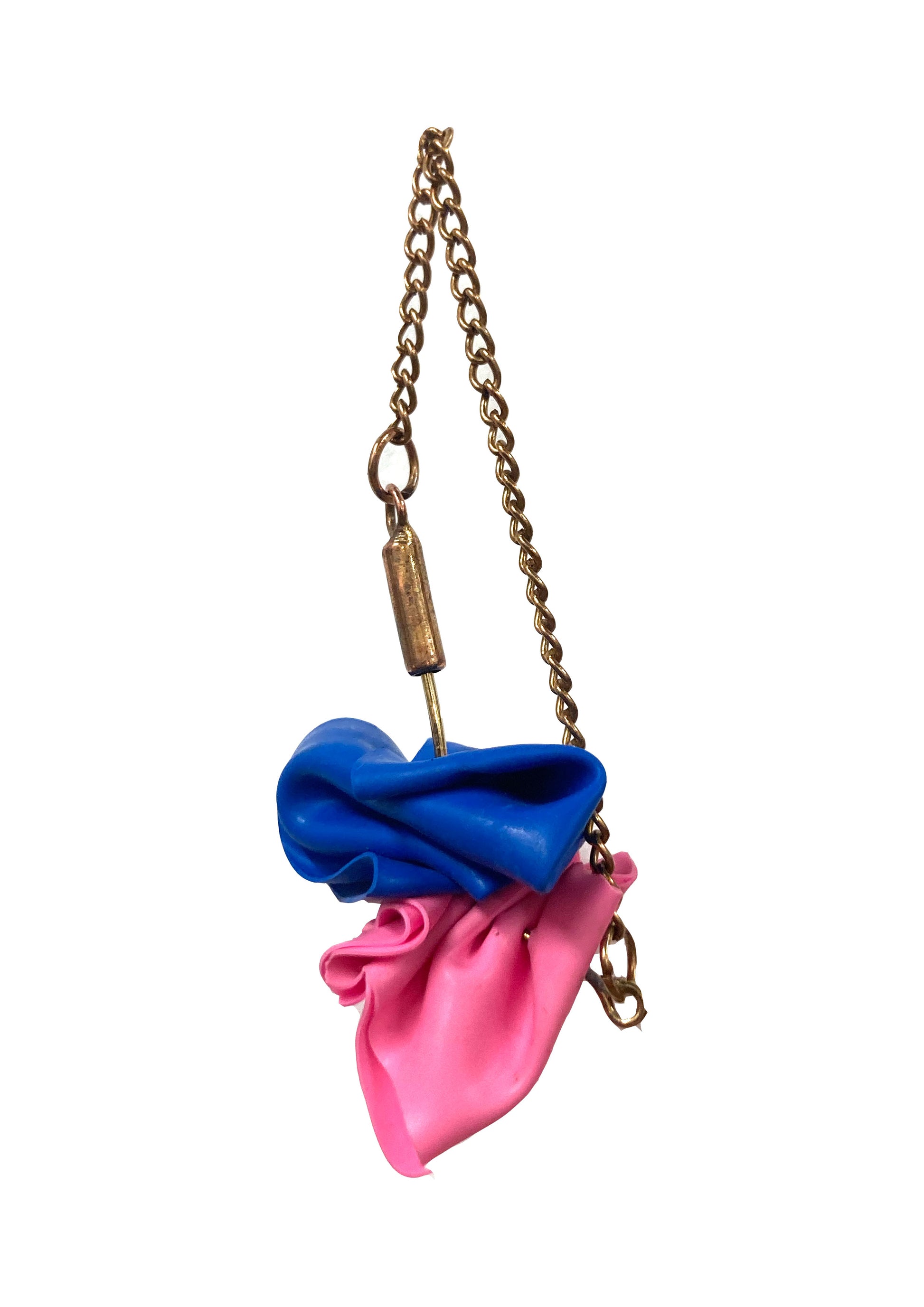 Materials include car keys, balloons, electronic waste and glasses lenses. All brooches have a metal brooch pin attached to the back.