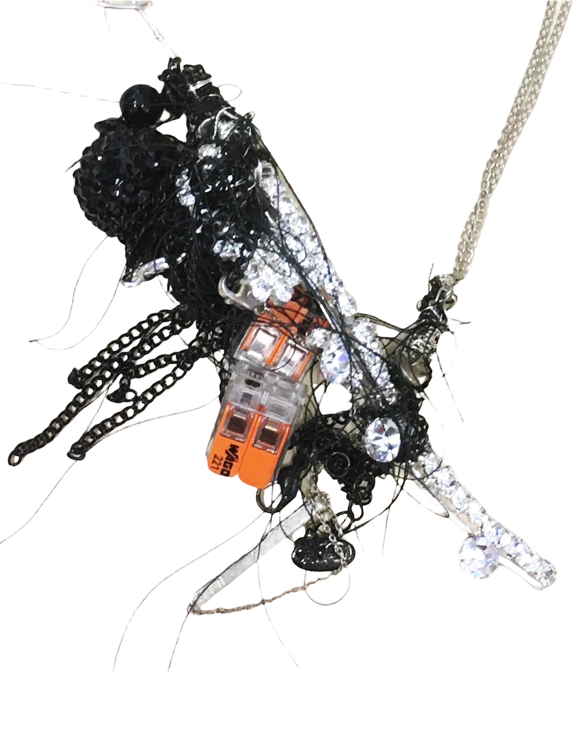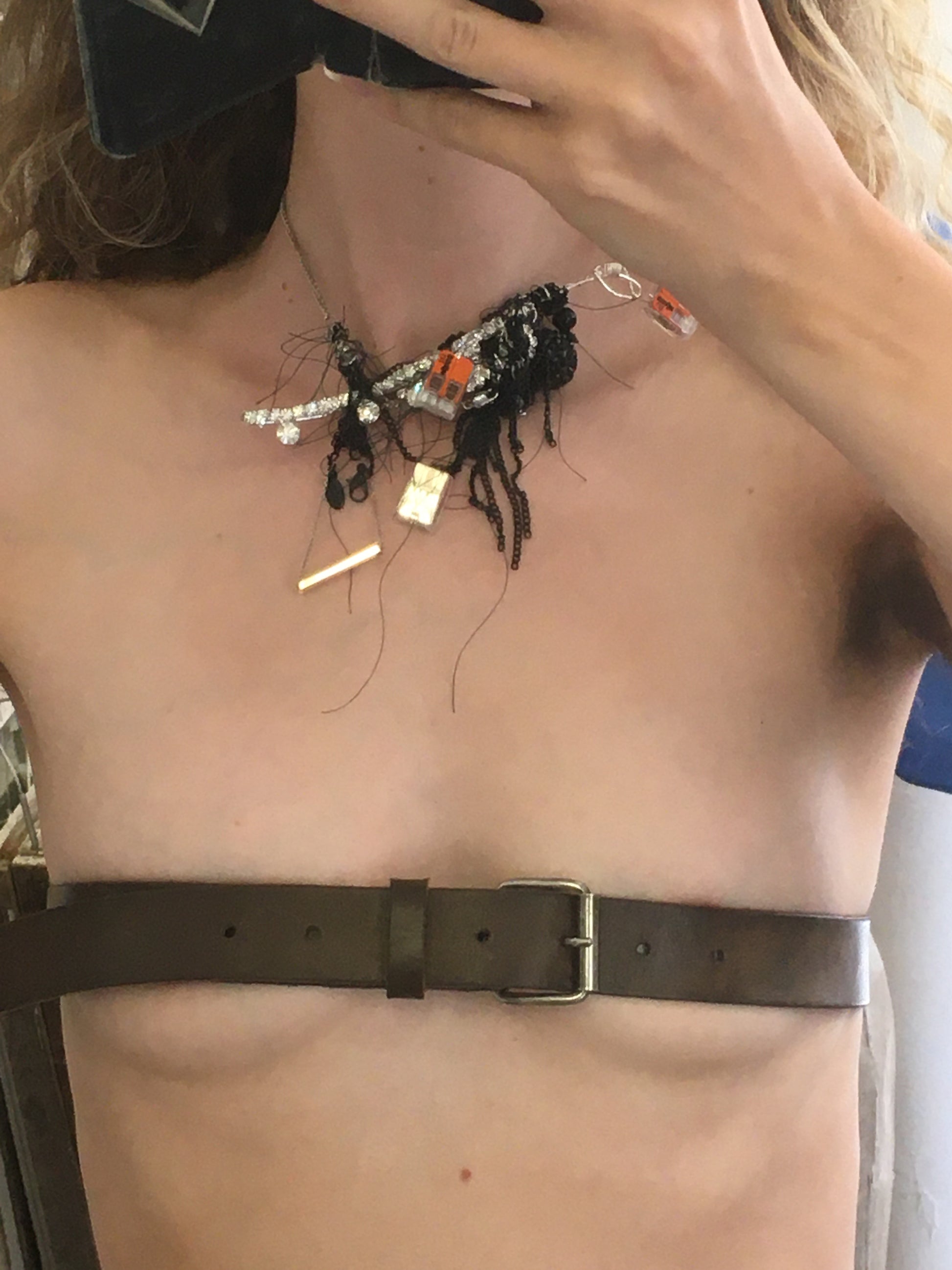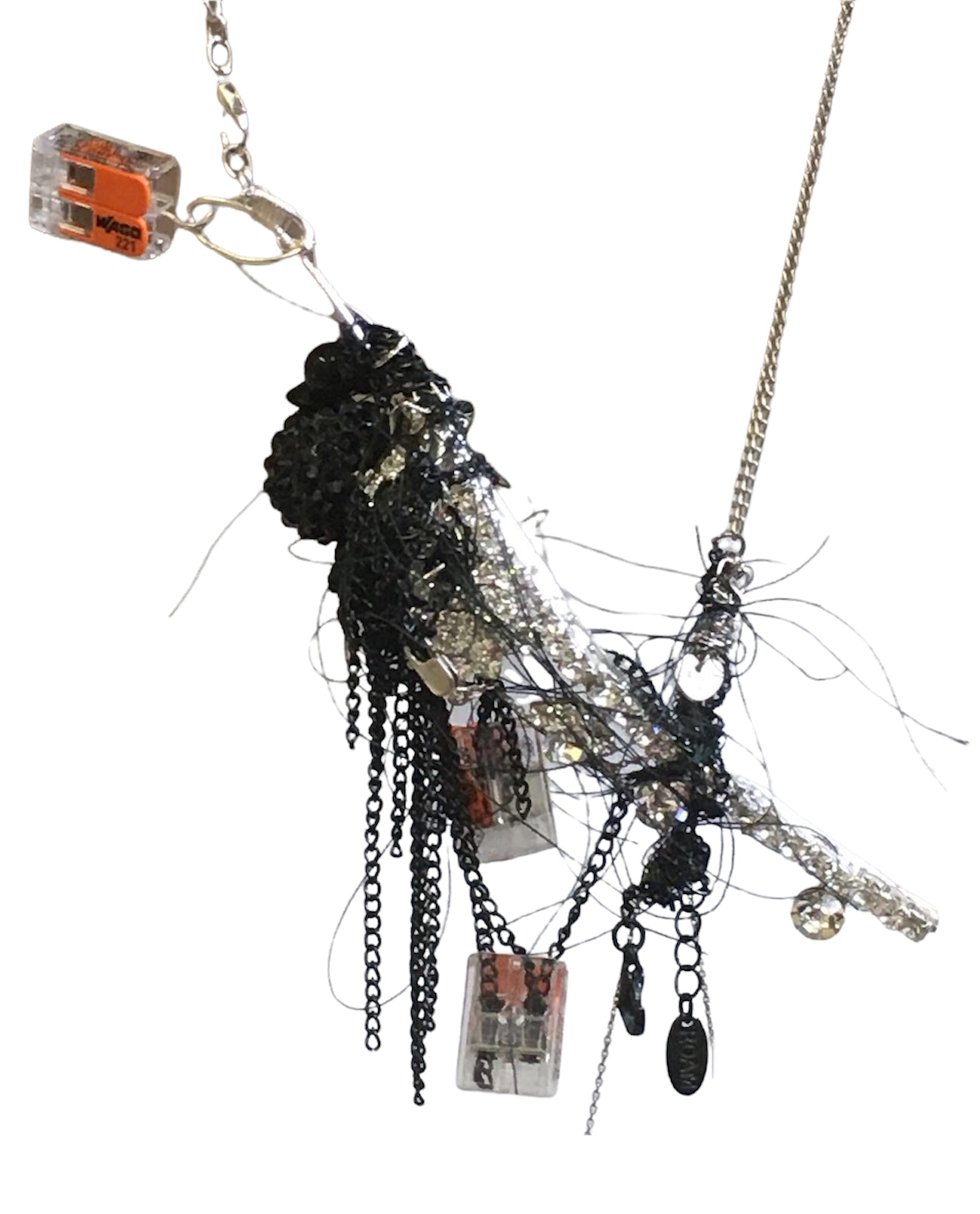 Necklaces re-upcycled in The Sarabande Studios, London. Materials include broken tiara, broken up cycled jewellery, up cycled chain.
