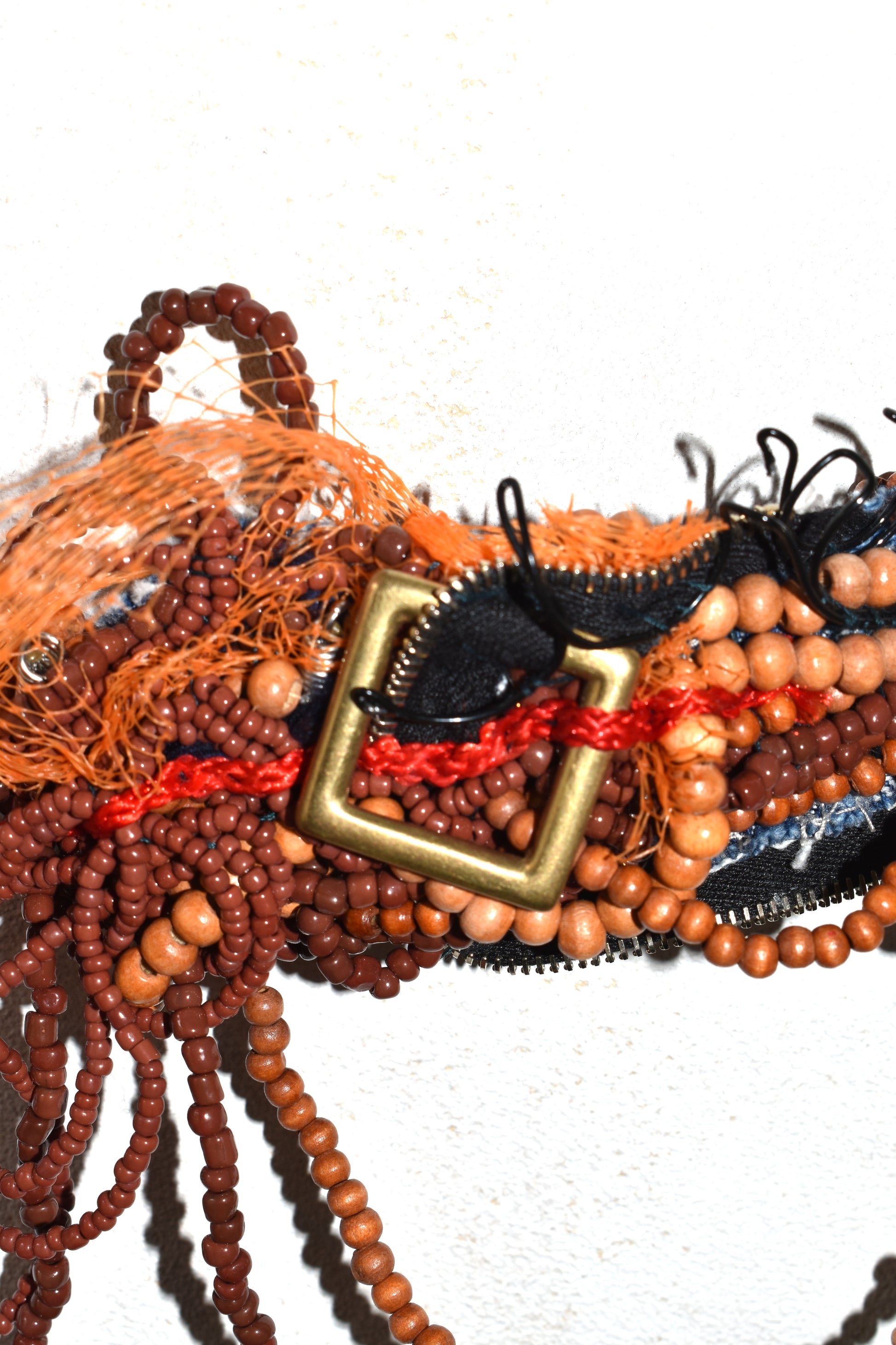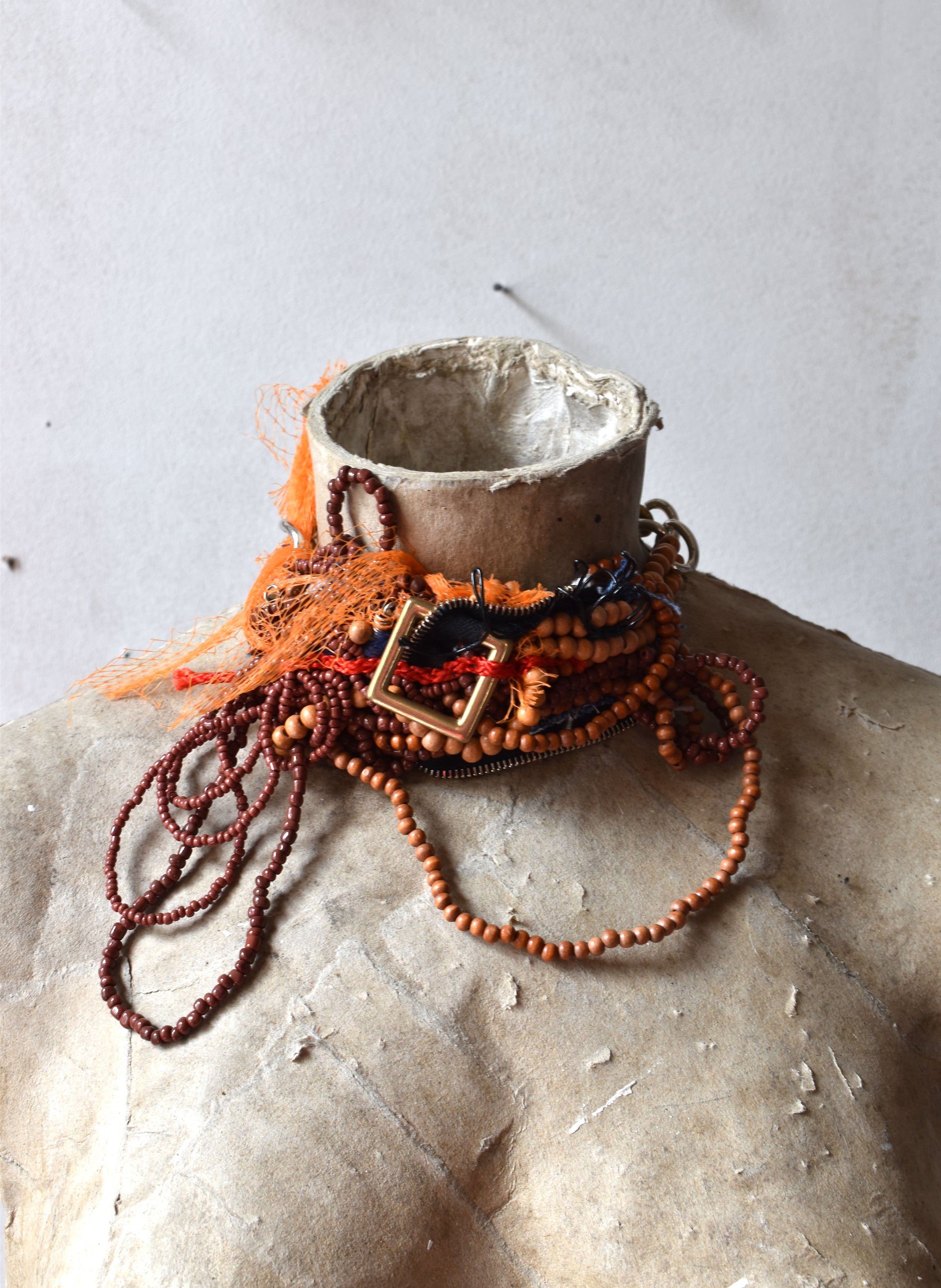 Upcycled wooden beaded necklace, belt buckle, curtain rings, chain links, fruit packaging