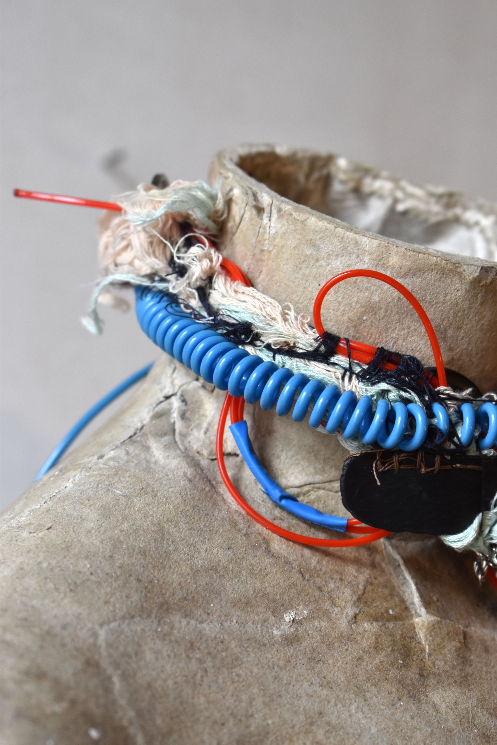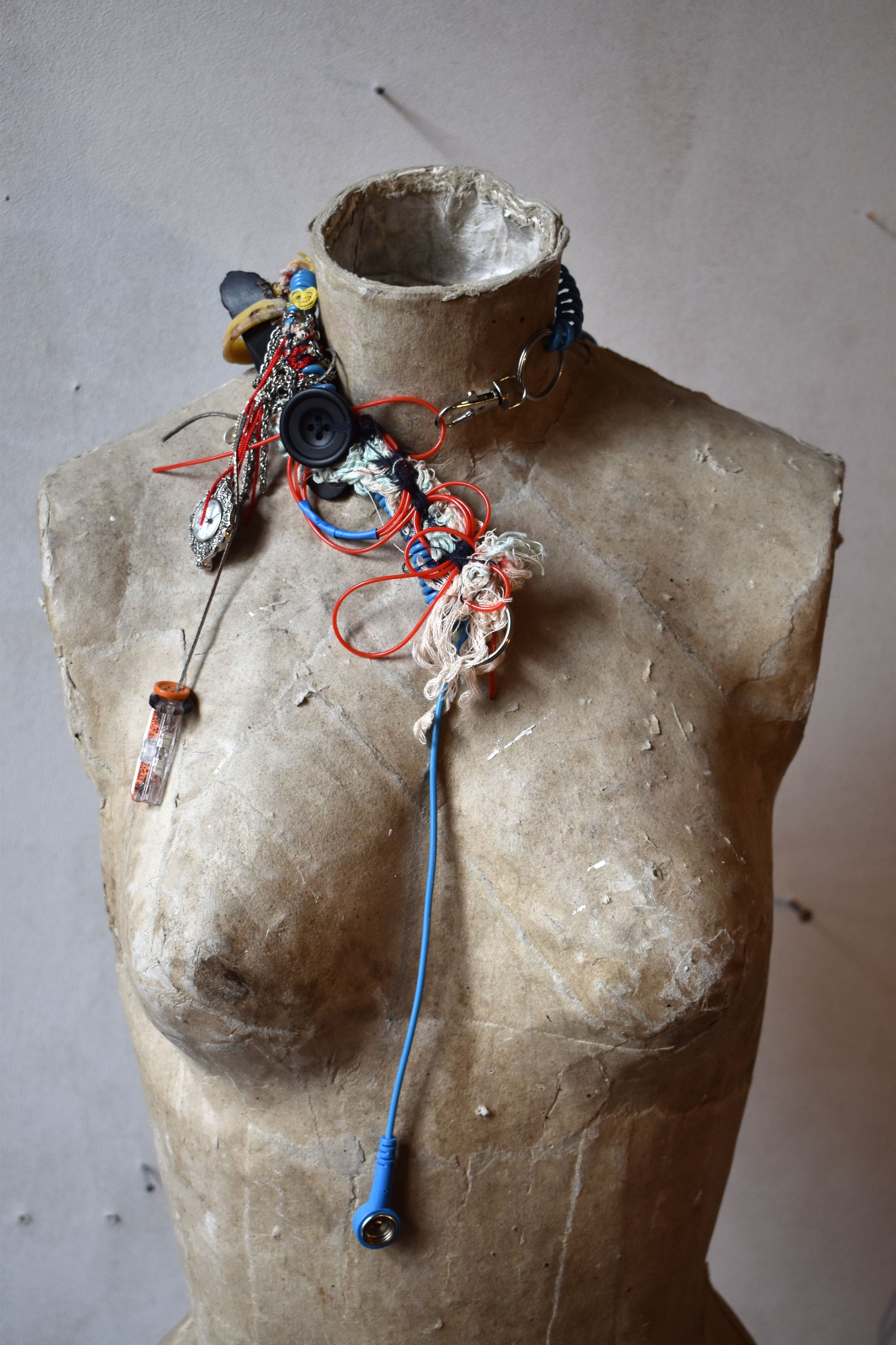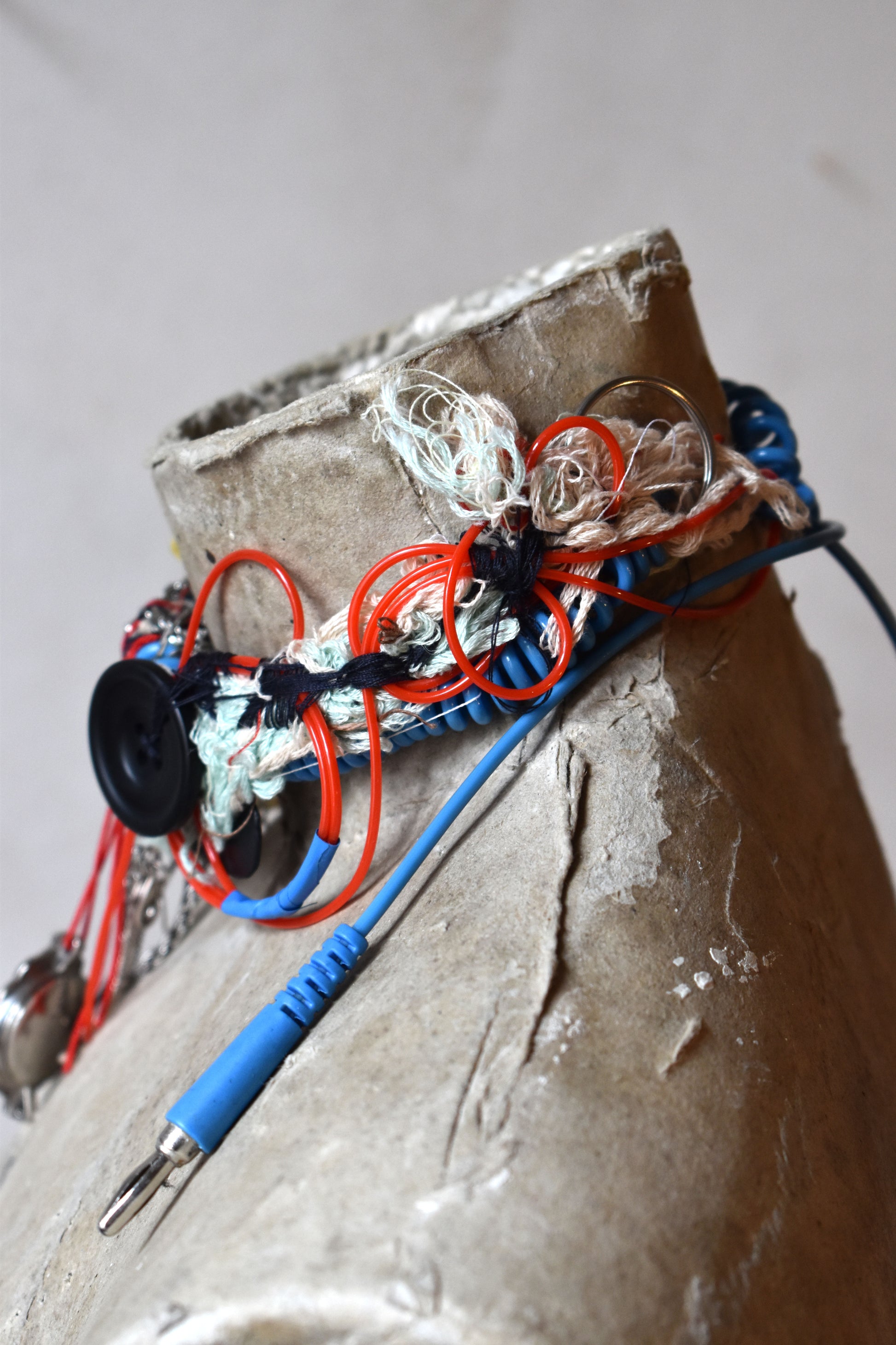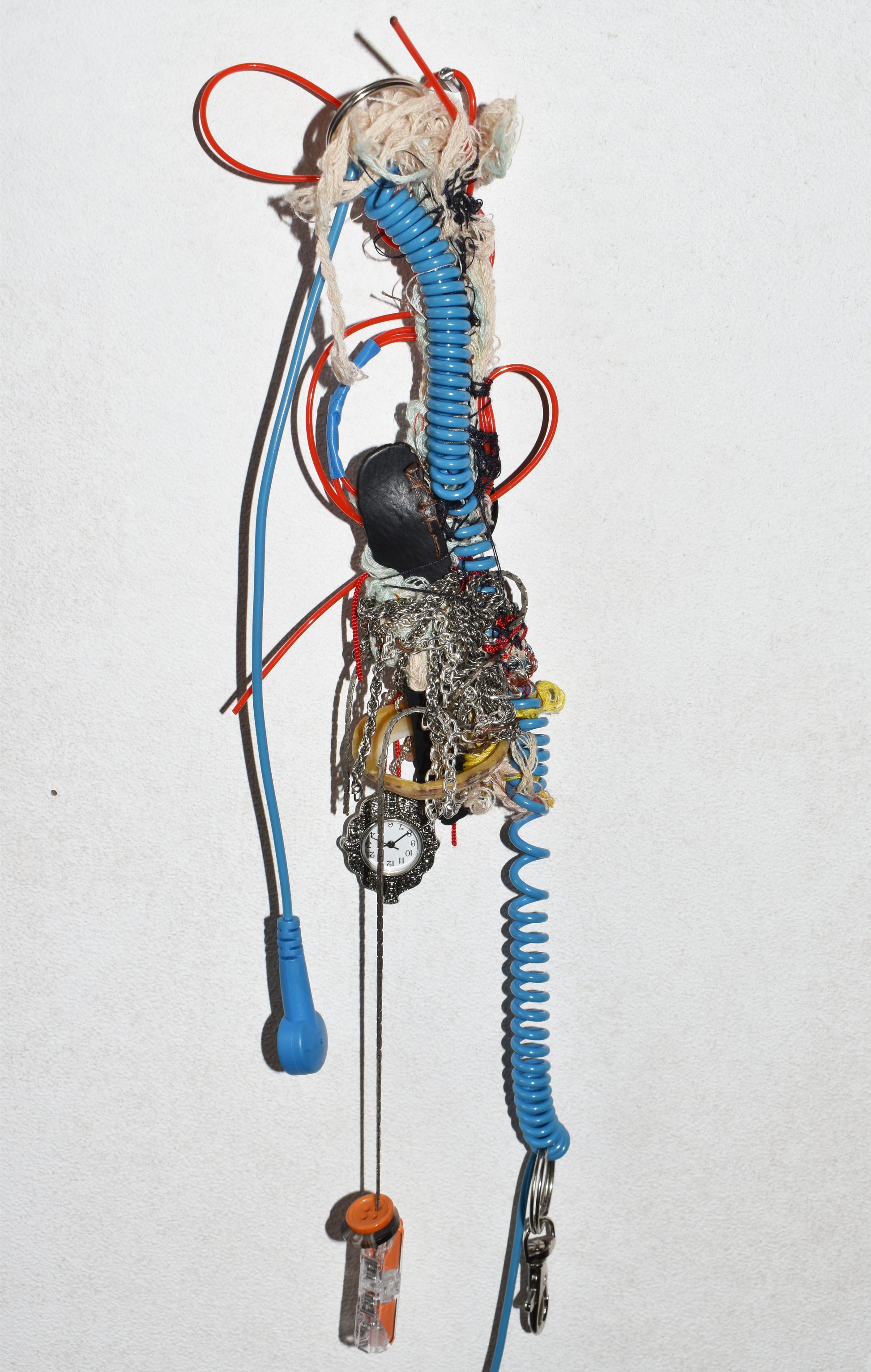 Phone cord, Scooby doo wire, embroidery thread, shell, button, leather, jewellery