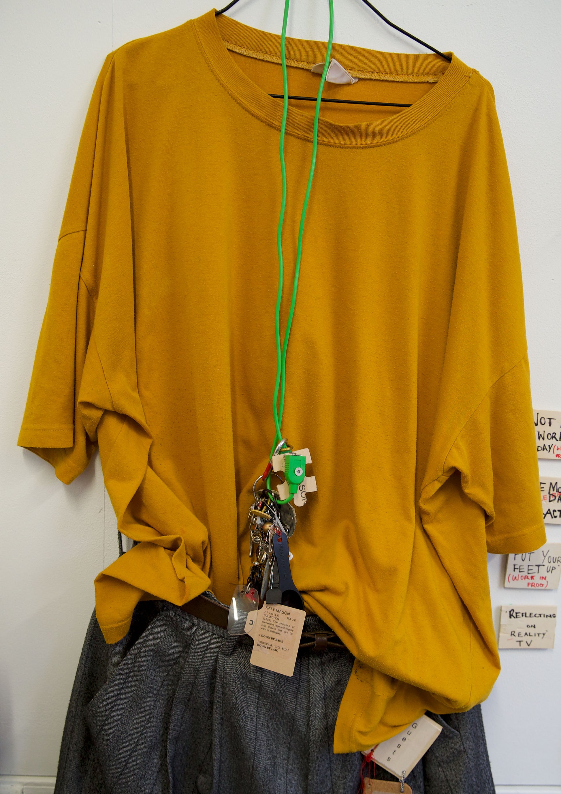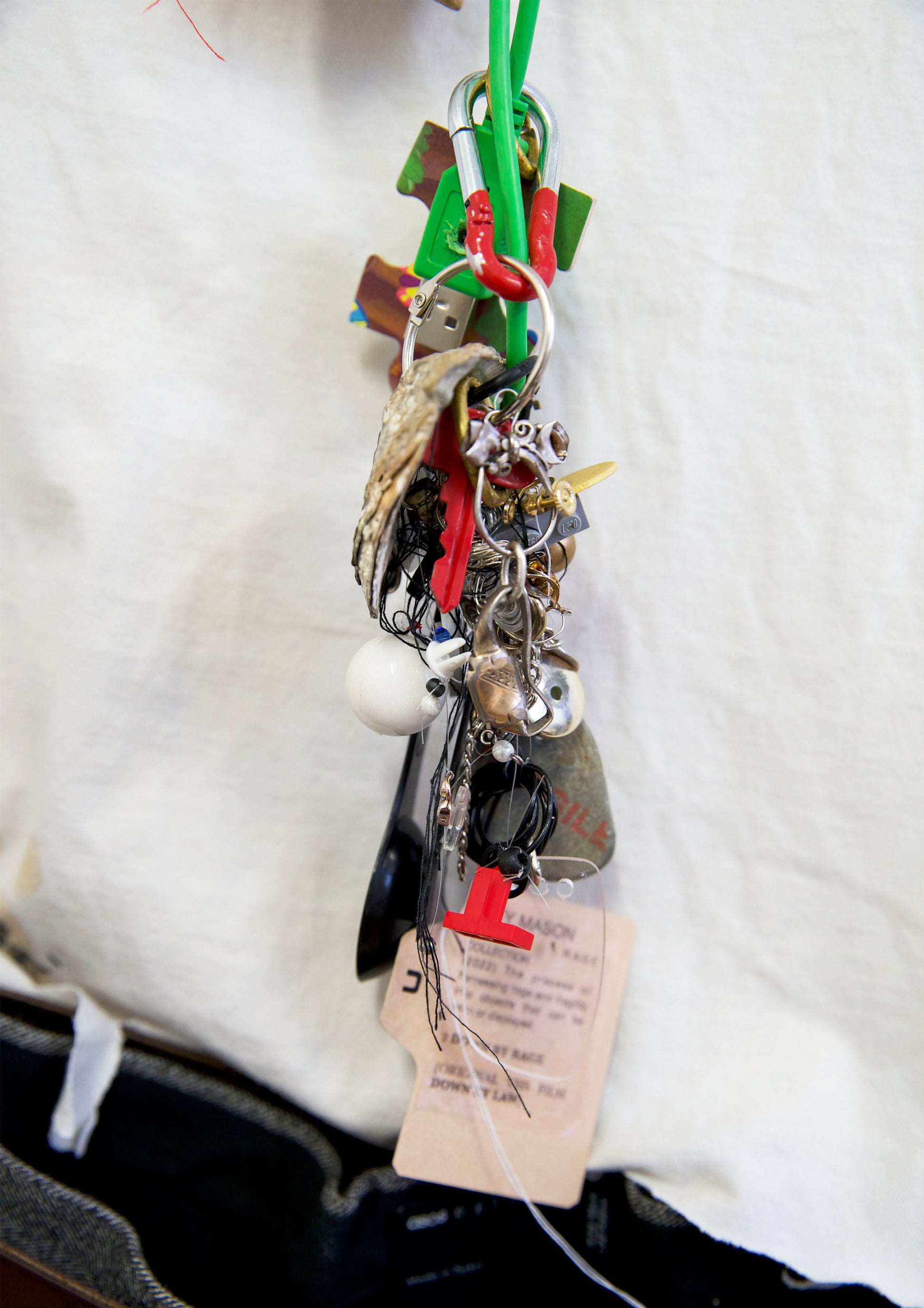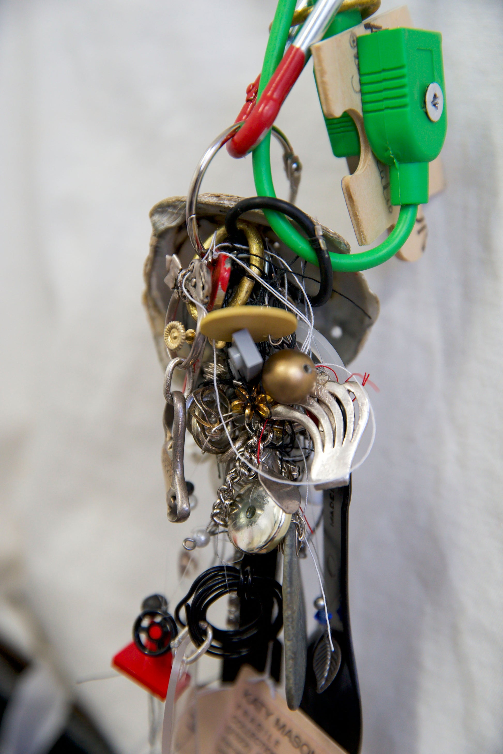 Necklaces re-upcycled in The Sarabande Studios, London. Materials include broken charger, jigsaw puzzle piece, glasses lens, sterling silver rings, lego steering wheel and plastic measuring spoon.