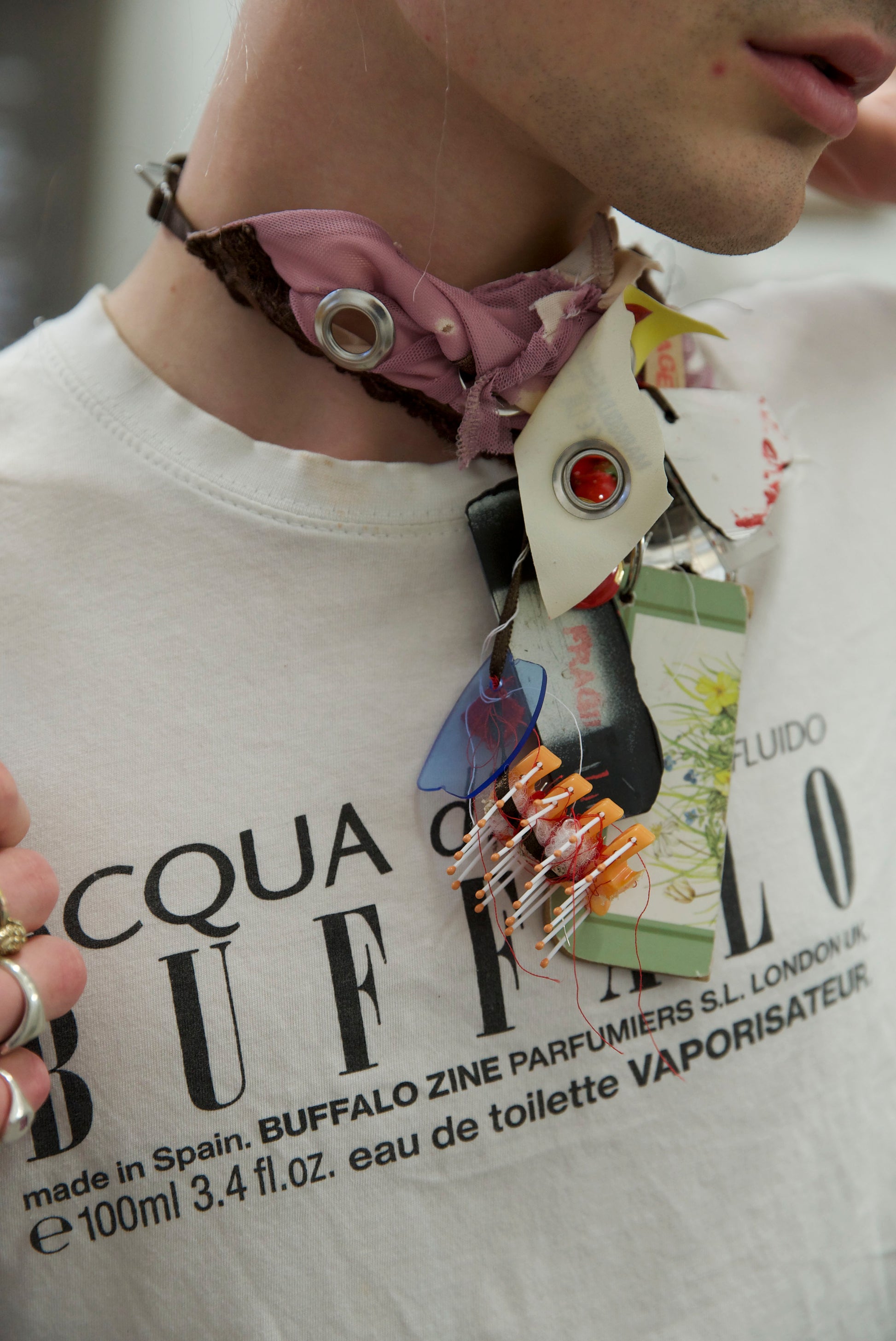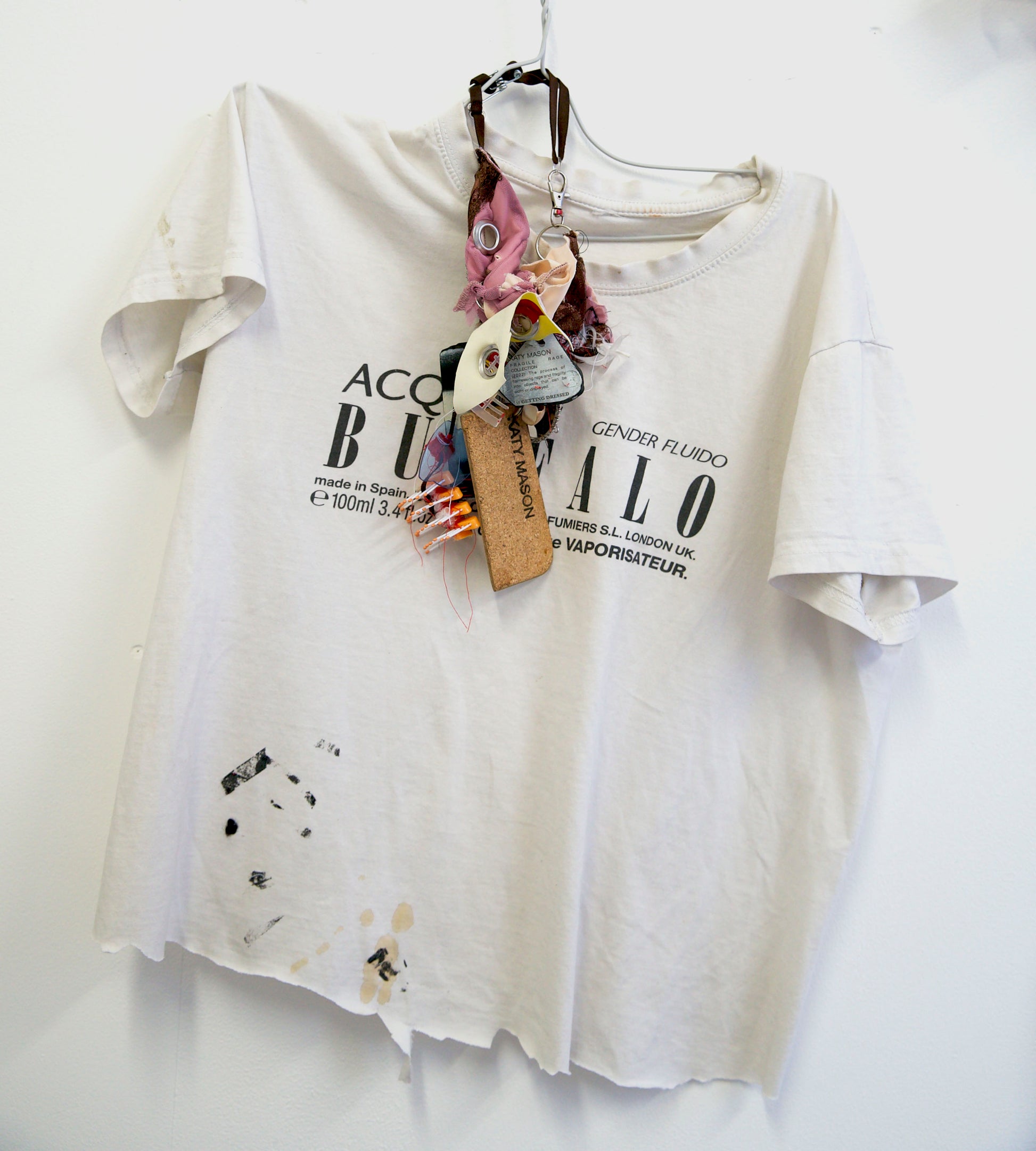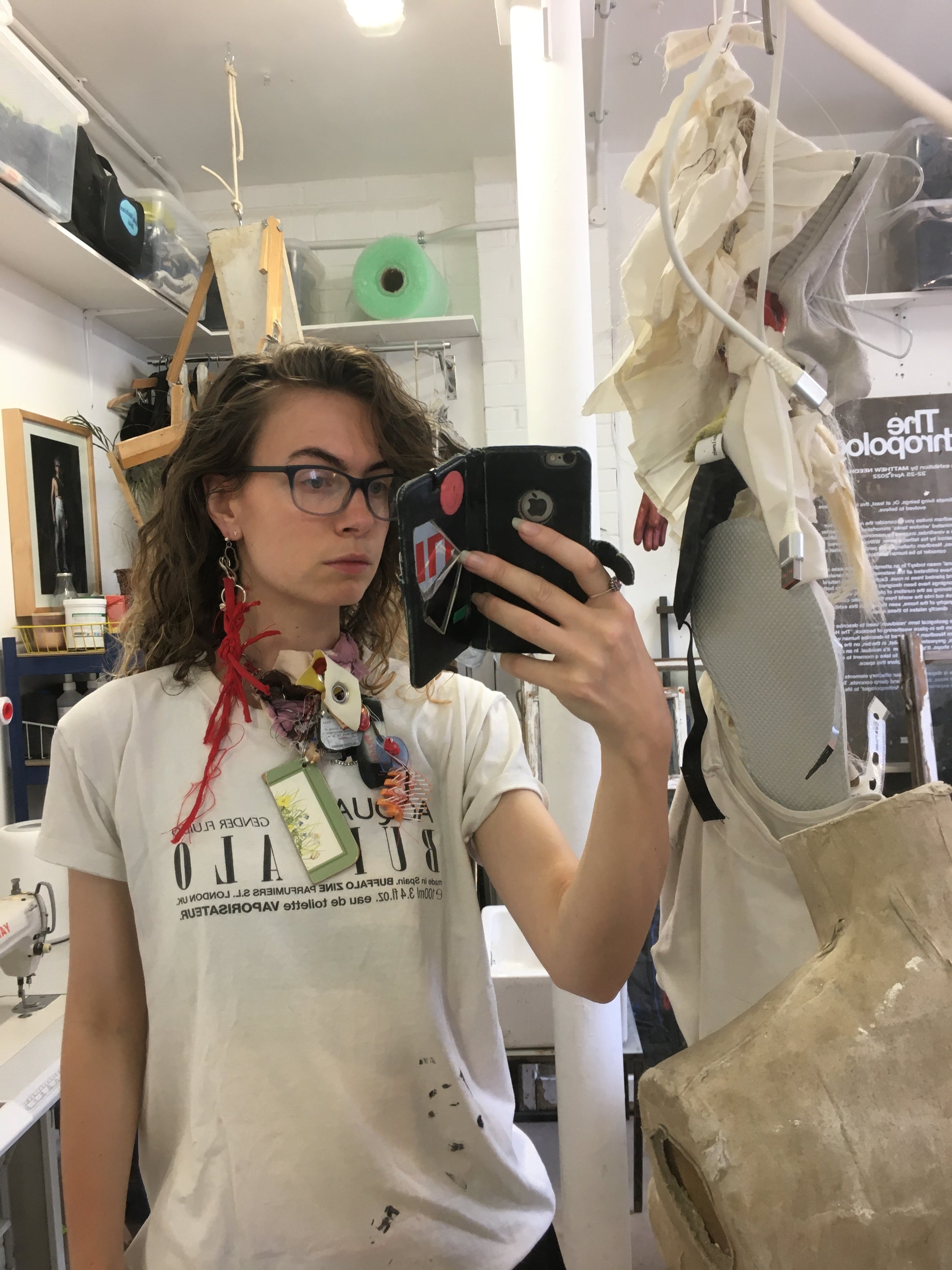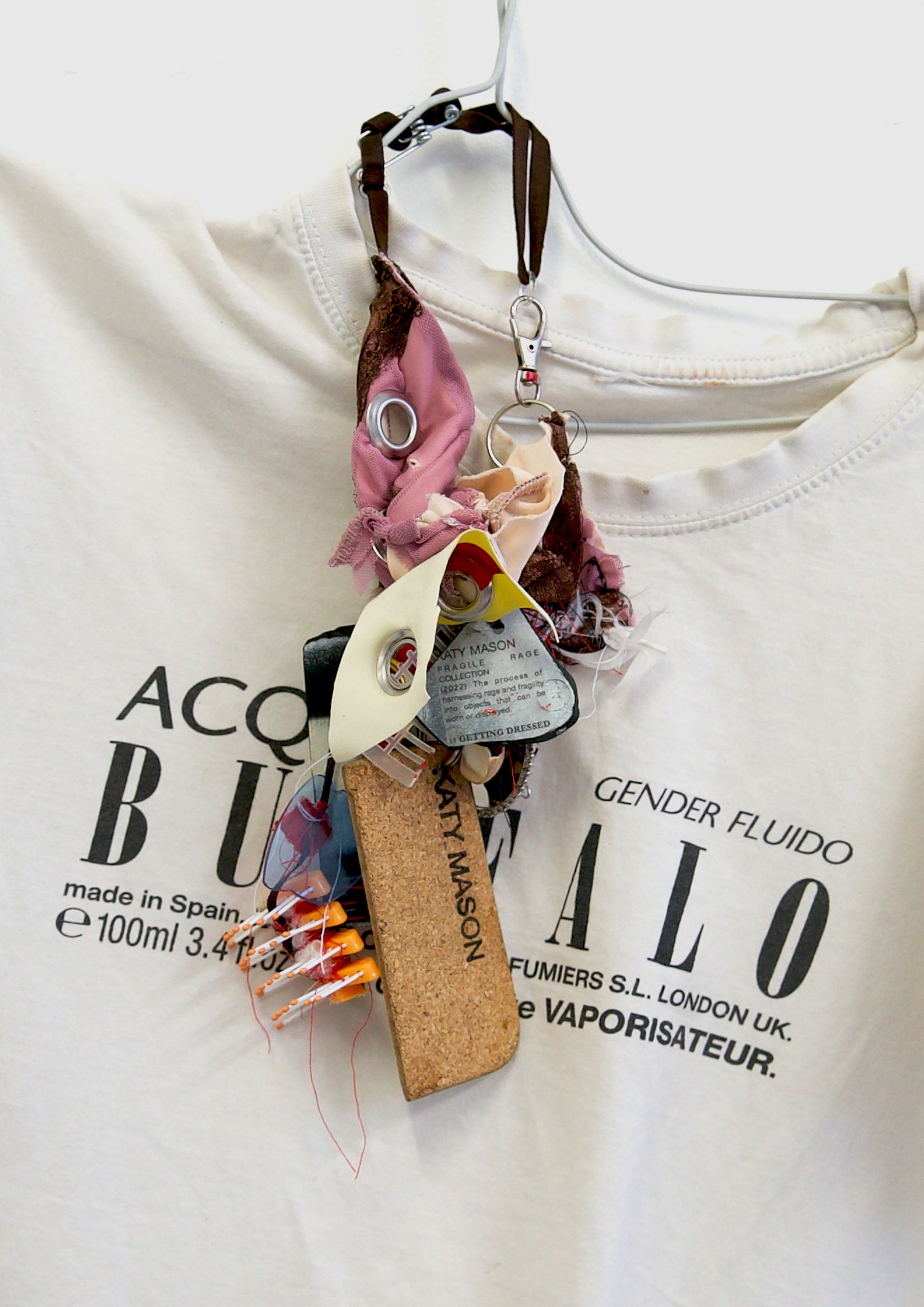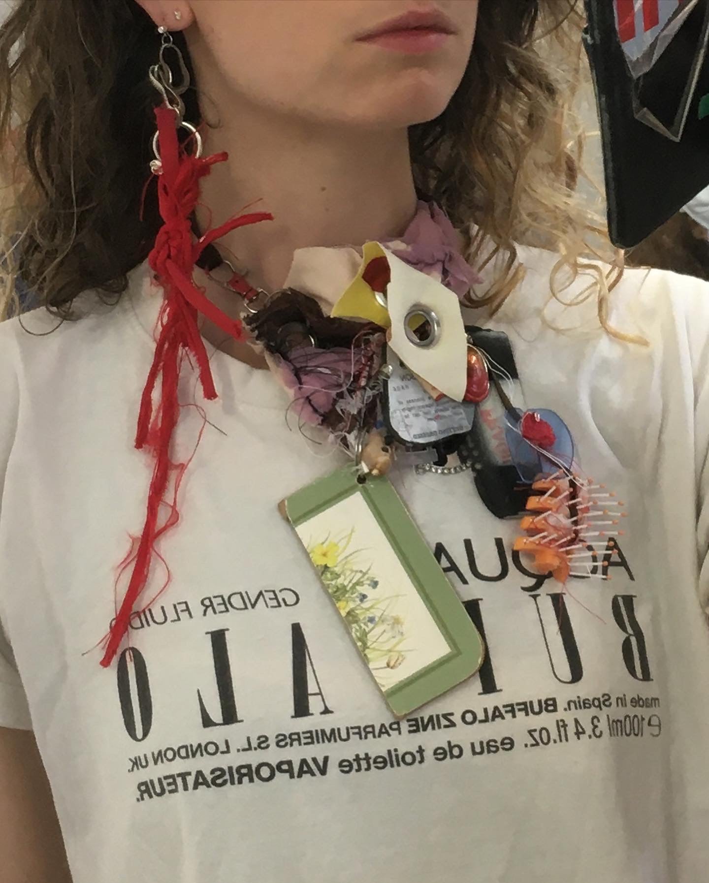 Necklaces re-upcycled in The Sarabande Studios, London. Materials include bra/bra straps, marigold glove, tea coaster, hair brush head, broken microwave piece, deconstructed hair curler and glasses lens.