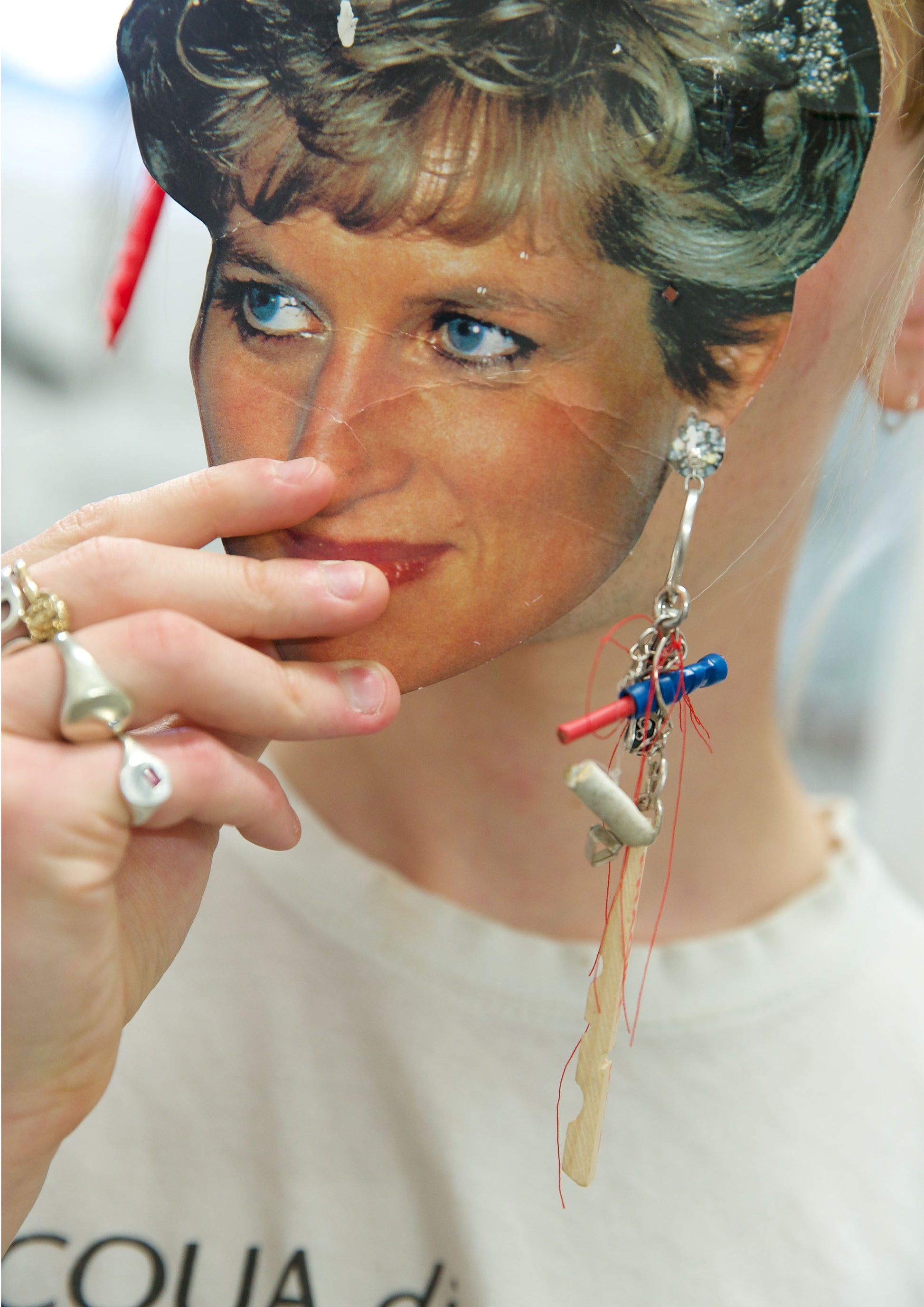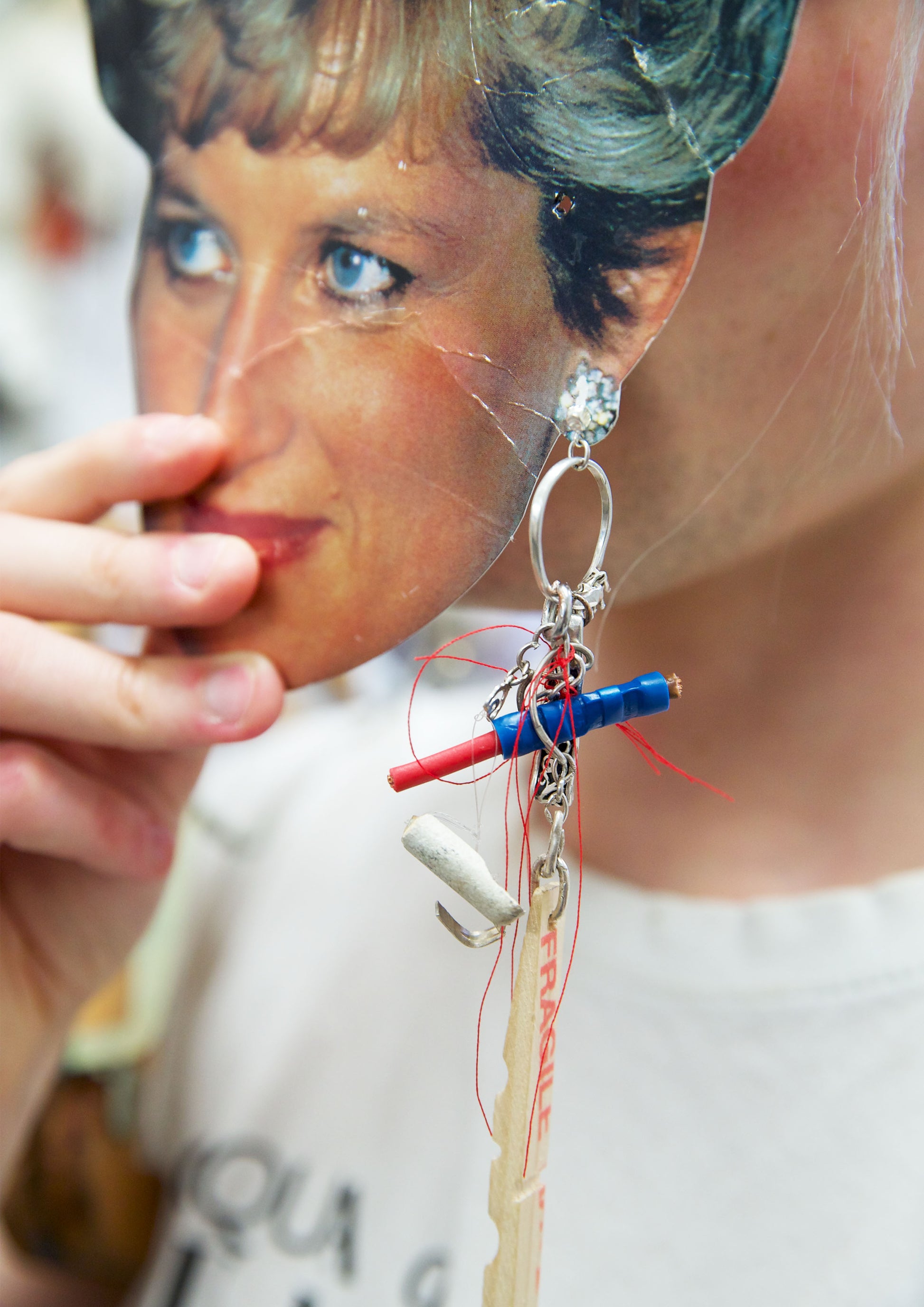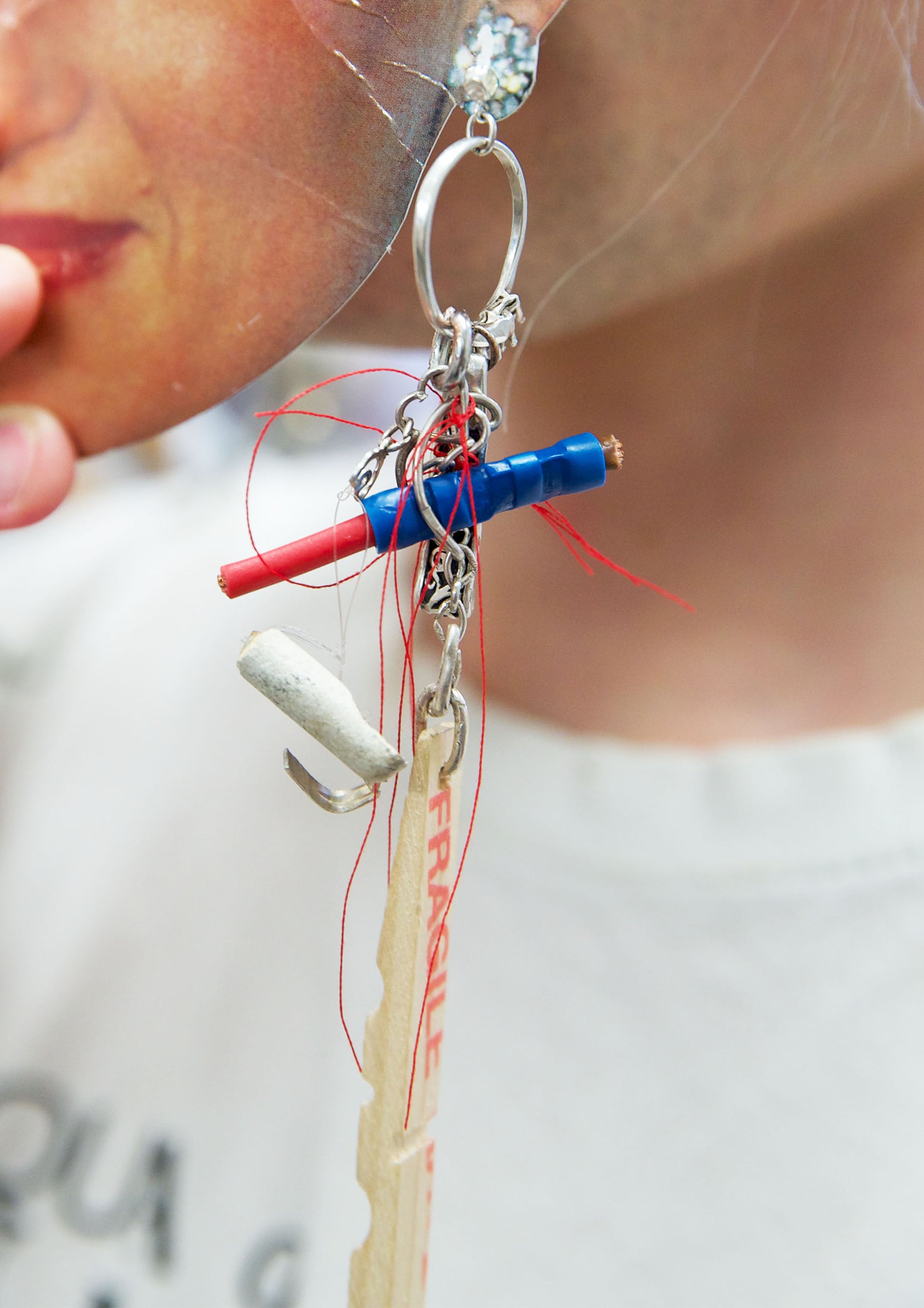 Earrings re-upcycled in The Sarabande Studios, London. Materials include sterling silver rings, clothes peg, electrical wire, 16th century pipe.