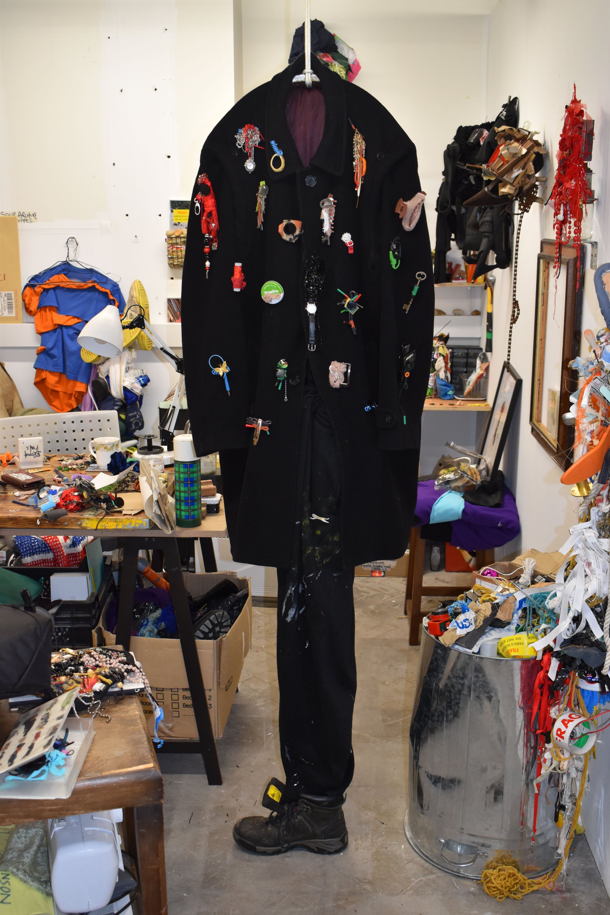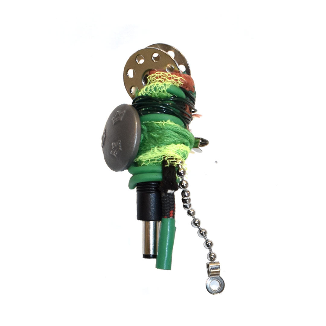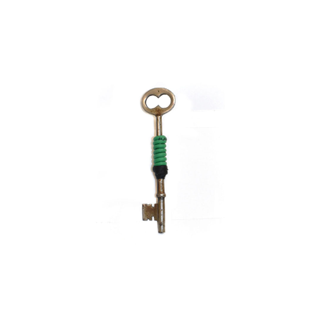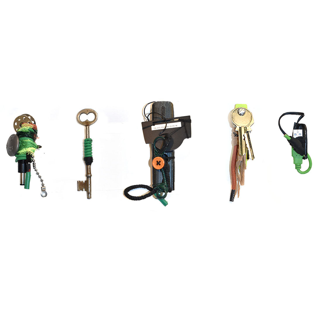 Materials include metal keys, electrical wires, textiles, buttons and bobbin. All brooches have metal brooch pin attached to the back.