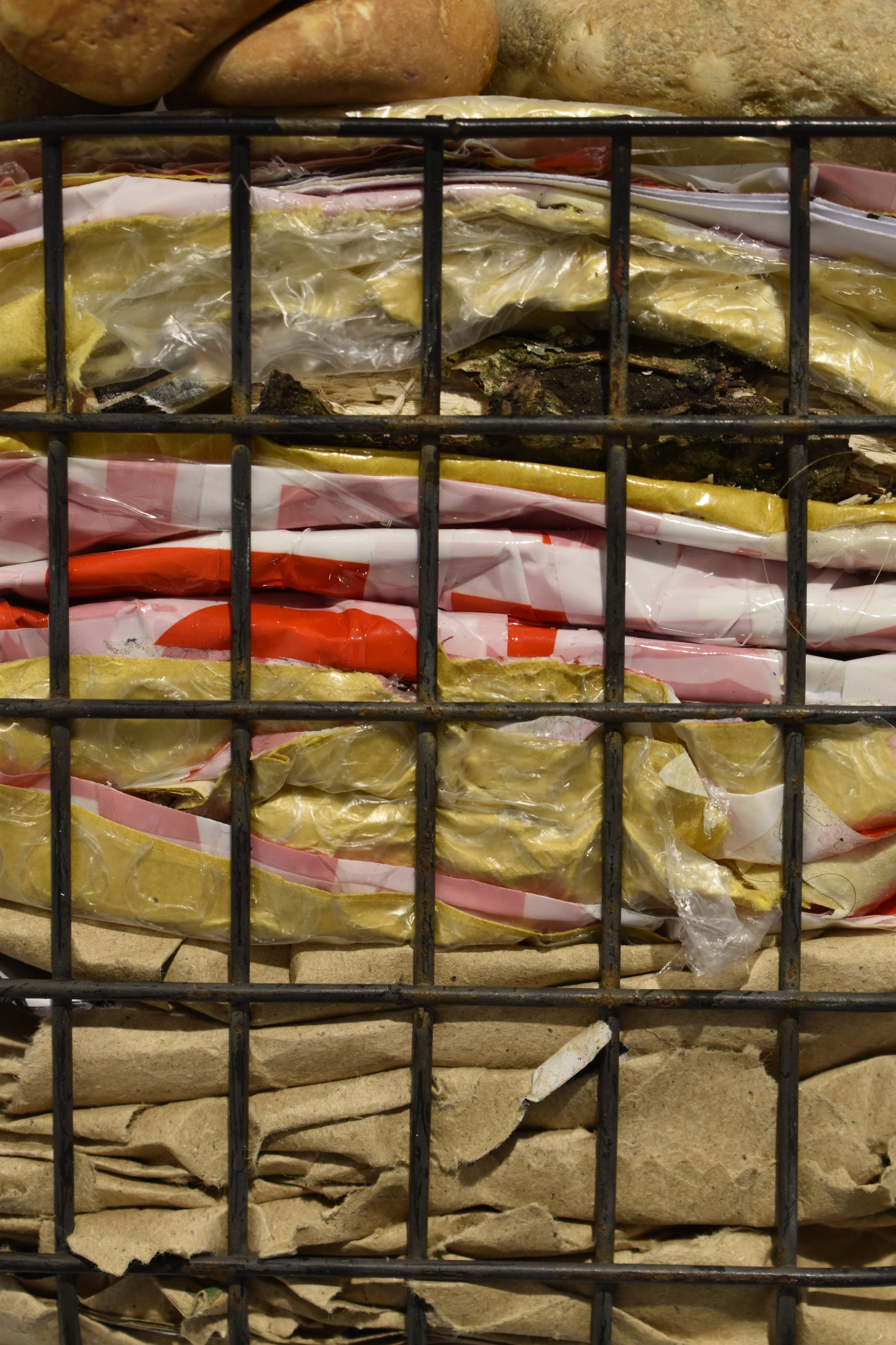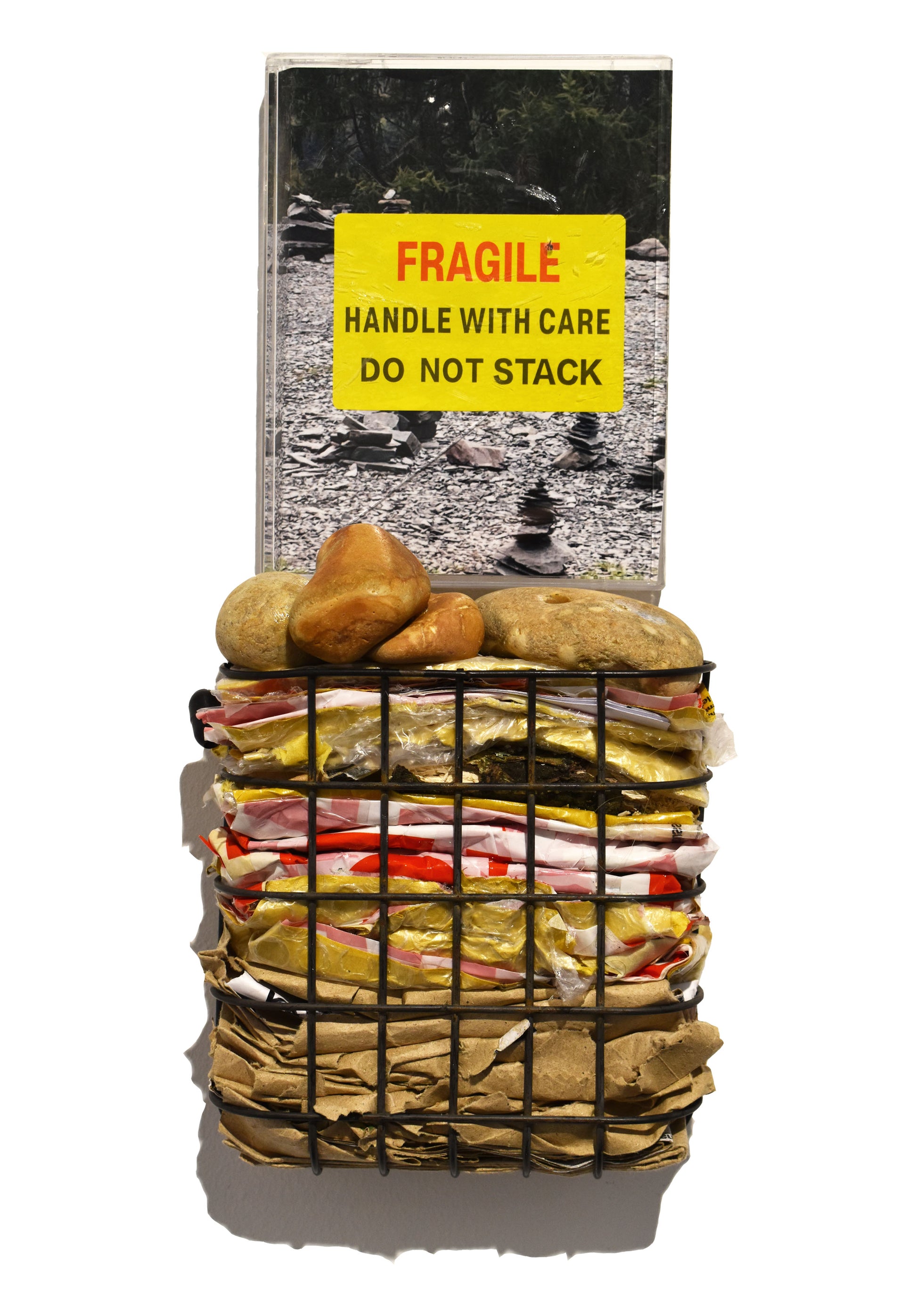 Assemblage of paper, cardboard, metal, plastic and rocks. Hook on the back to facilitate hanging onto the wall.