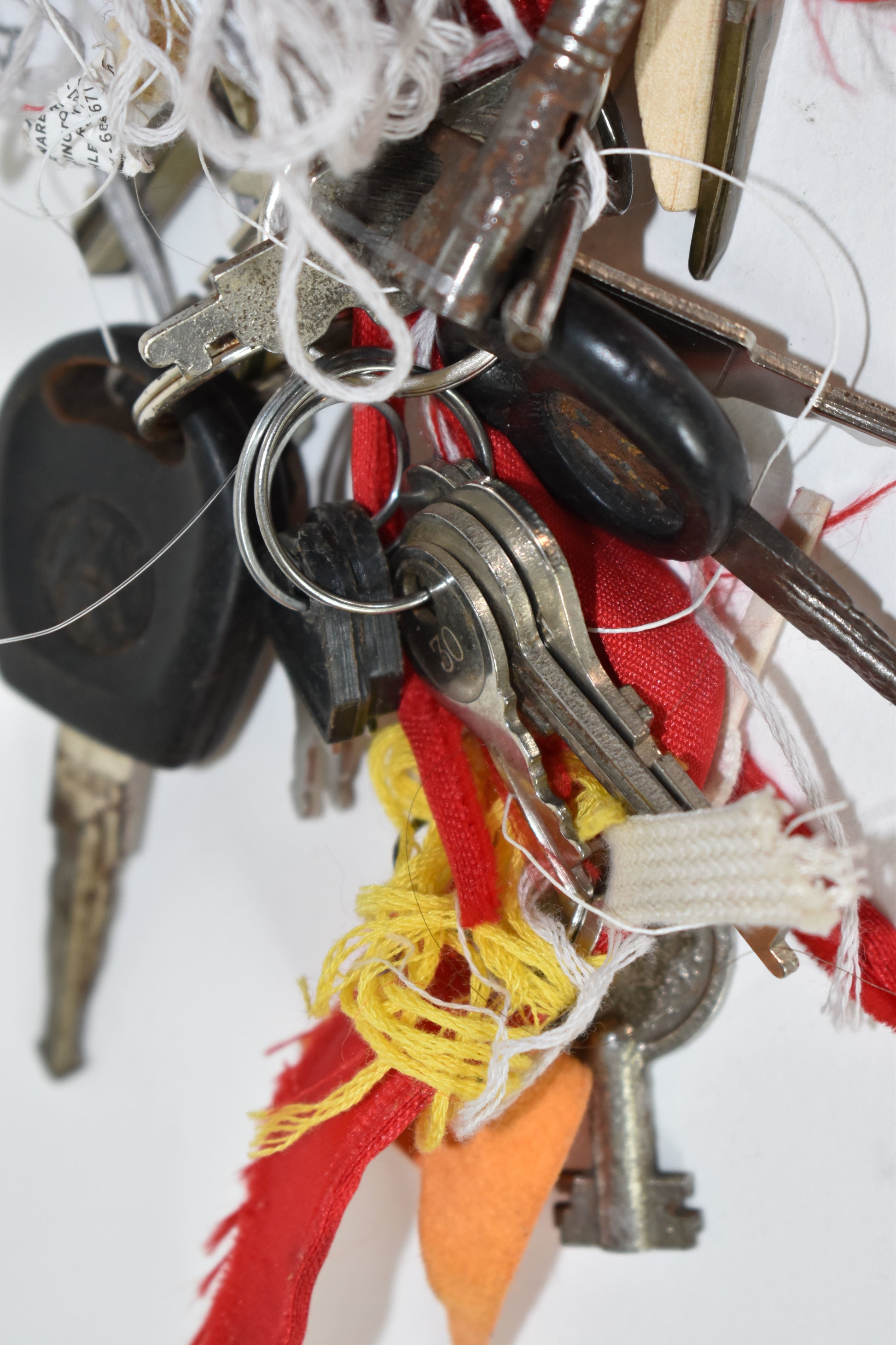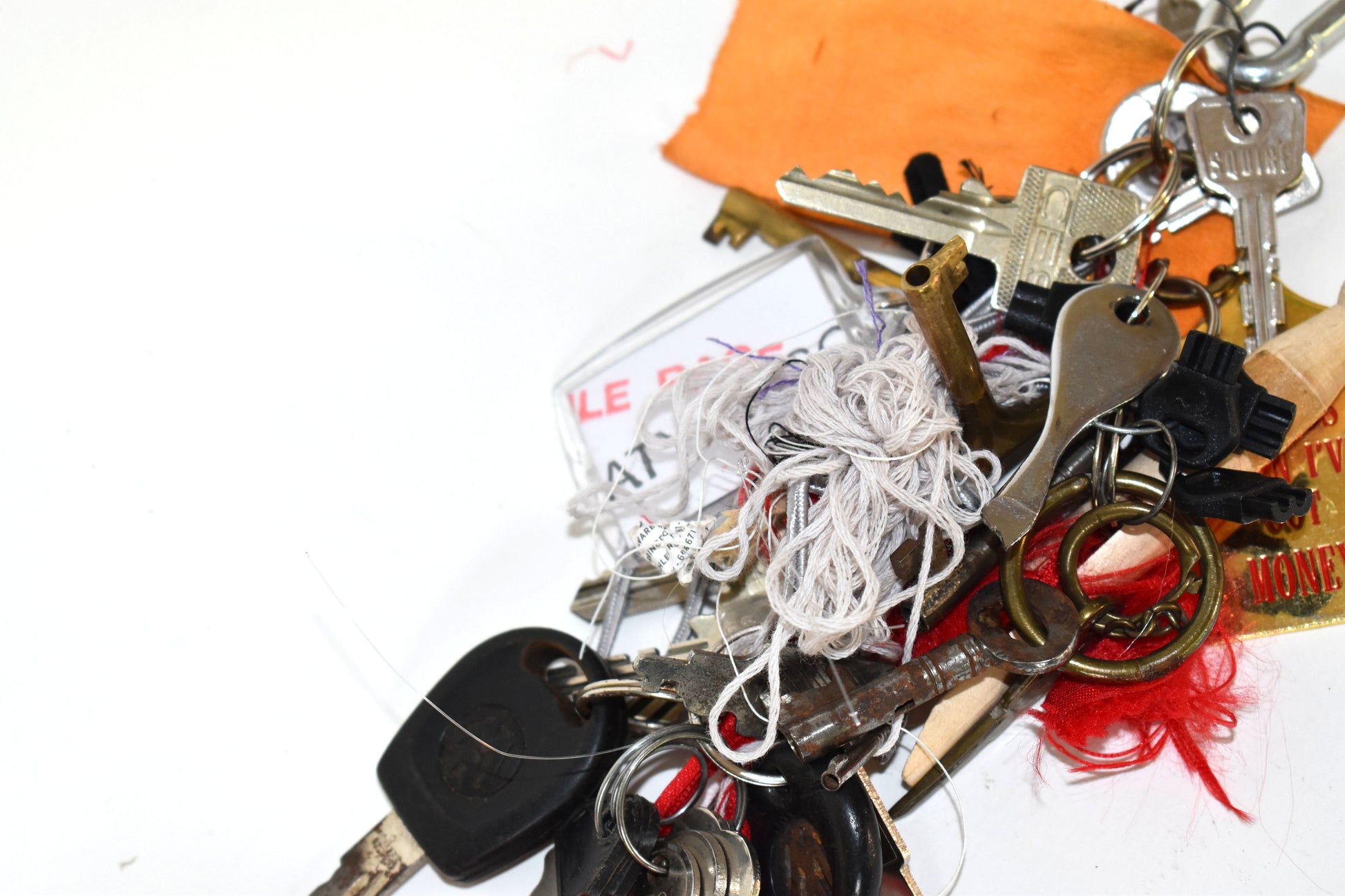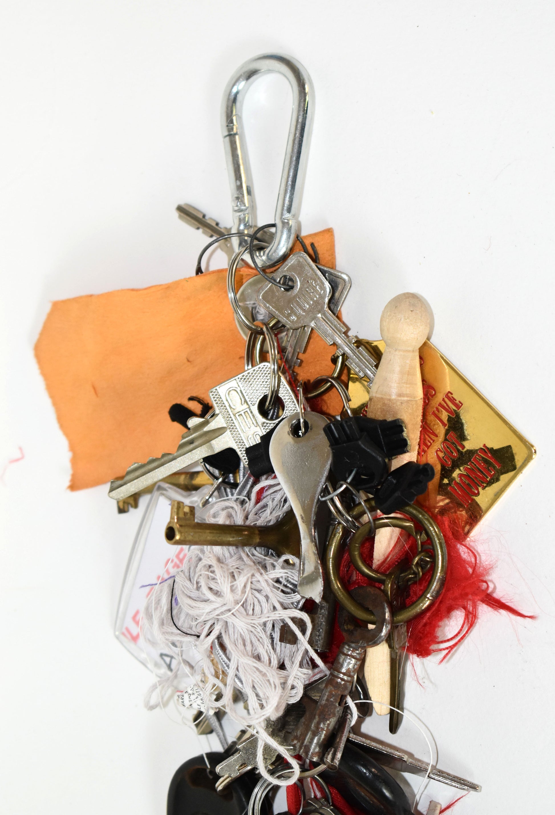 Keychain upcycled on Kings Road Studio, London. Materials include red silk, leather offcuts, clothes peg, embroidery thread and keys.