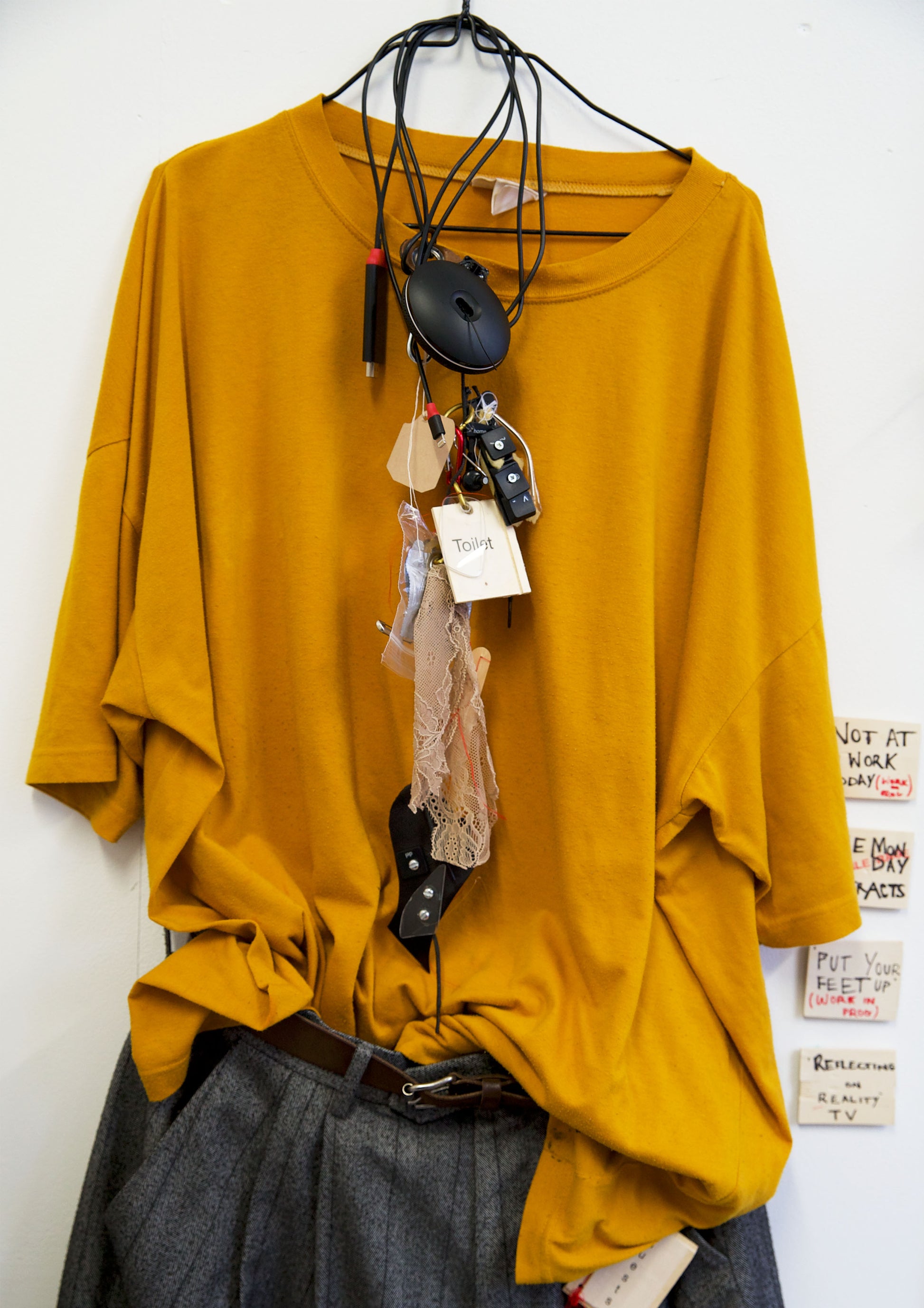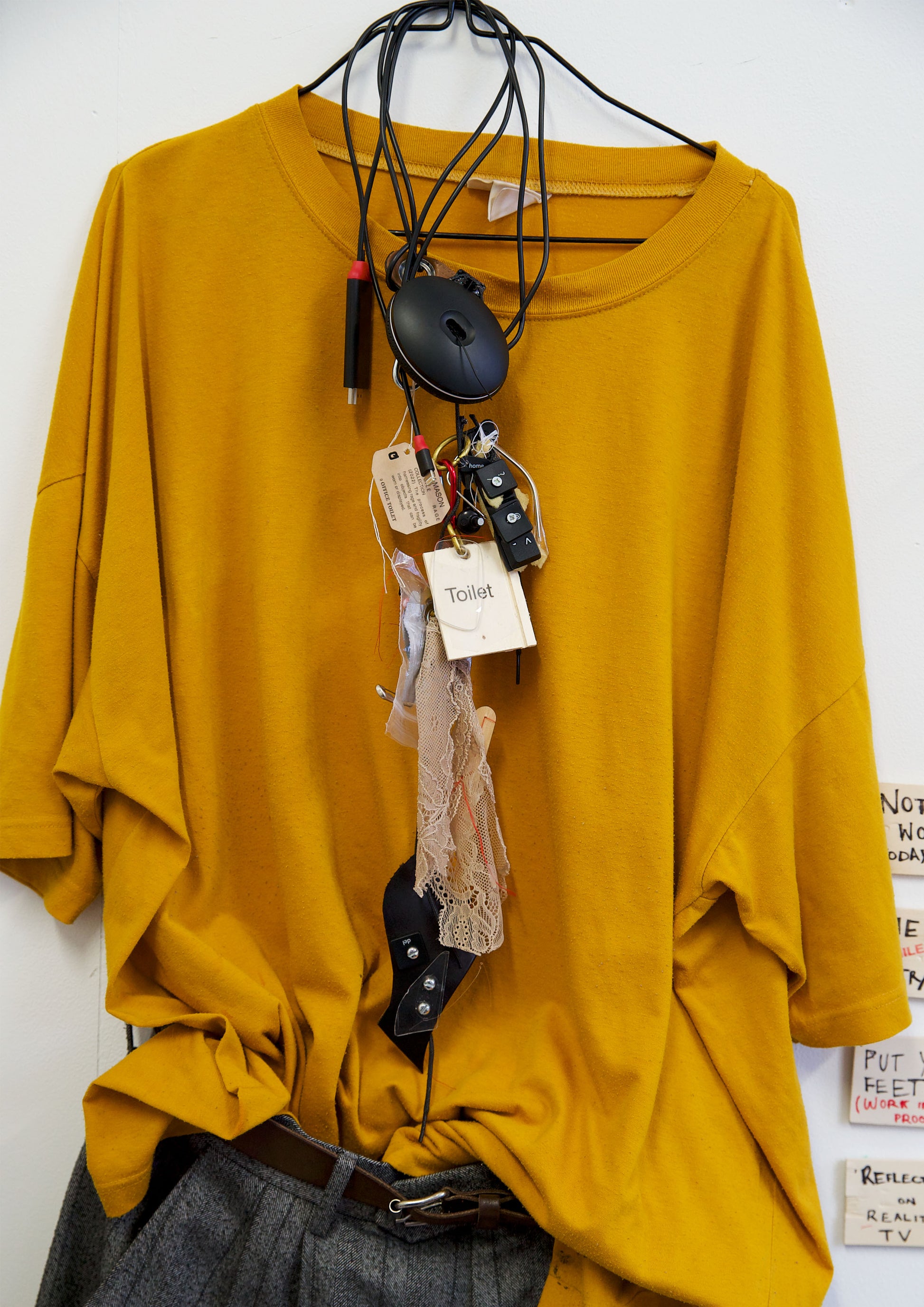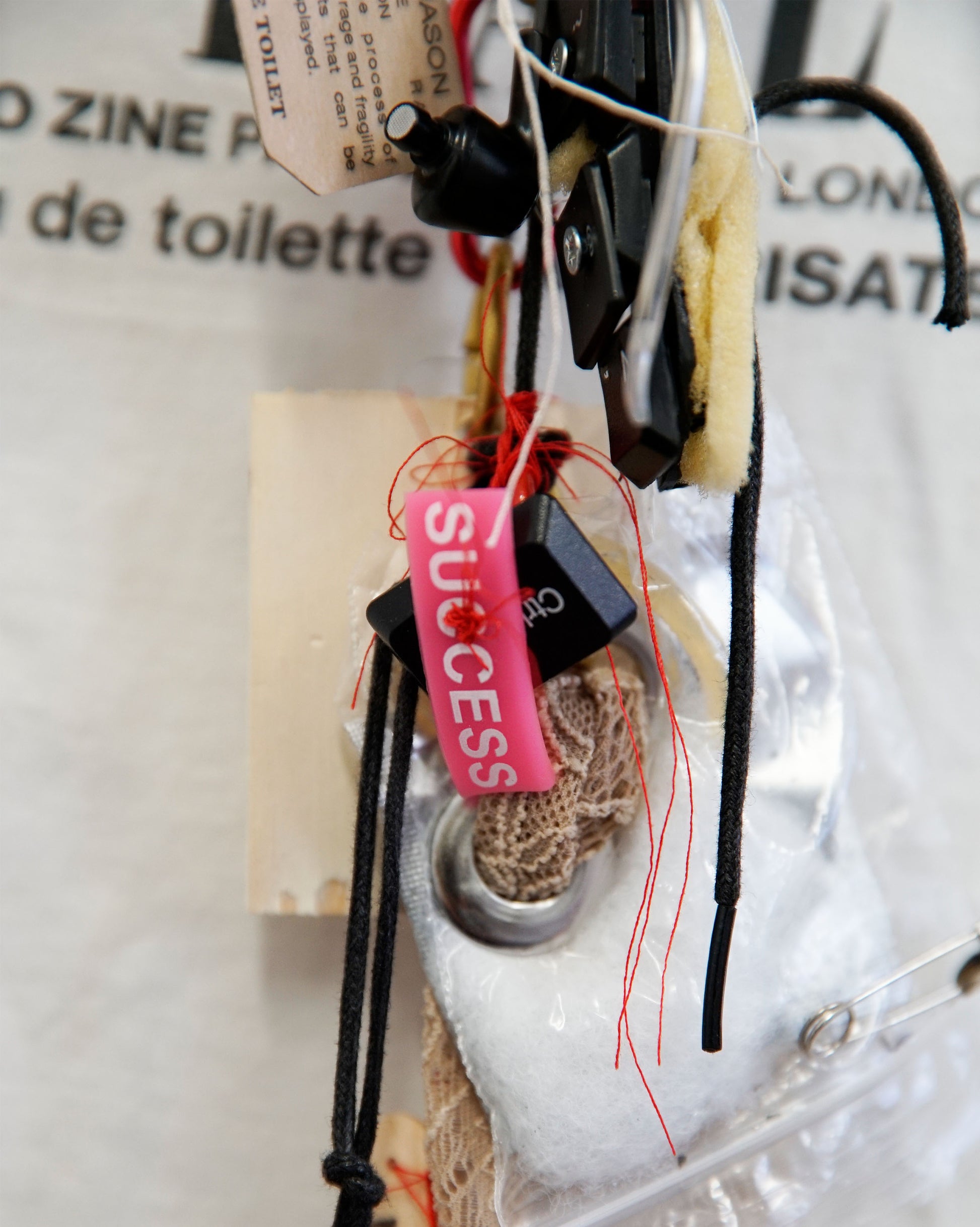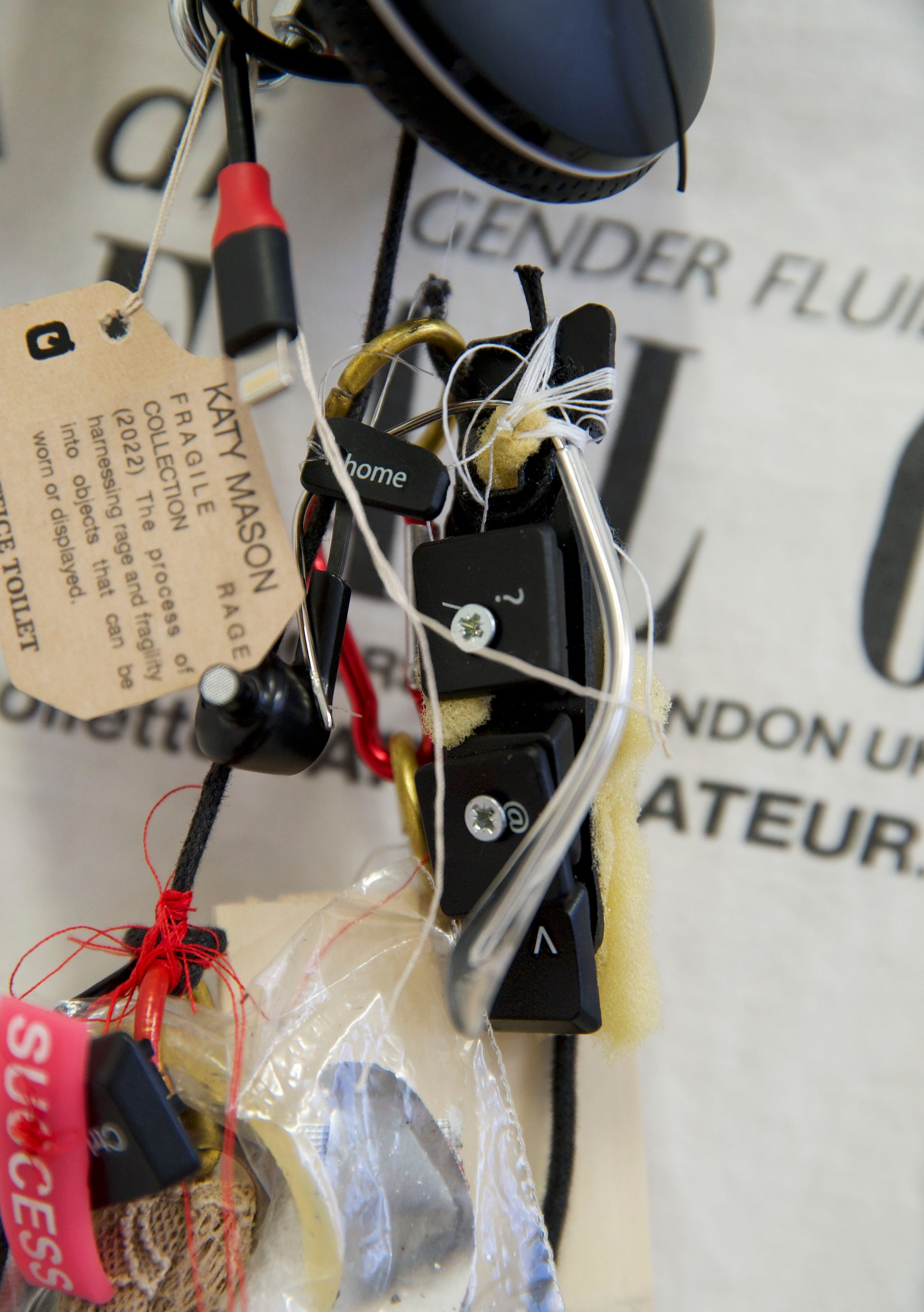 Necklaces re-upcycled in The Sarabande Studios, London. Materials include deconstructed headphones, phone chargers, stocking lace, keyboard keys and broken shoe.
