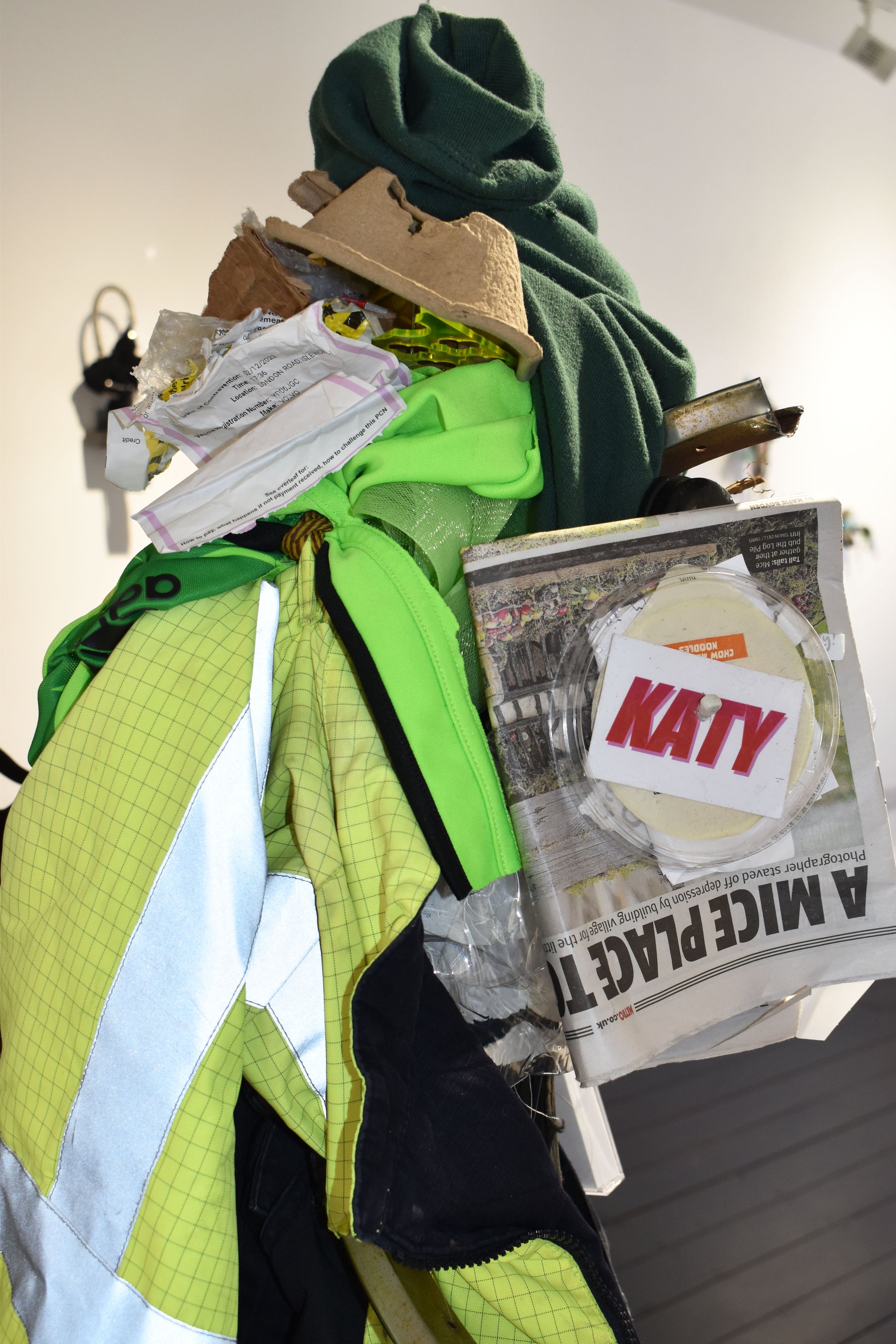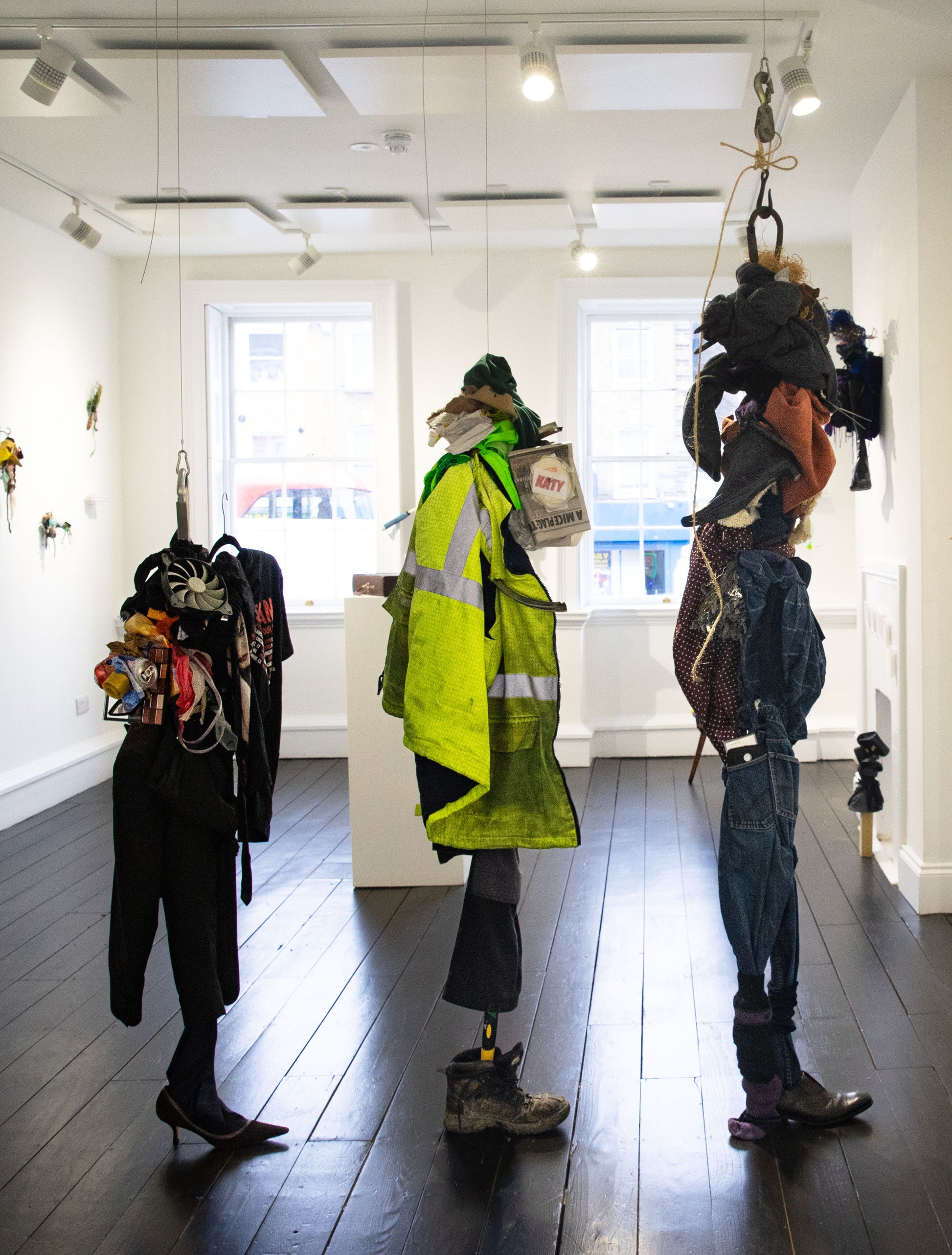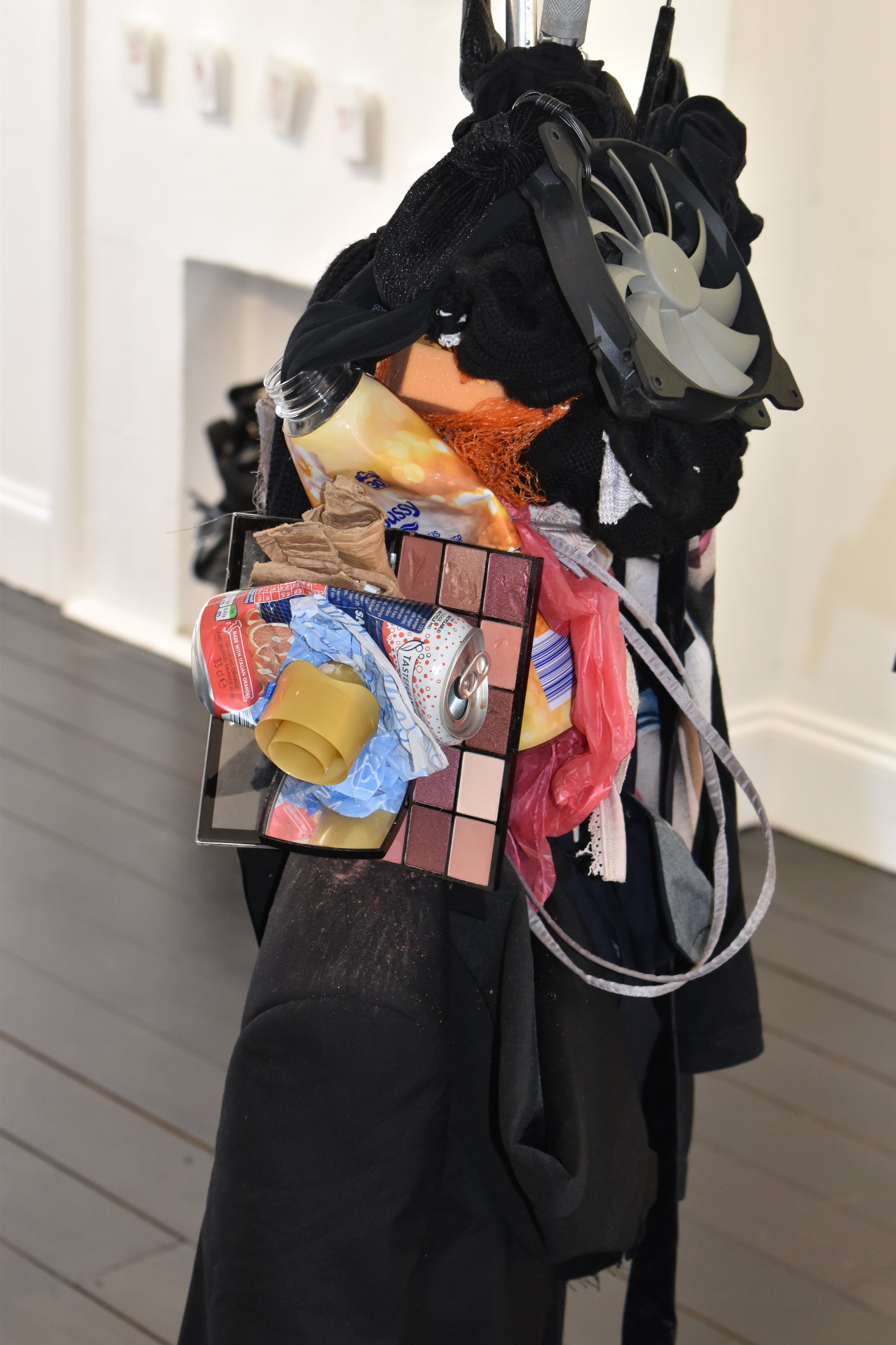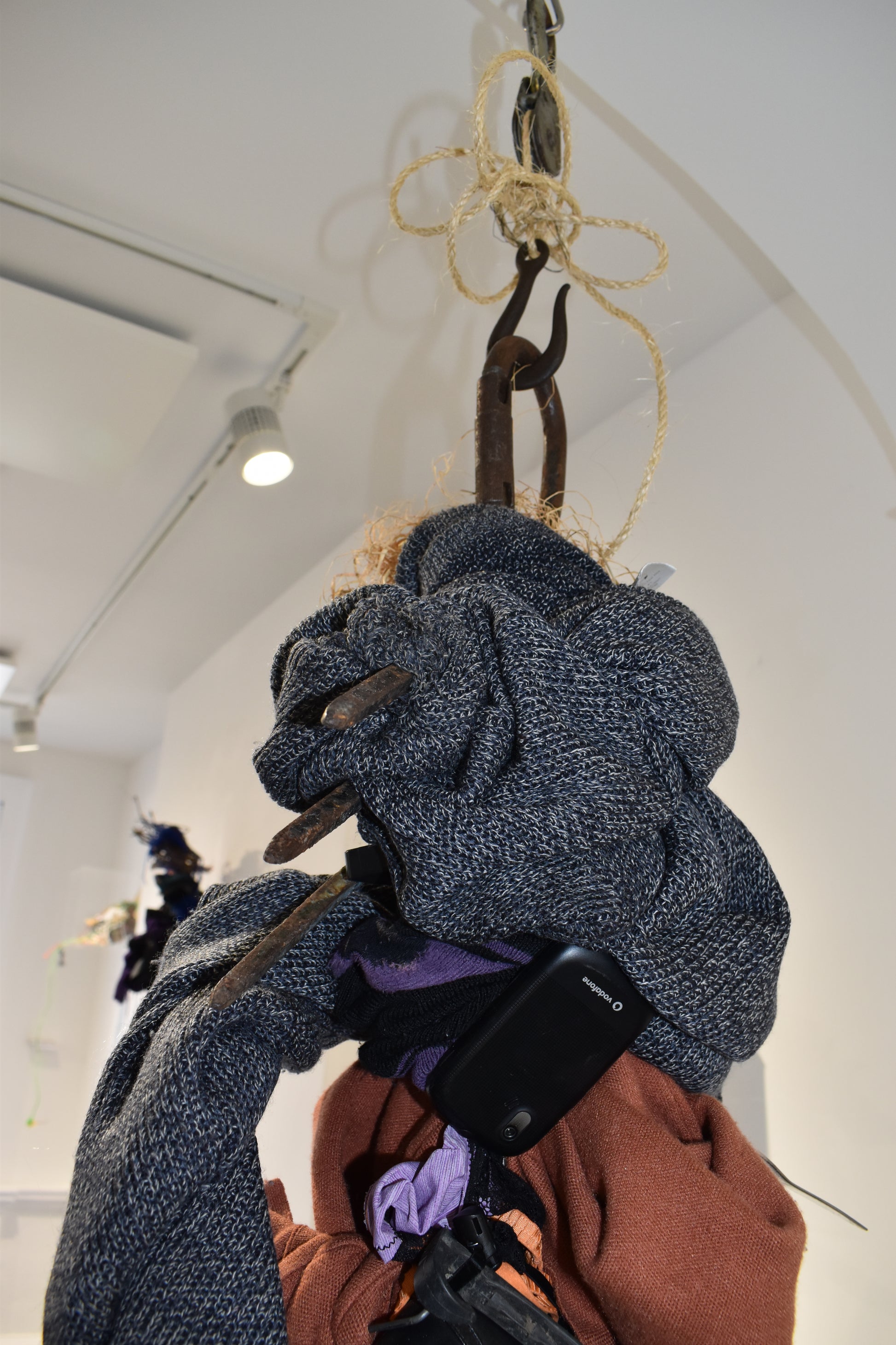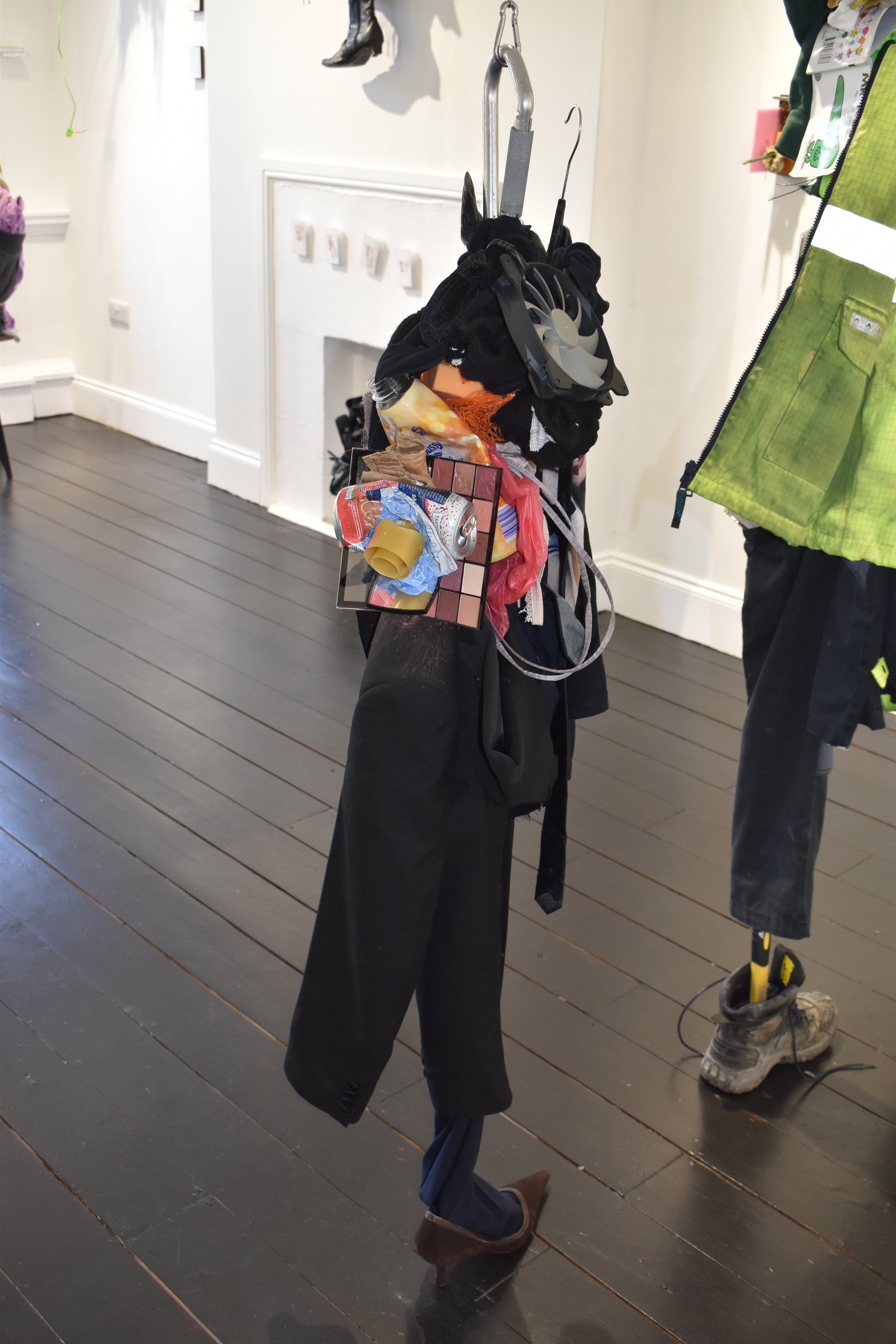 Sculpture split into 3 parts, modelled on the idea of 3 oversized keychains. Each piece is built from a large carabiner as the starting point. The textiles and objects are draped, stitched and woven together, inspired by the crafts often associated with putting together pieces of textiles to create wearable clothes. All 3 sculptures move downwards into a shoe; resembling the human figure, highlighting the sentience of waste and discarded objects.