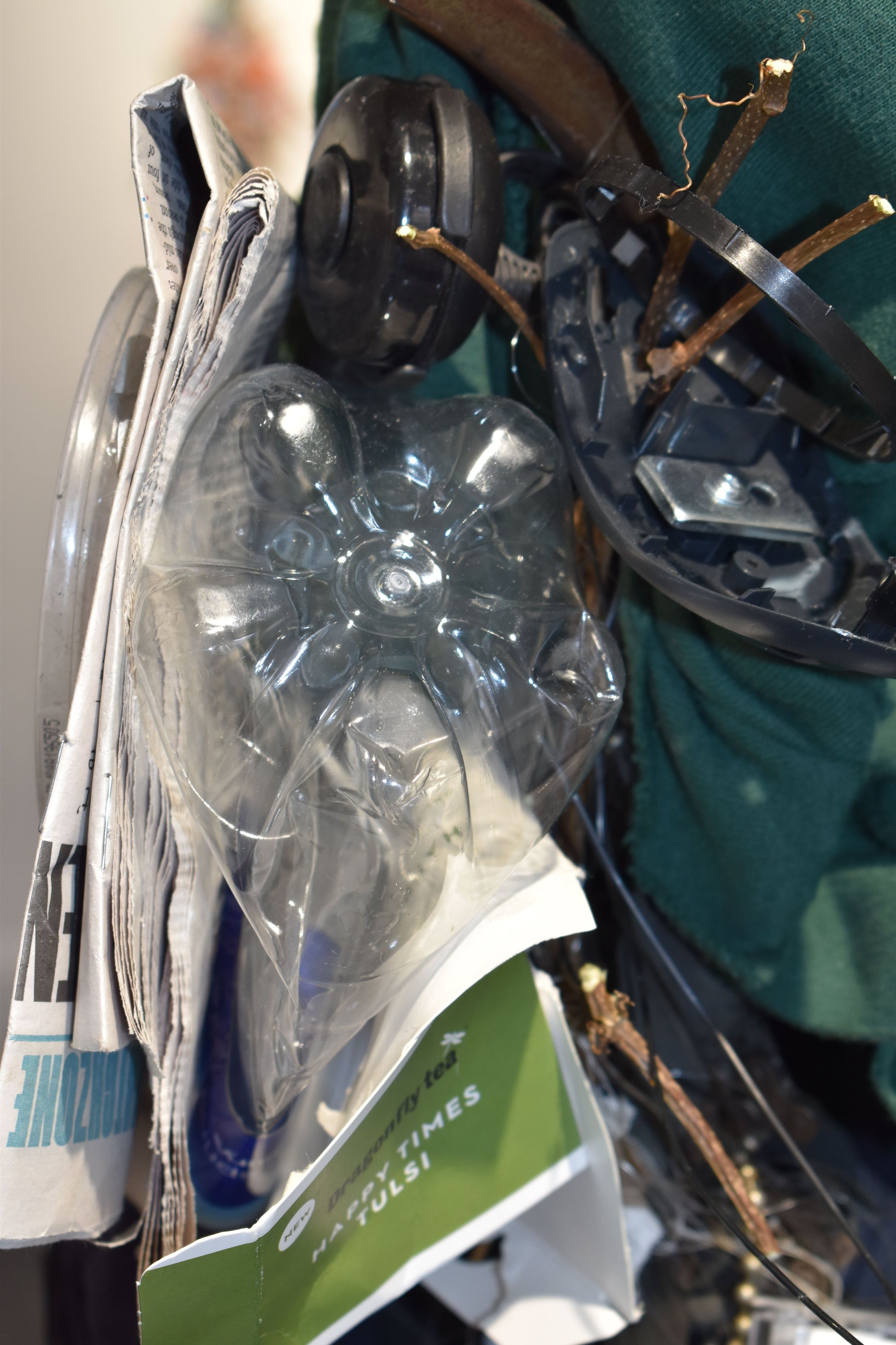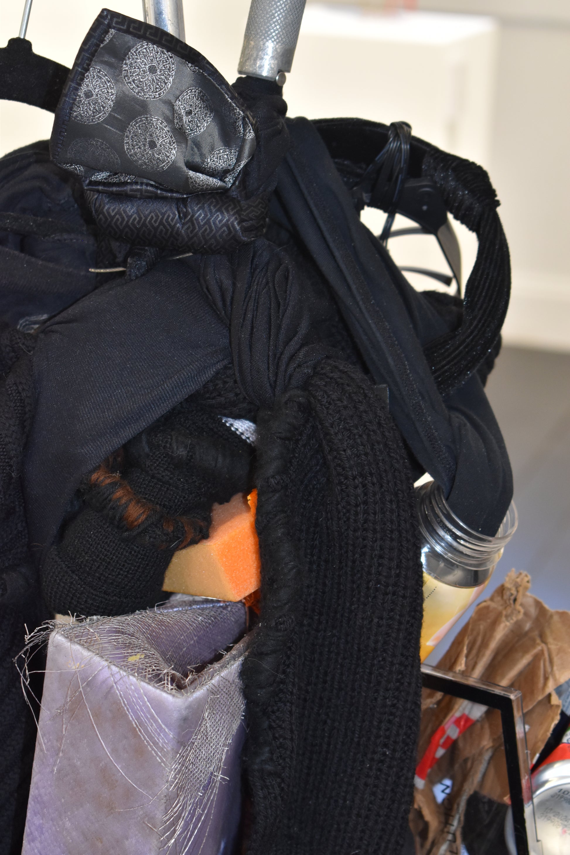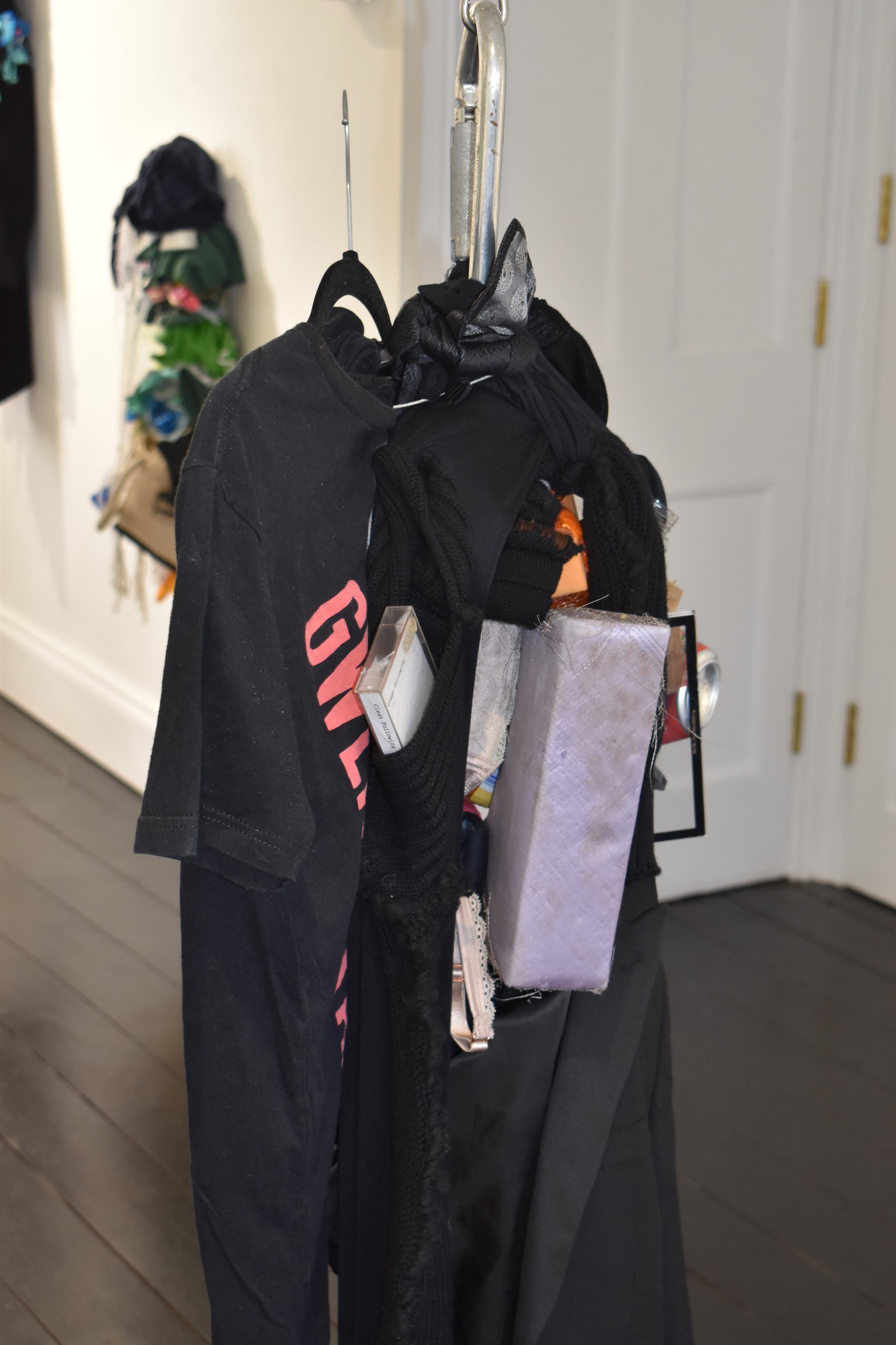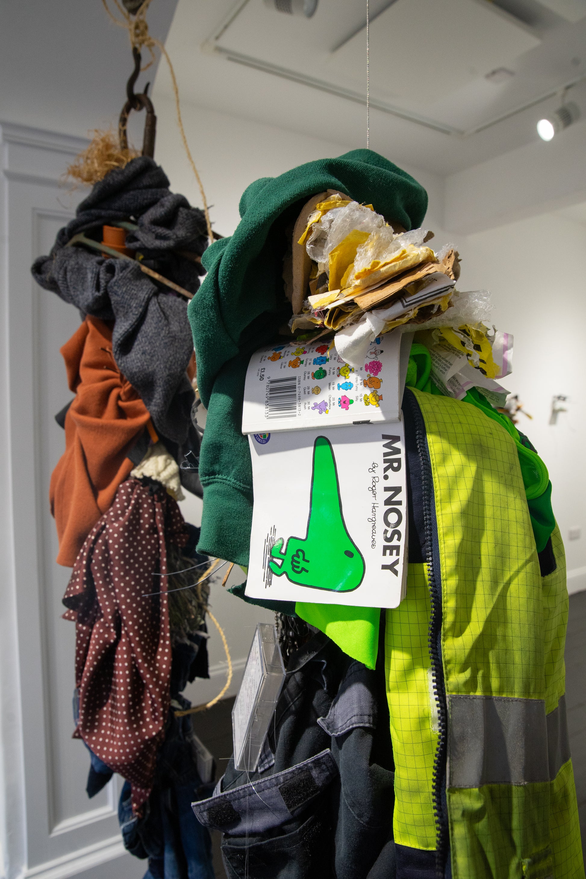 Sculpture split into 3 parts, modelled on the idea of 3 oversized keychains. Each piece is built from a large carabiner as the starting point. The textiles and objects are draped, stitched and woven together, inspired by the crafts often associated with putting together pieces of textiles to create wearable clothes. All 3 sculptures move downwards into a shoe; resembling the human figure, highlighting the sentience of waste and discarded objects.