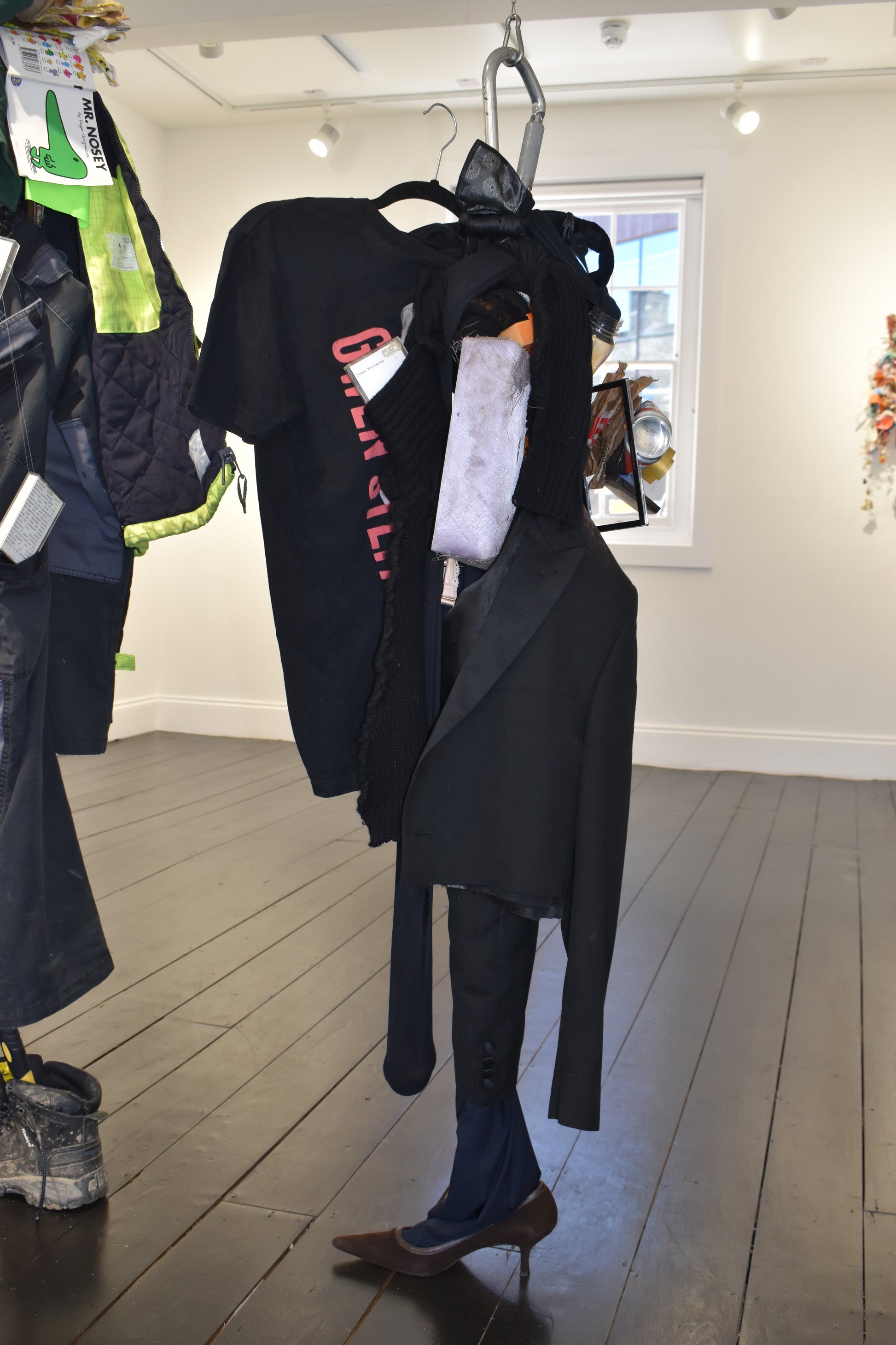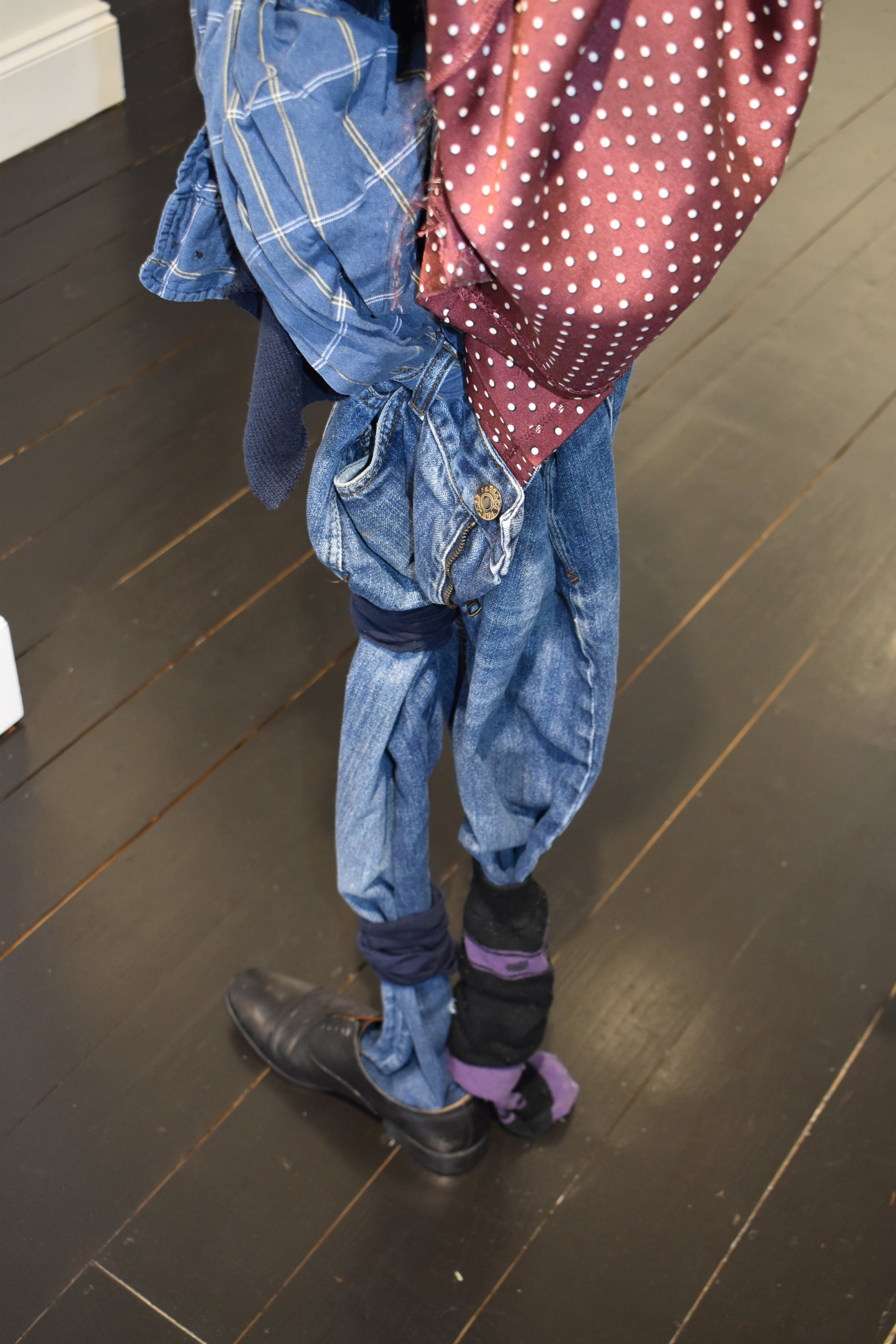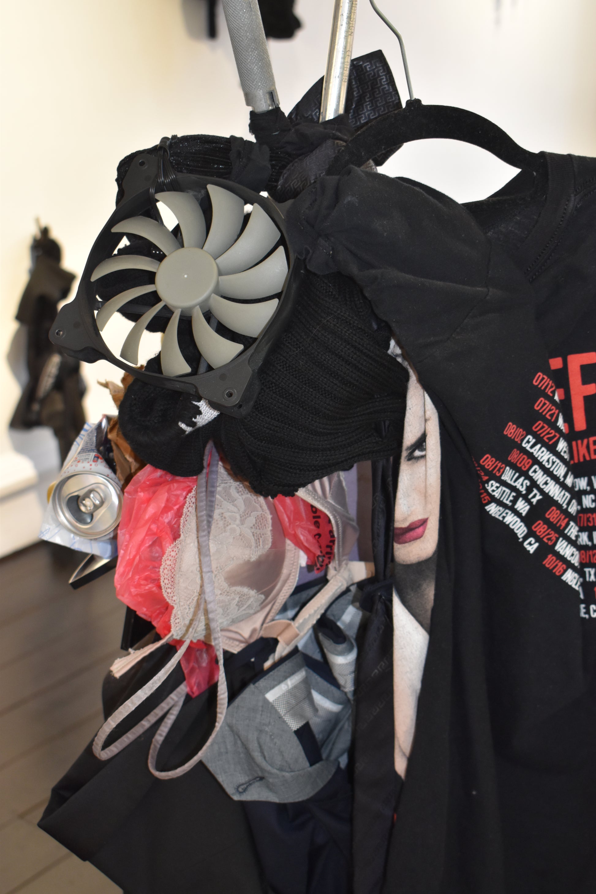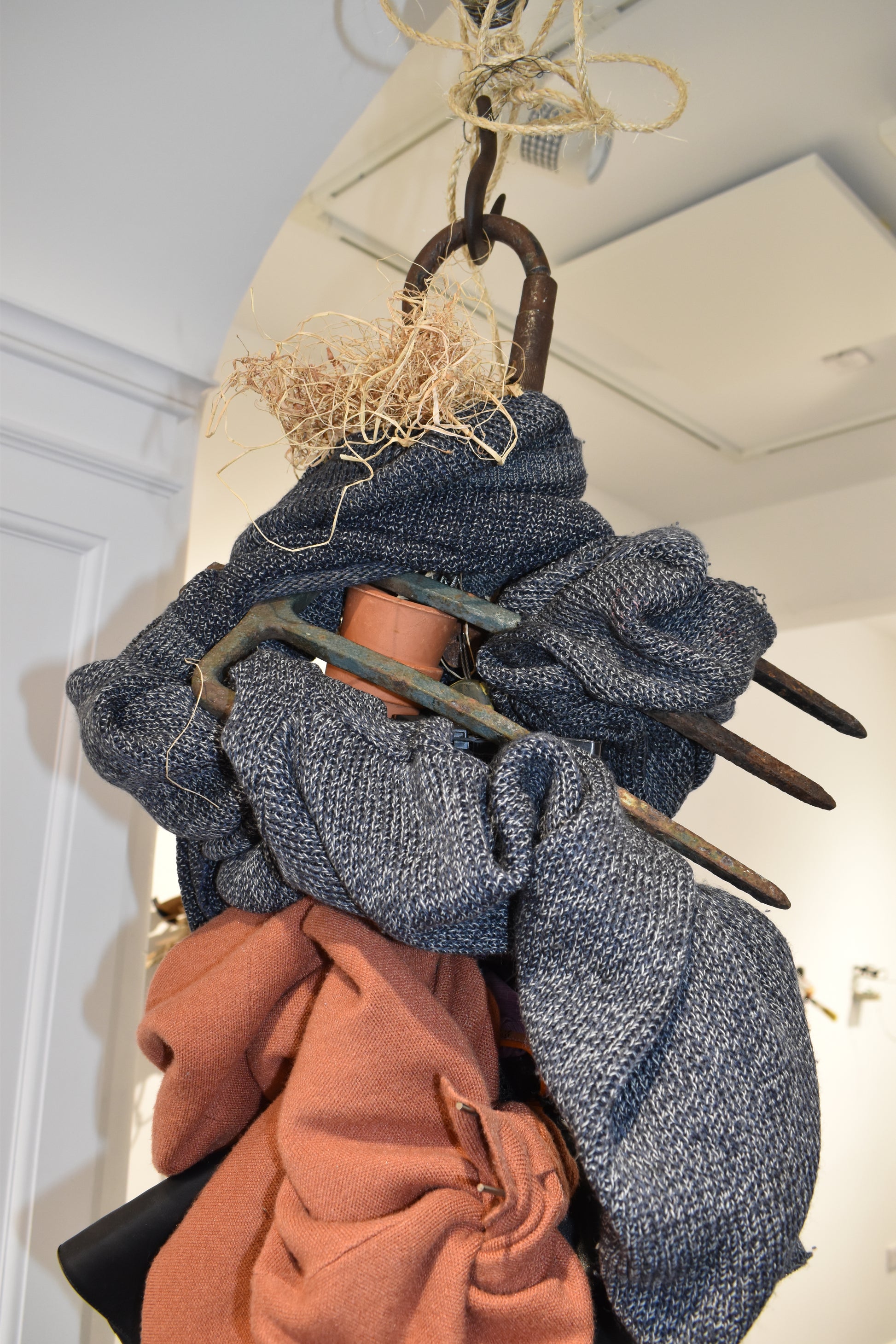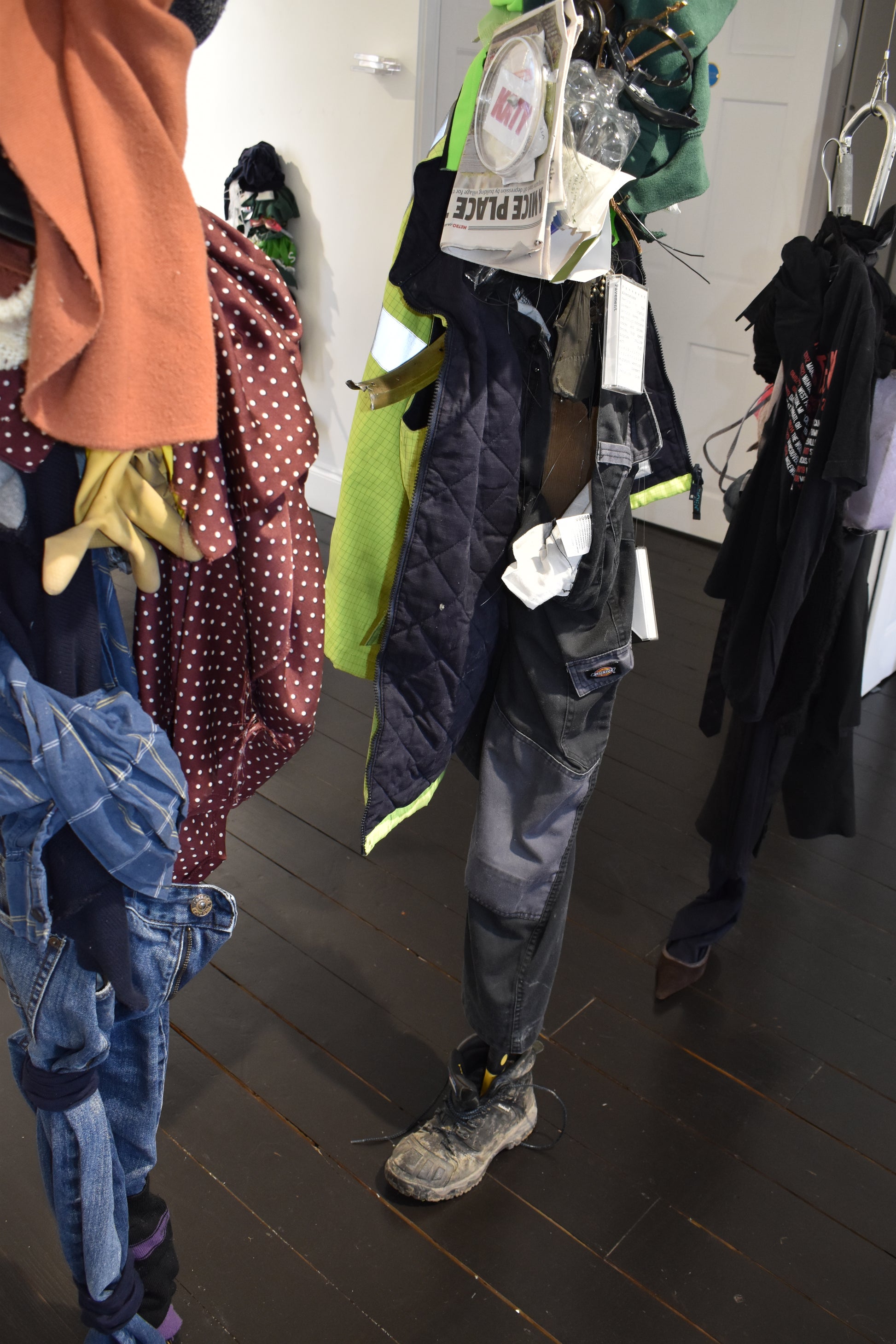Sculpture split into 3 parts, modelled on the idea of 3 oversized keychains. Each piece is built from a large carabiner as the starting point. The textiles and objects are draped, stitched and woven together, inspired by the crafts often associated with putting together pieces of textiles to create wearable clothes. All 3 sculptures move downwards into a shoe; resembling the human figure, highlighting the sentience of waste and discarded objects.