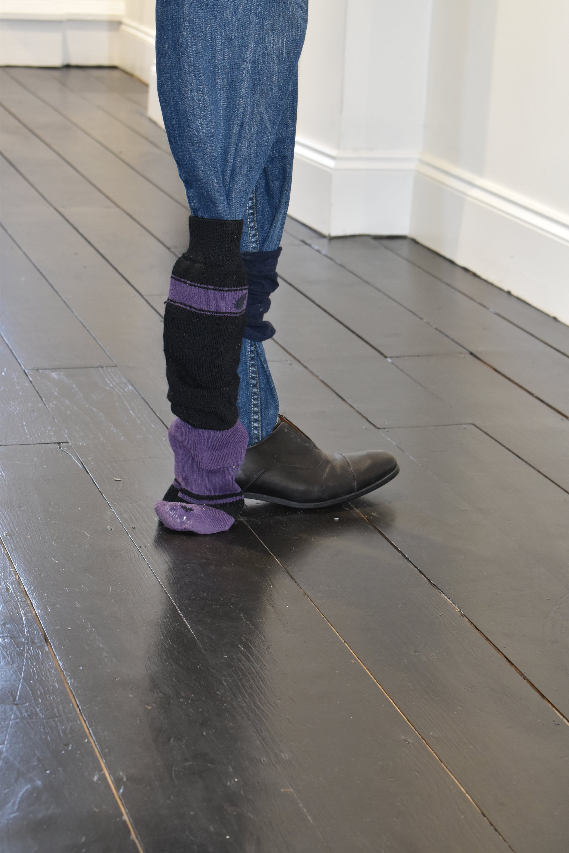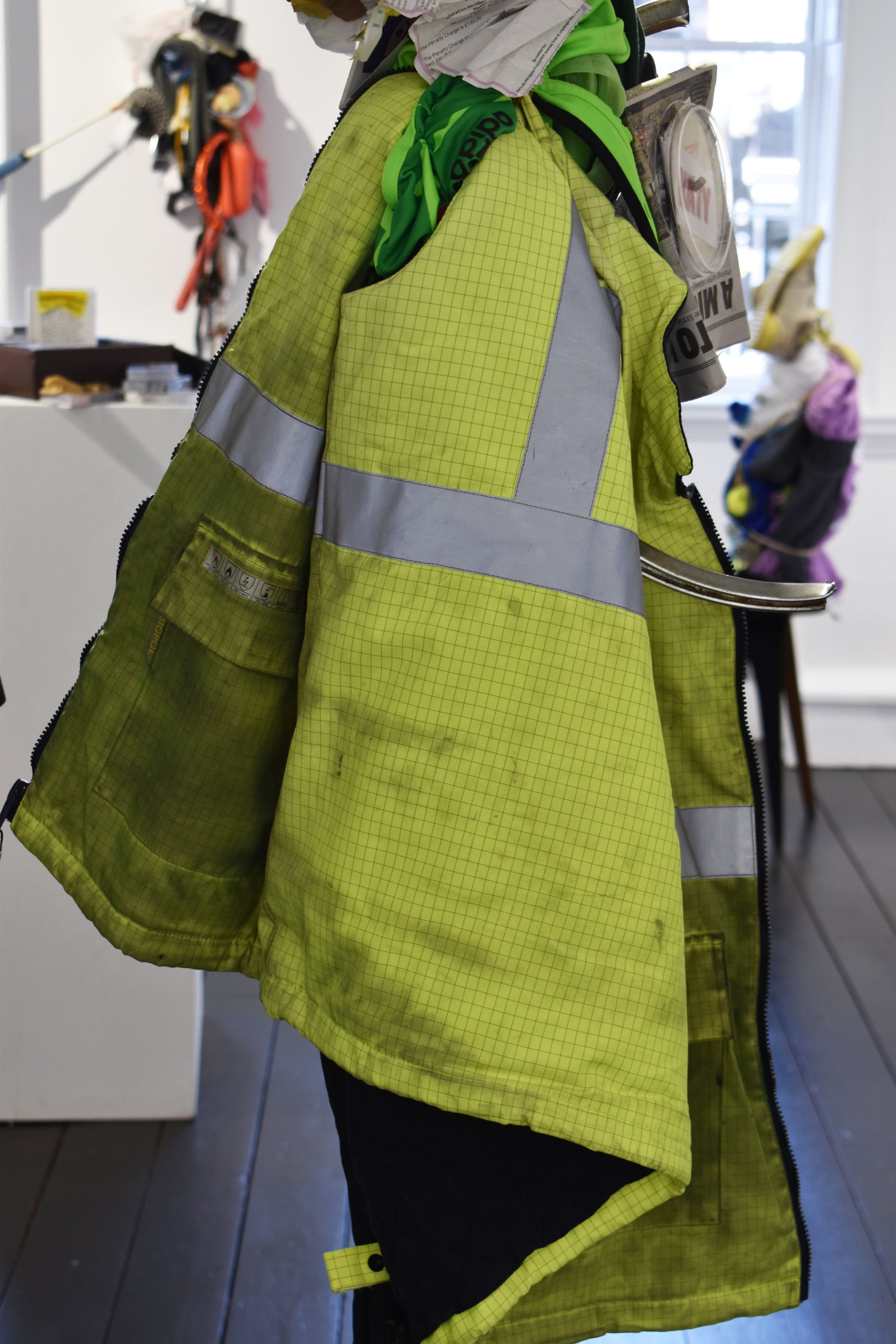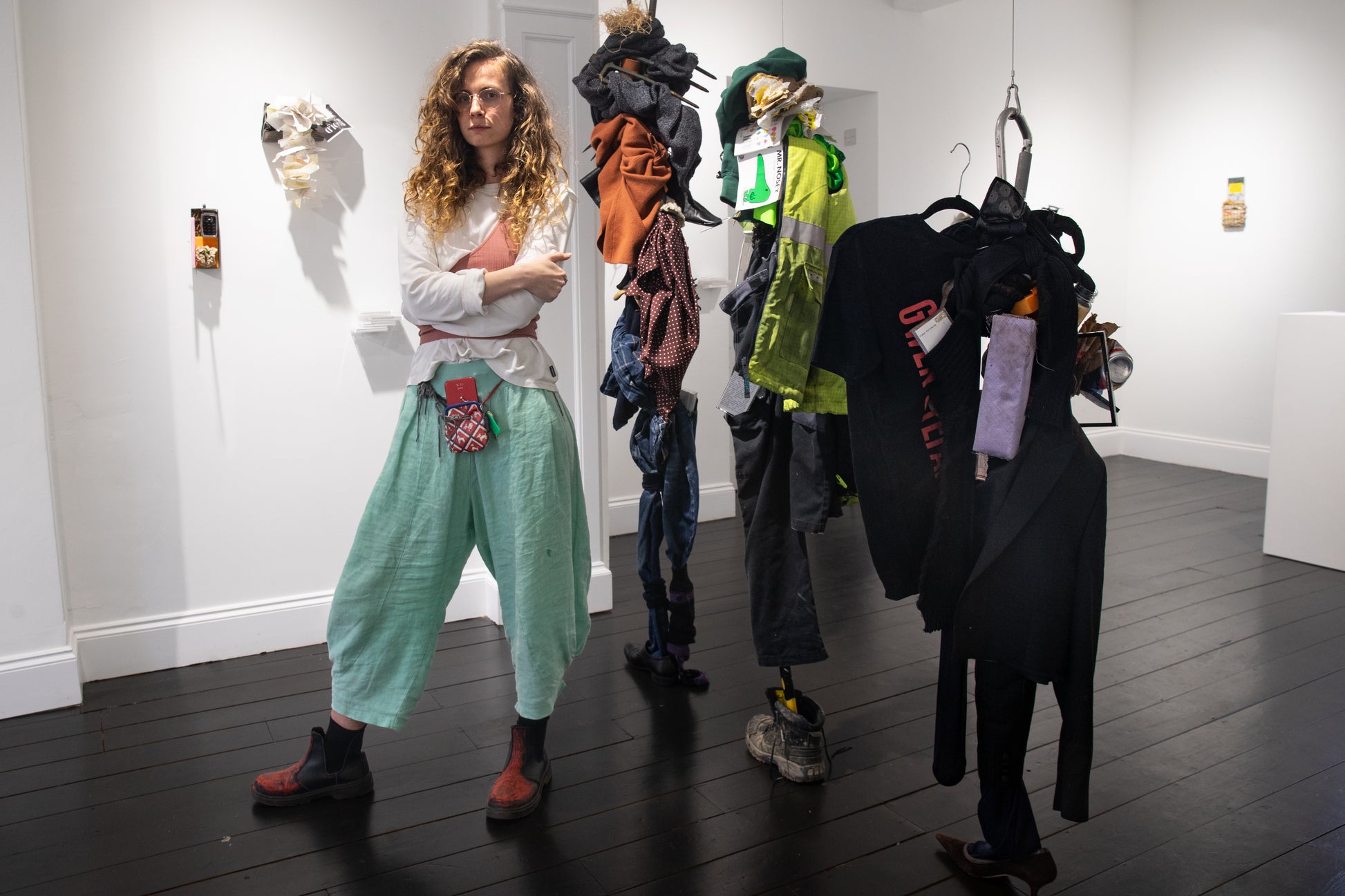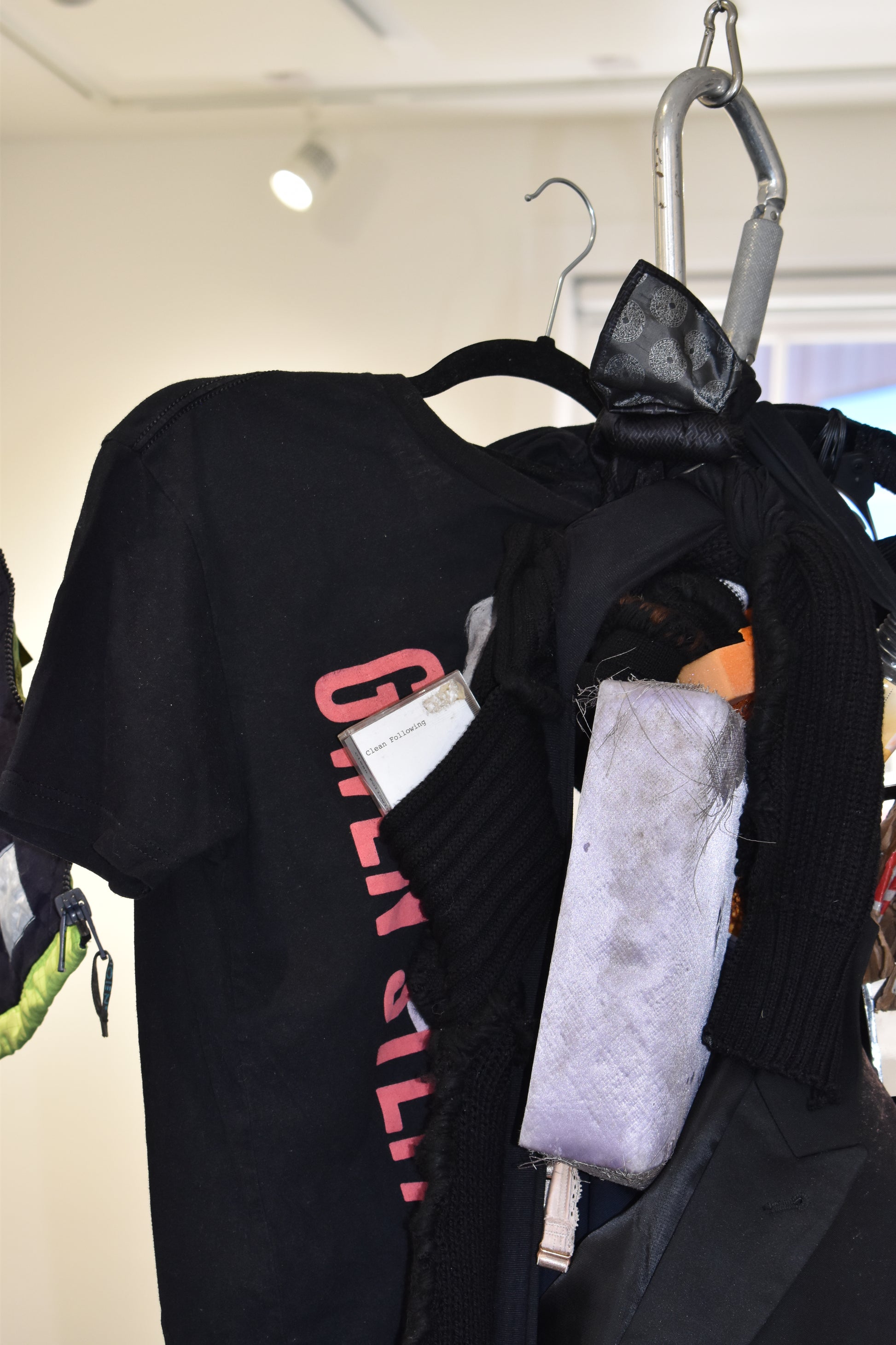 Sculpture split into 3 parts, modelled on the idea of 3 oversized keychains. Each piece is built from a large carabiner as the starting point. The textiles and objects are draped, stitched and woven together, inspired by the crafts often associated with putting together pieces of textiles to create wearable clothes. All 3 sculptures move downwards into a shoe; resembling the human figure, highlighting the sentience of waste and discarded objects.