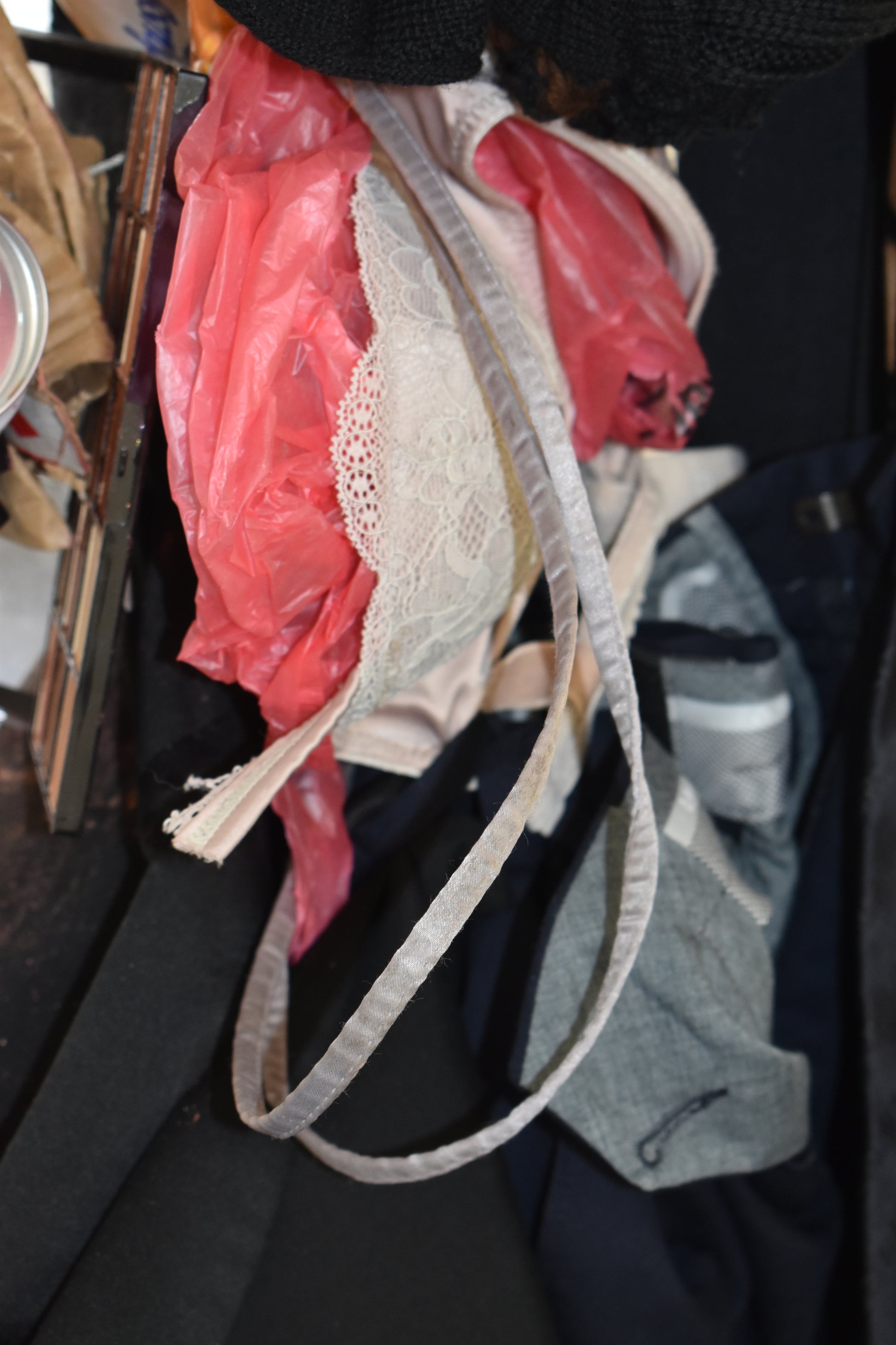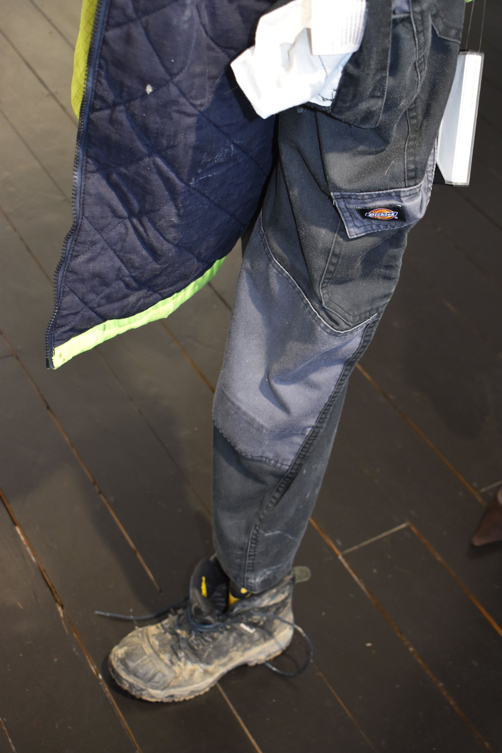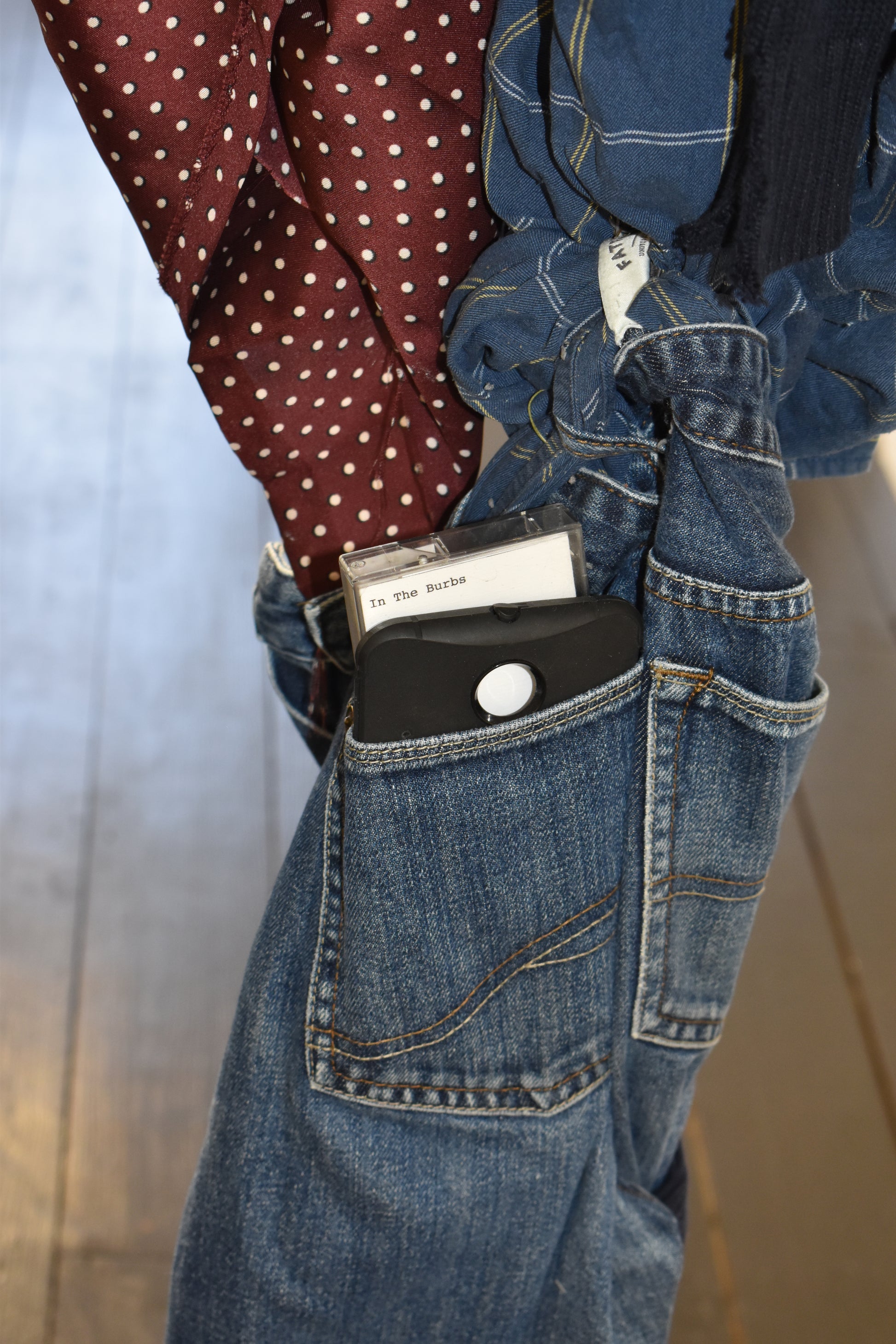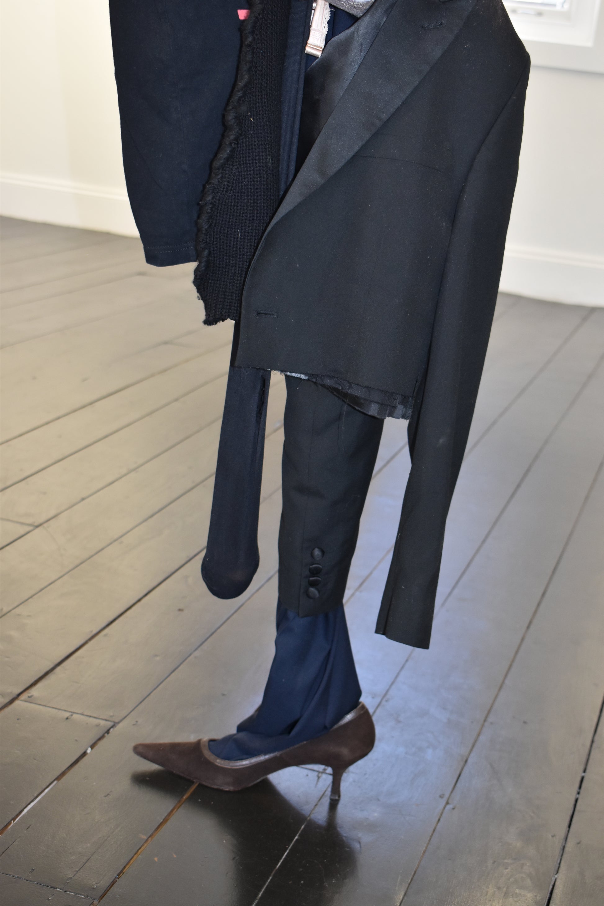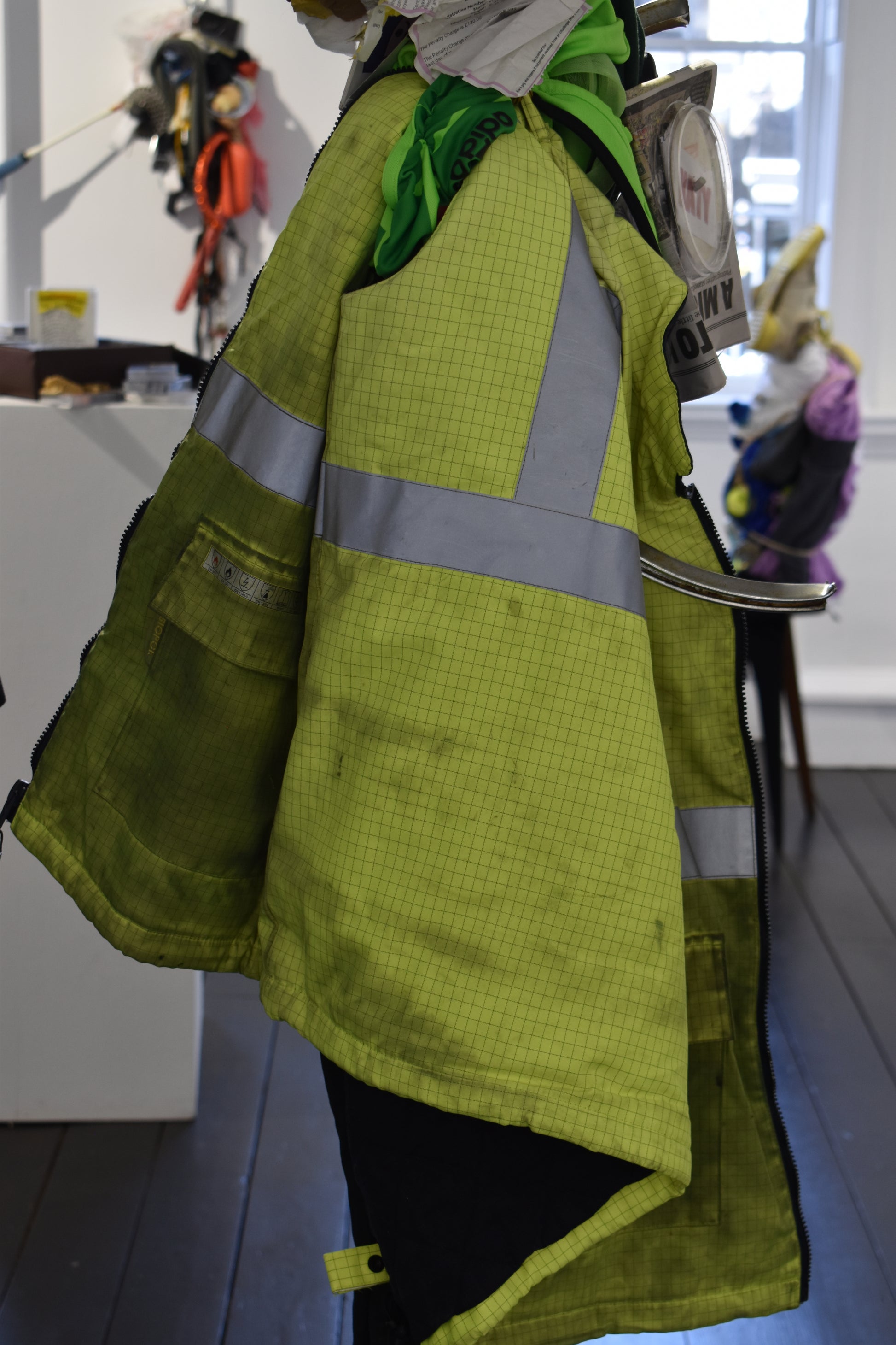 Sculpture split into 3 parts, modelled on the idea of 3 oversized keychains. Each piece is built from a large carabiner as the starting point. The textiles and objects are draped, stitched and woven together, inspired by the crafts often associated with putting together pieces of textiles to create wearable clothes. All 3 sculptures move downwards into a shoe; resembling the human figure, highlighting the sentience of waste and discarded objects.