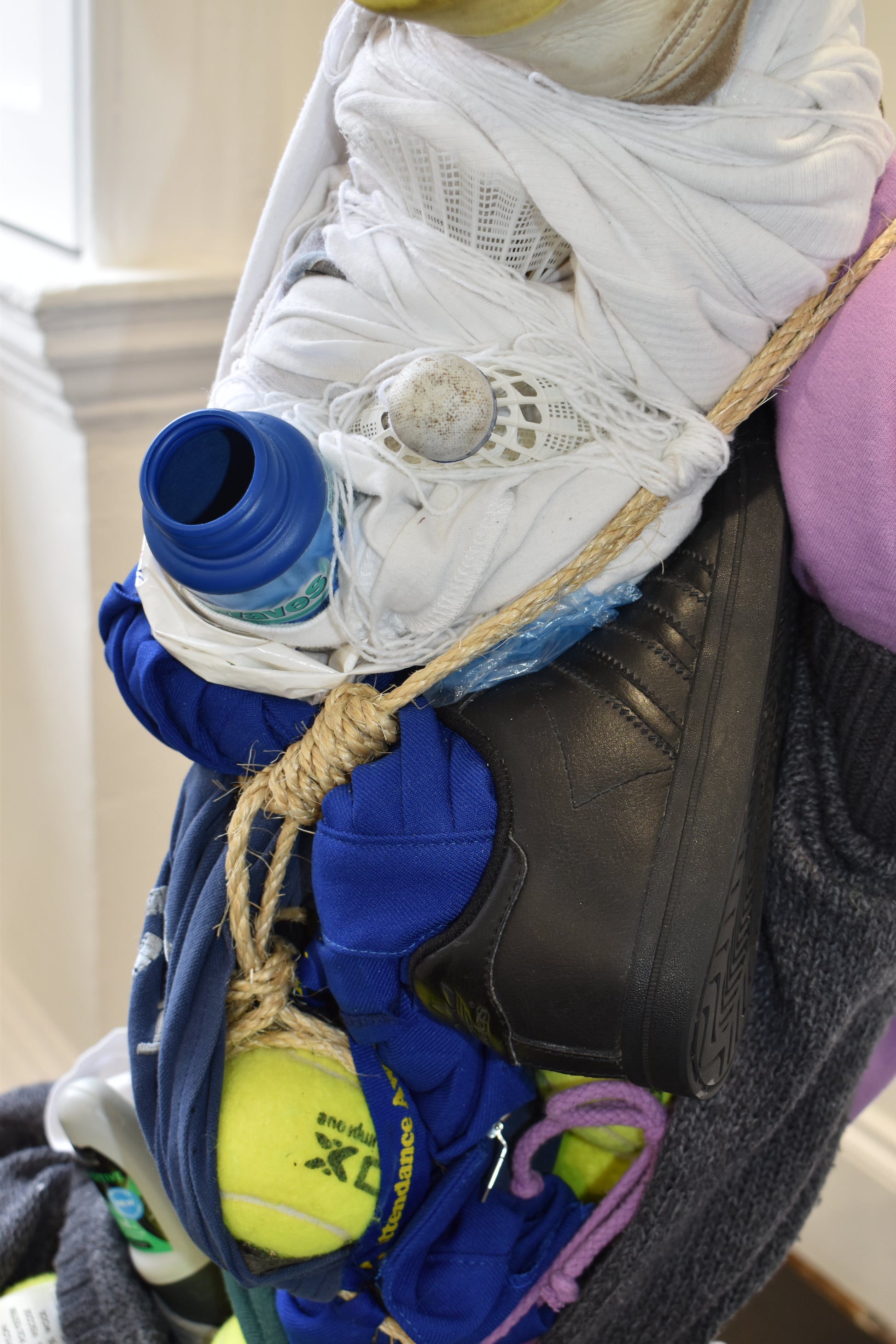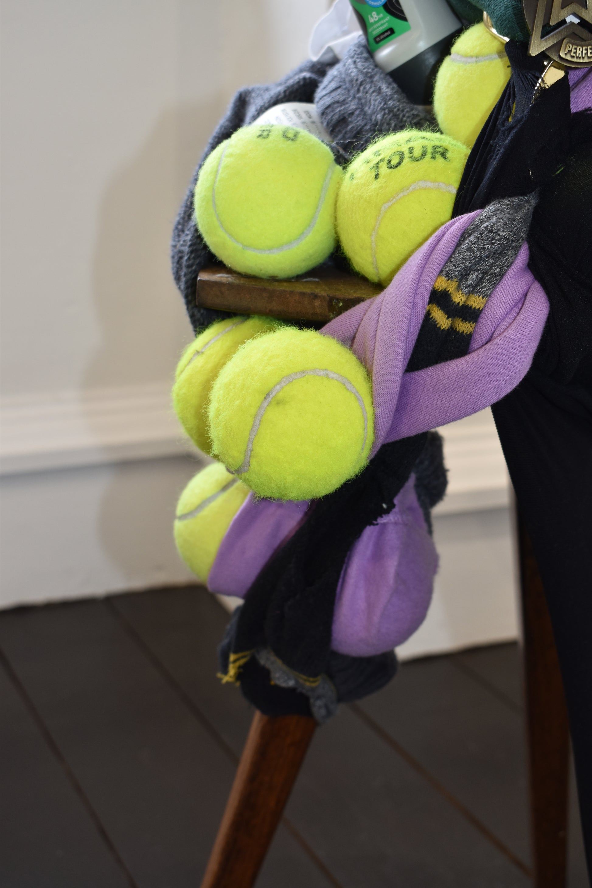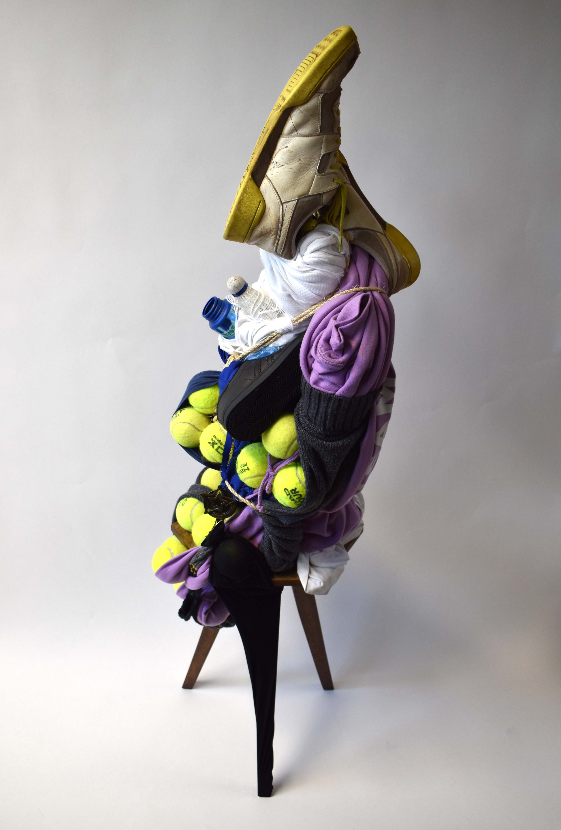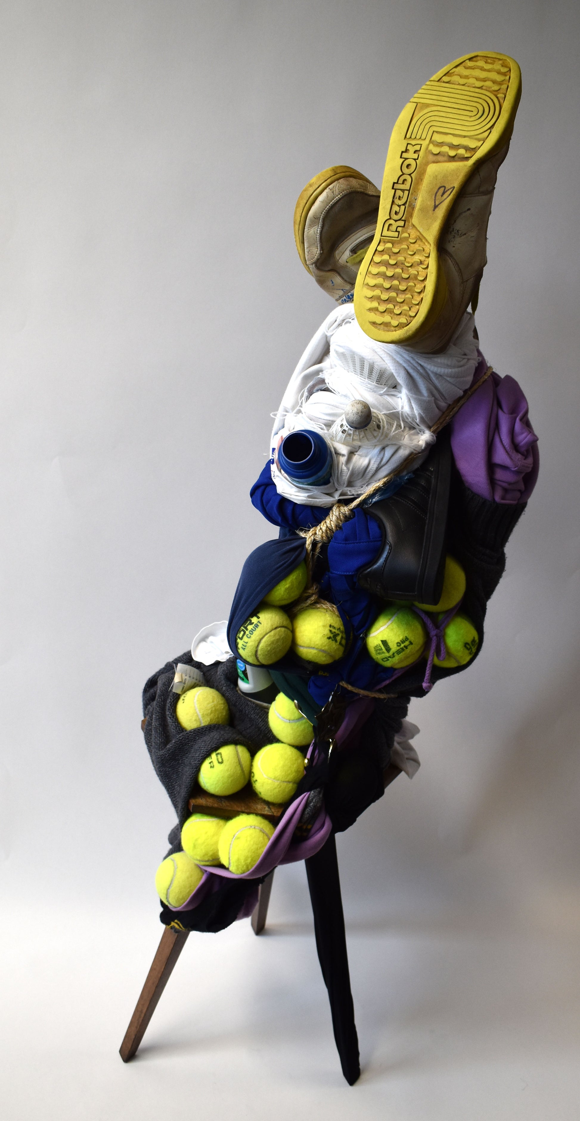 Materials and objects have been assembled onto a wooden stool structure using textile and carpentry techniques; materials and objects including textiles, tennis balls, wood, rope, plastic and leather shoes.