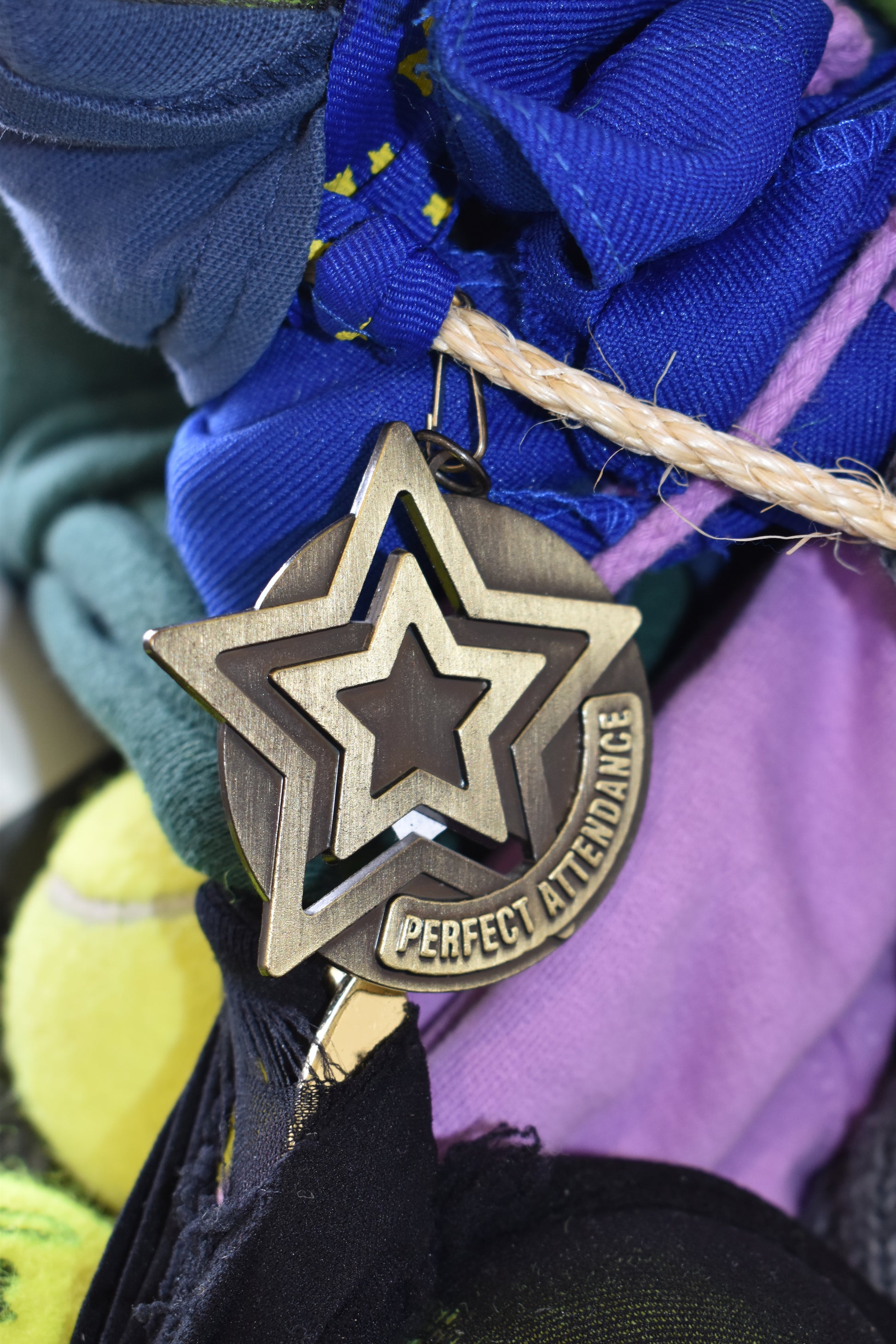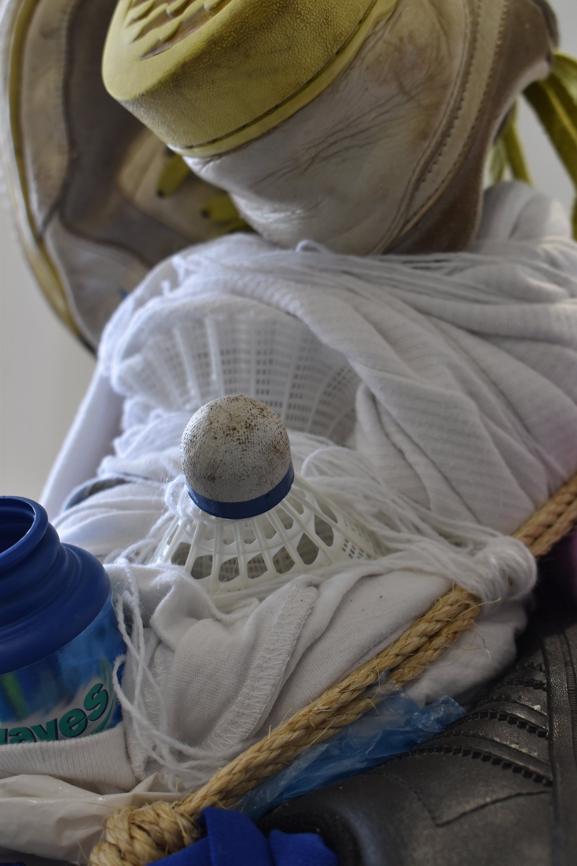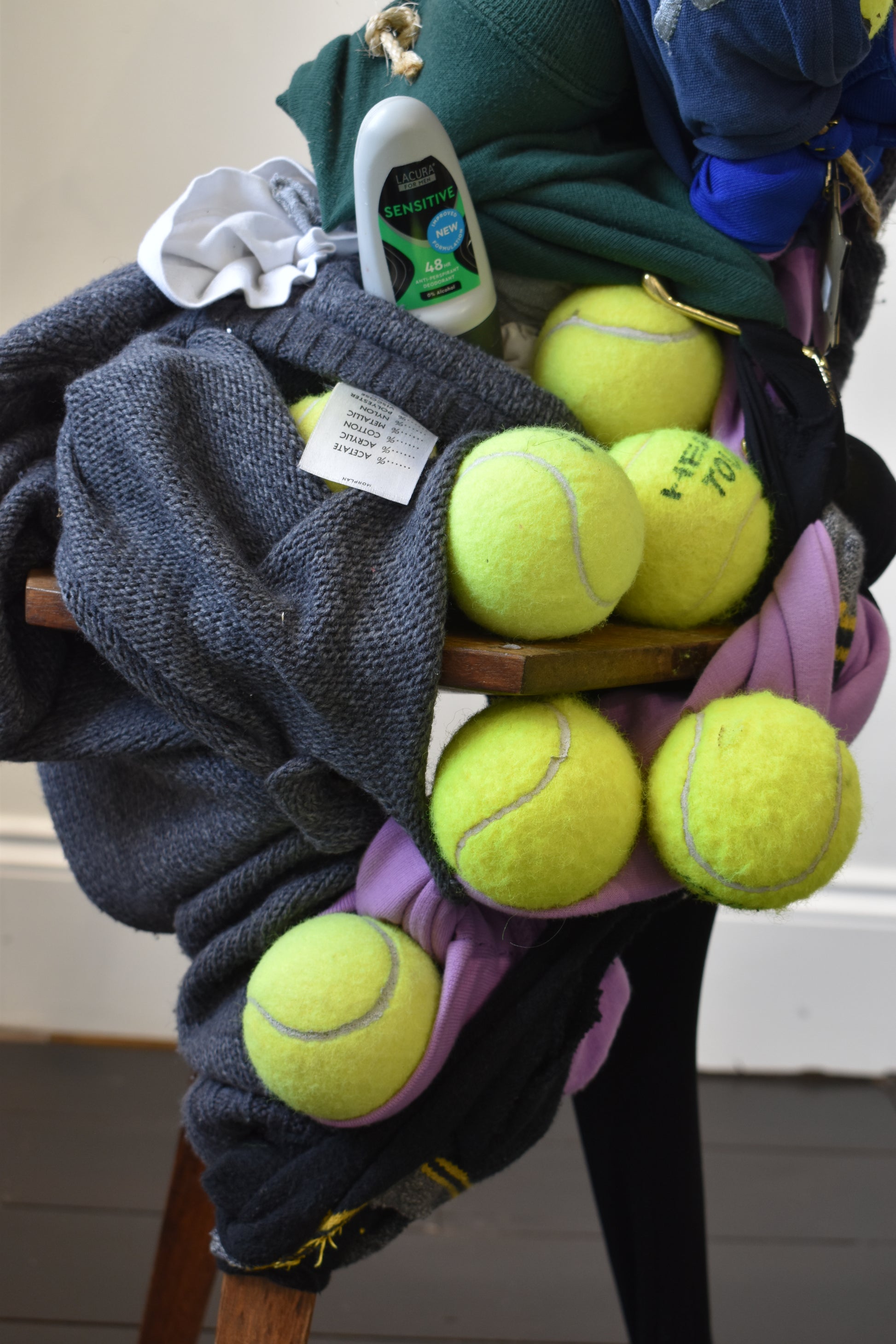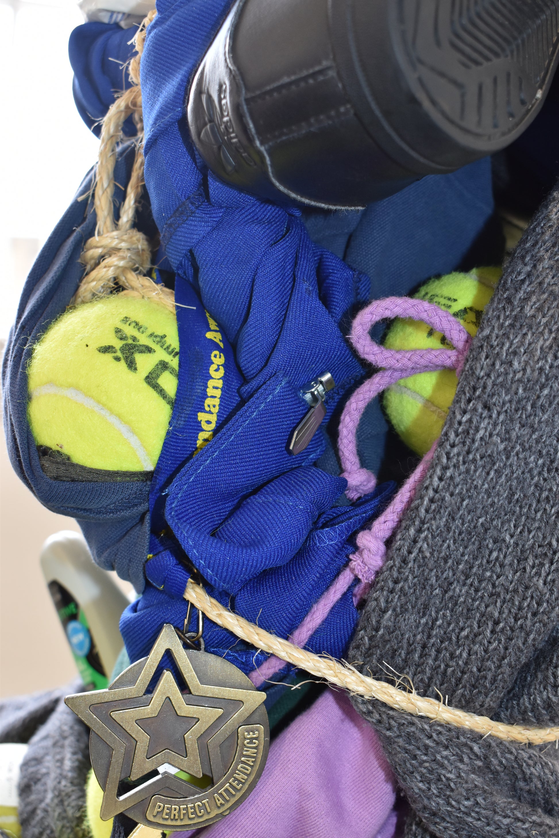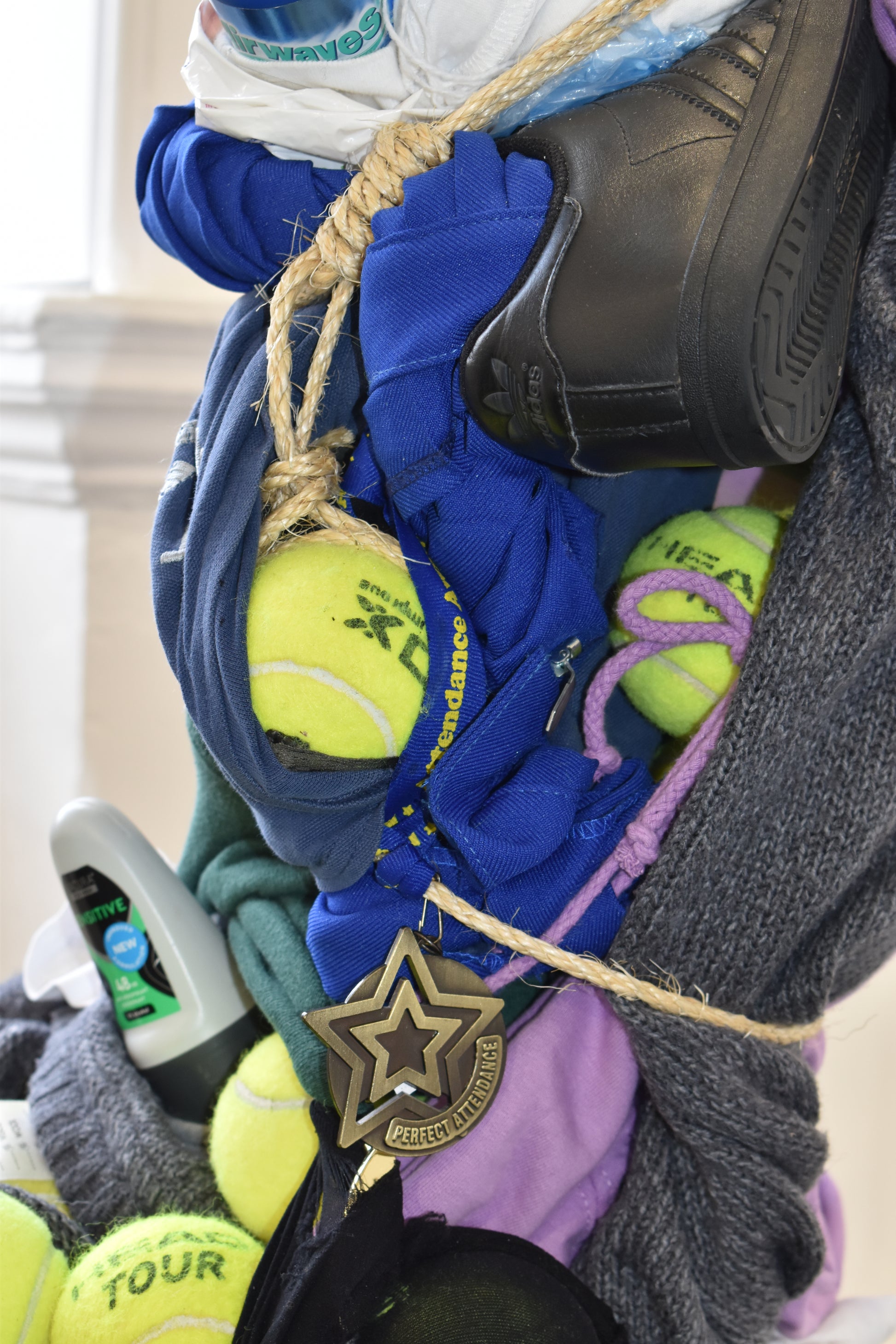 Materials and objects have been assembled onto a wooden stool structure using textile and carpentry techniques; materials and objects including textiles, tennis balls, wood, rope, plastic and leather shoes.