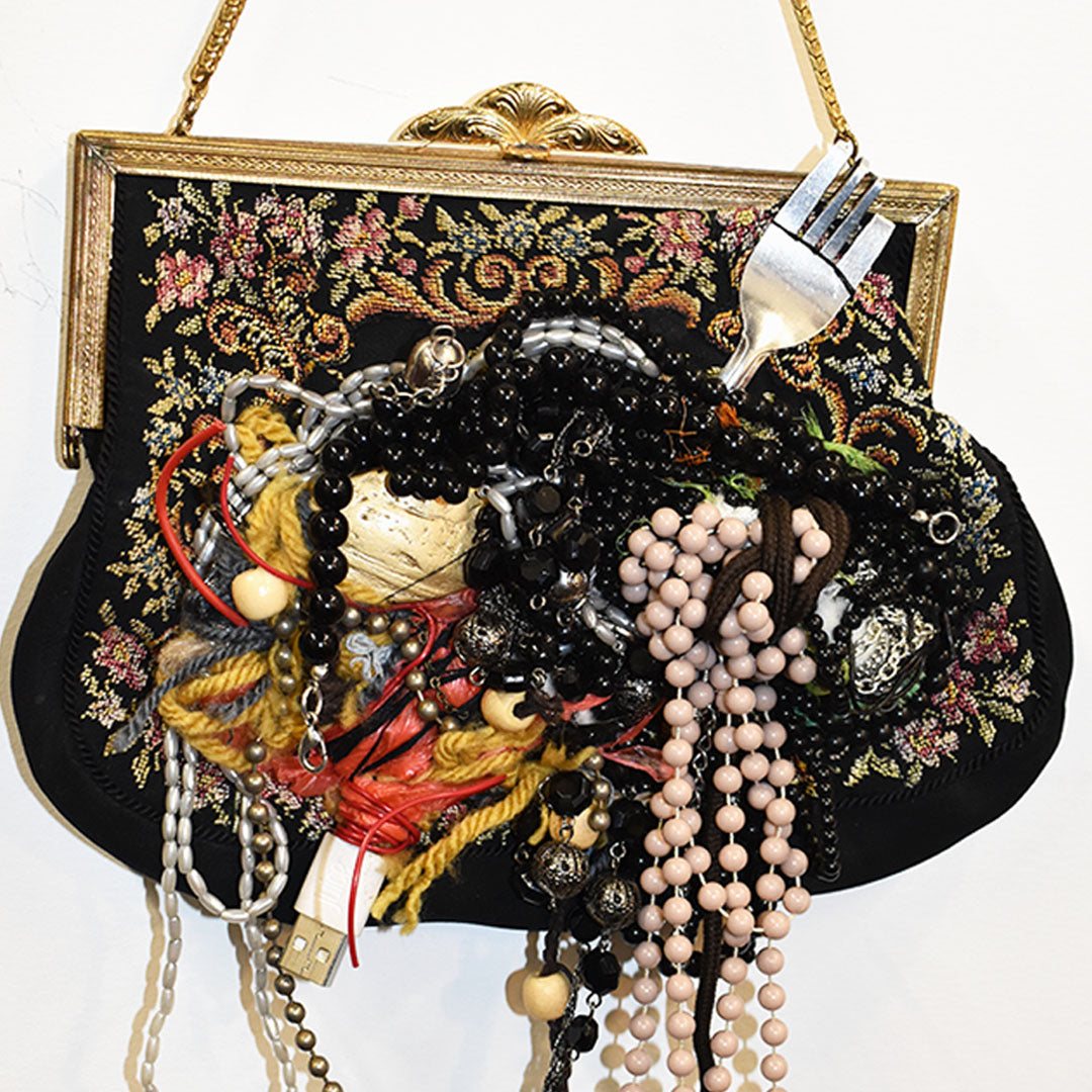 Embellished using electronic wires, jewellery, textiles, plastic bag, USB and metal fork.