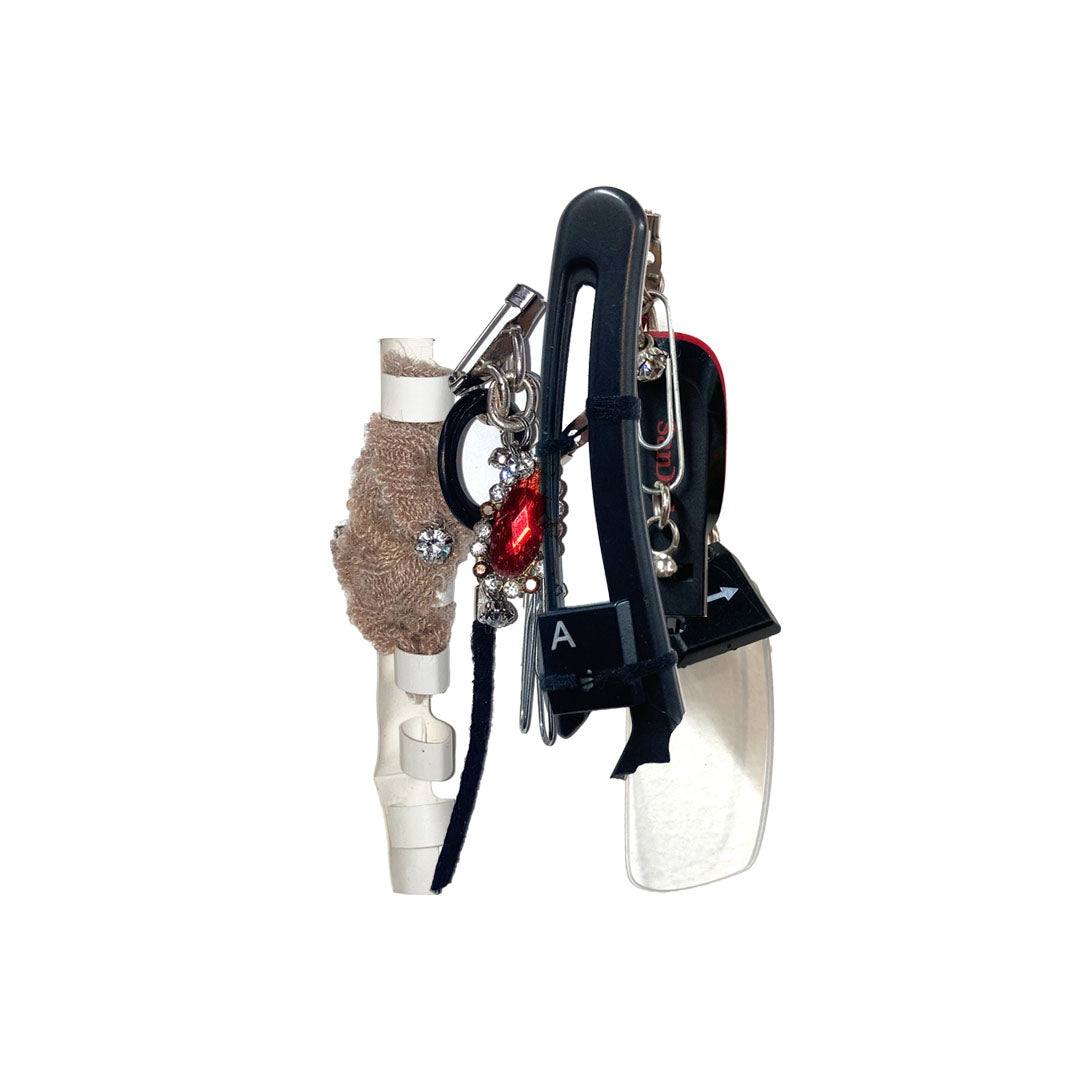 Materials include keyboard keys, up cycled stationary objects, jewellery, trinkets and textiles. All brooches have a metal brooch pin attached to the back.