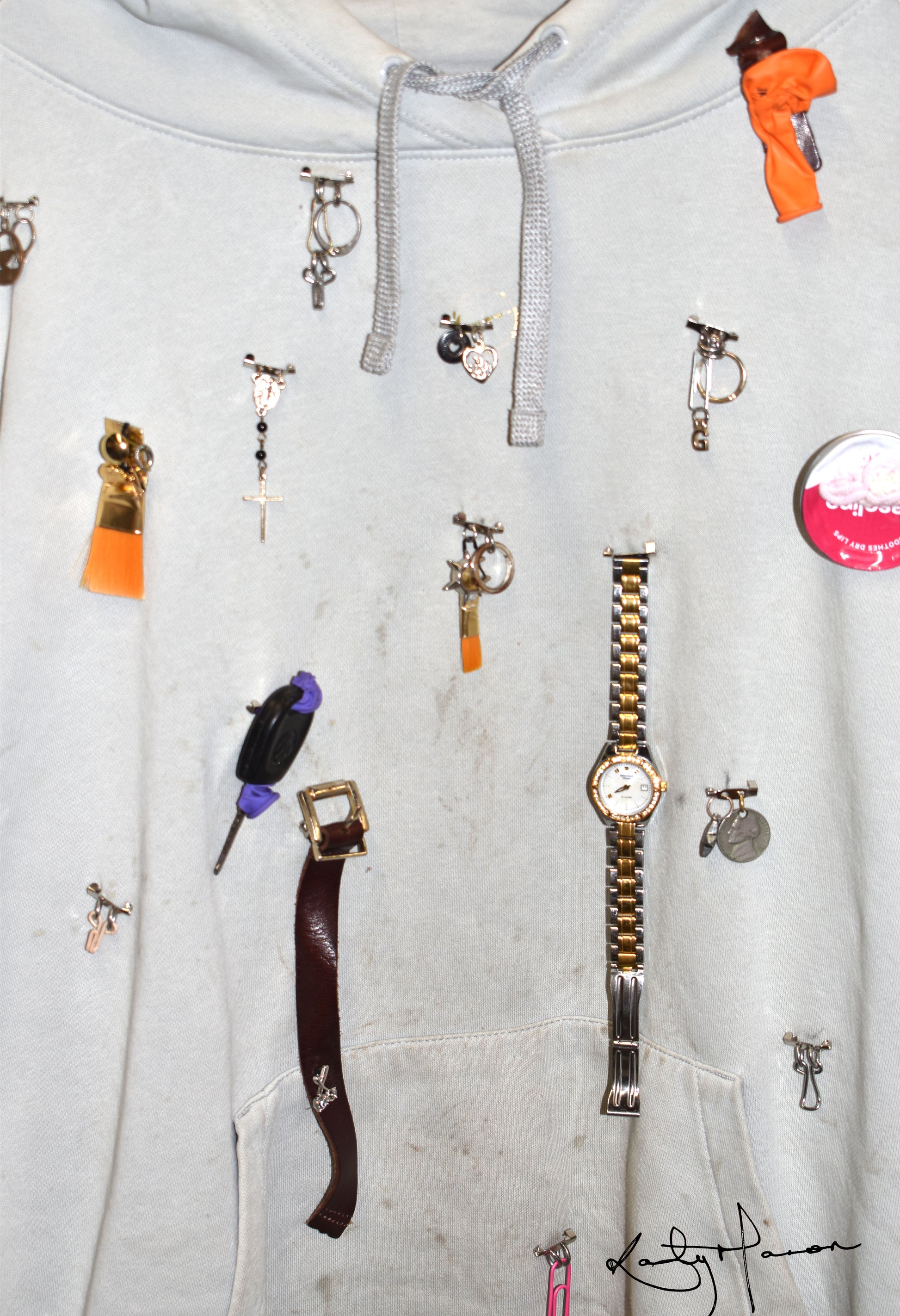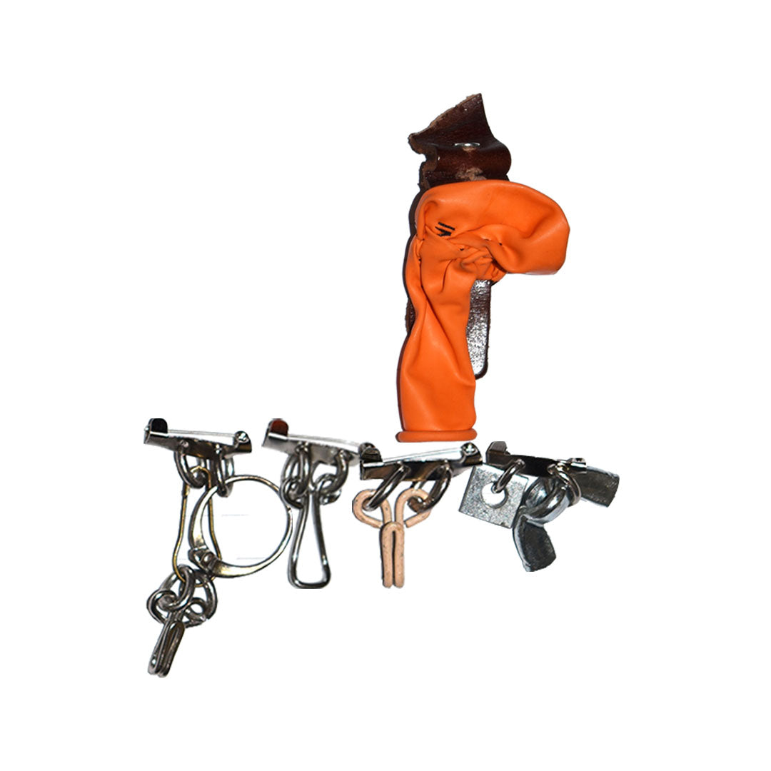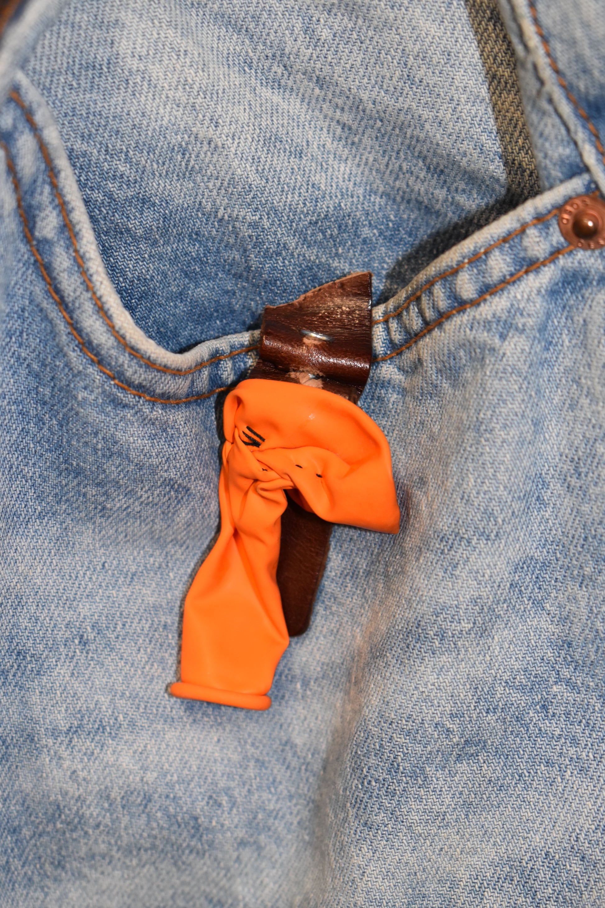 Materials include balloon, leather, metal textile fastenings and hardware. All brooches have a metal brooch pin attached to the back.