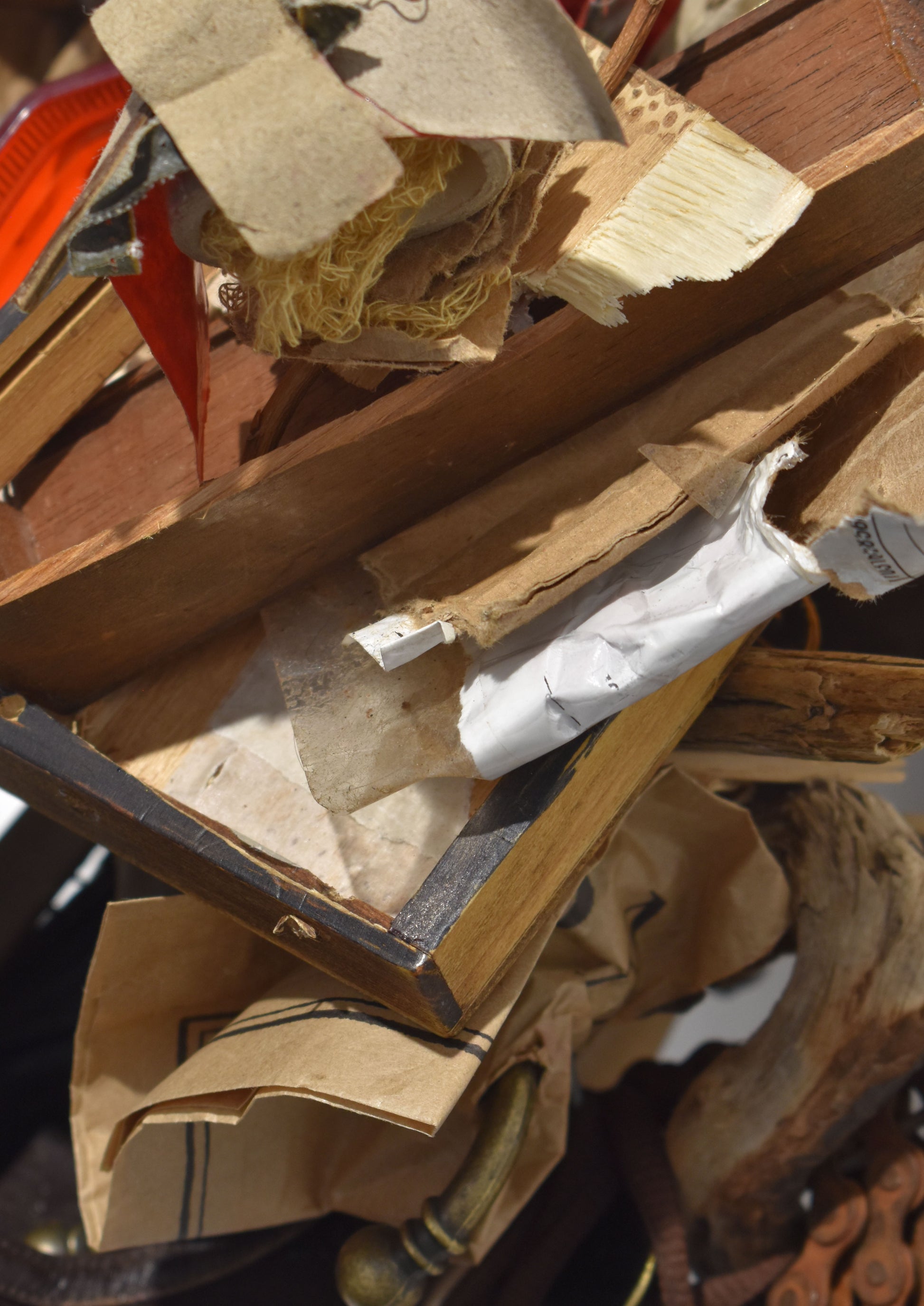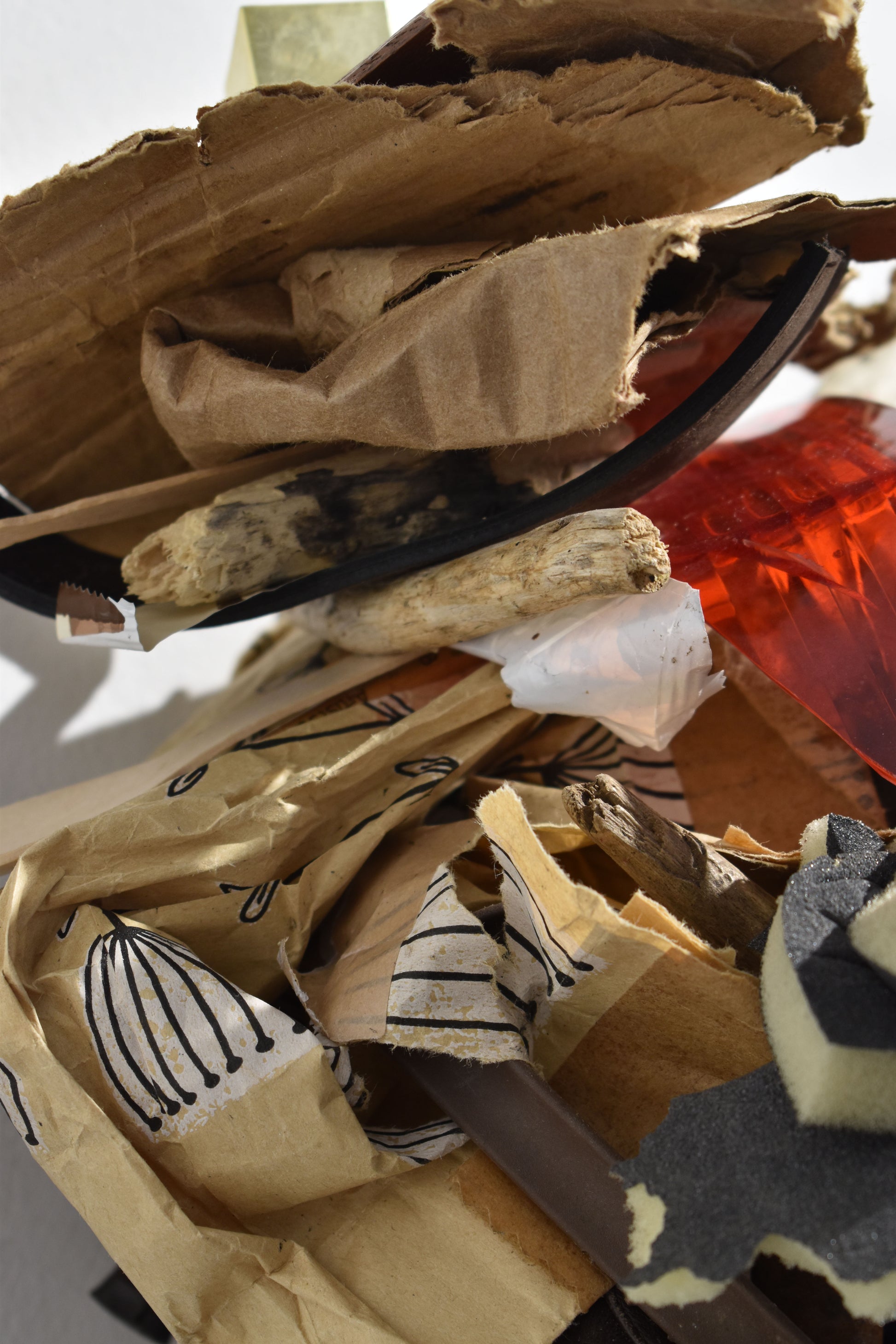 'Materials that we scoop up screw up, imprint with our day; stress excitement…out of breath…stuff we force into neat exploding piles trying to make it all fit when it won’t it just spills out. Resurfacing like plastic weeds. The insignificance of that Toss was so memorised we barely acknowledged it…grapes in plastic coffee cup train ticket button empty toothpaste tube receipt washing up liquid milk bottle cap…Random uninvited guests crawling into our pockets, skulking in corners, under our feet. Plastic woodland meditations; looking, staring, obsessing over the textured bark of the cardboard, the soft mouth like folds howling amongst the pile…the impact of the agonising noise the creatures overlooked are making but only when you listen.'