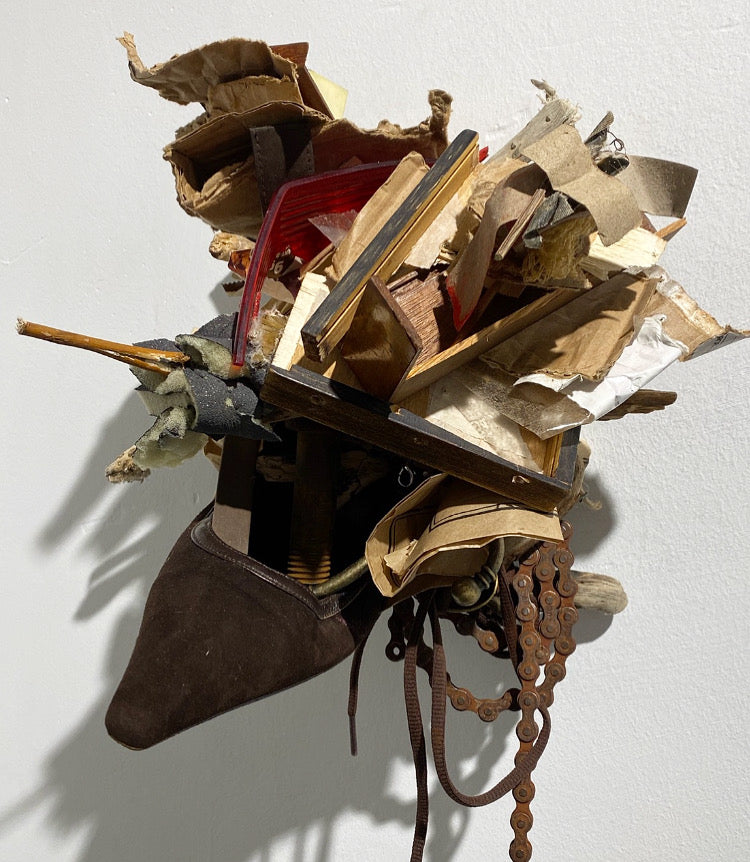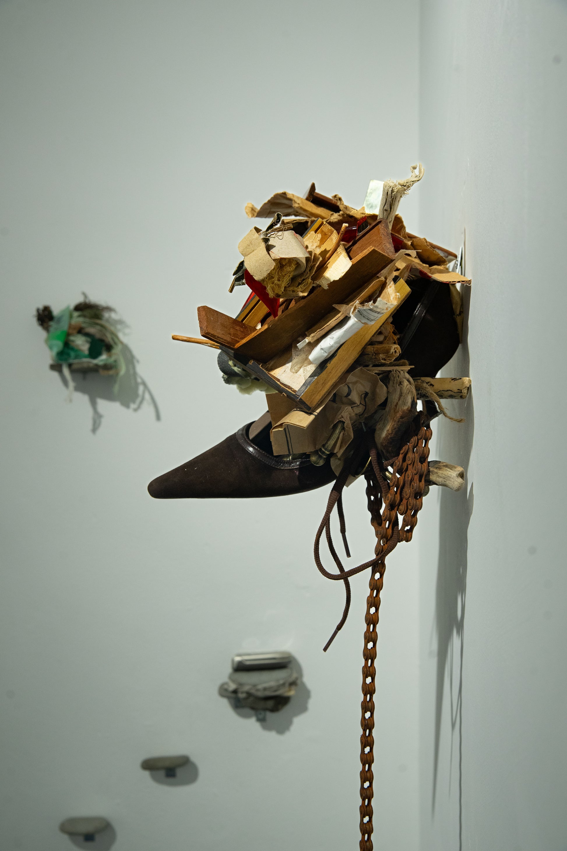 This piece is assembled using a suede leather shoe as the base and is built up with cardboard, wood, iron, plastic textile and metal bike chain; assembled using wood screws and textile stitching techniques.