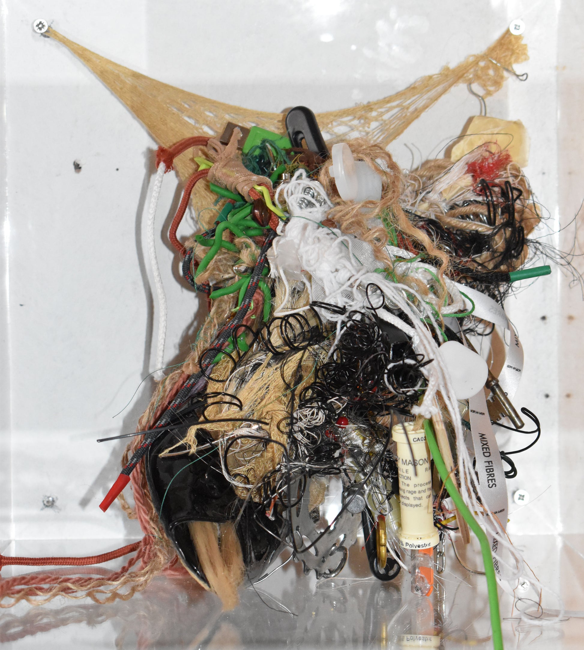 This piece is assembled using a leather heeled shoe as the base structure. Built on top are materials such as wool, thread, leather, wire, artificial hair, net, shoe lace, ribbon and rubber. All materials and objects are assembled together using textile and stitching techniques.